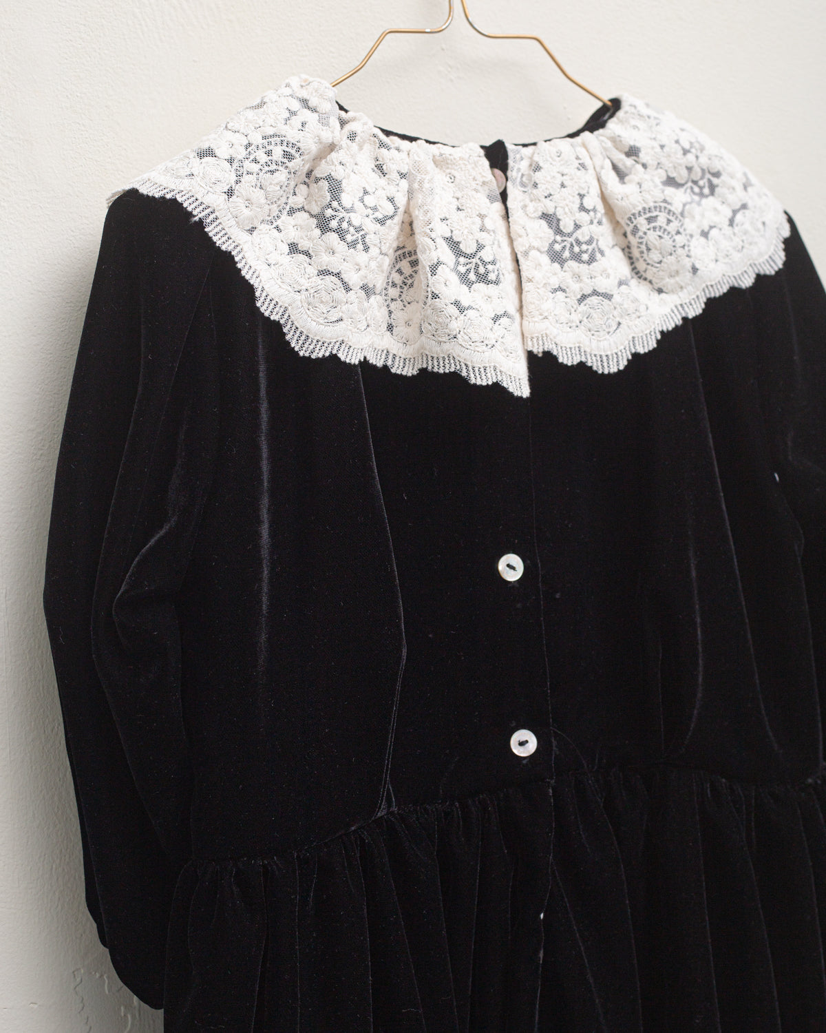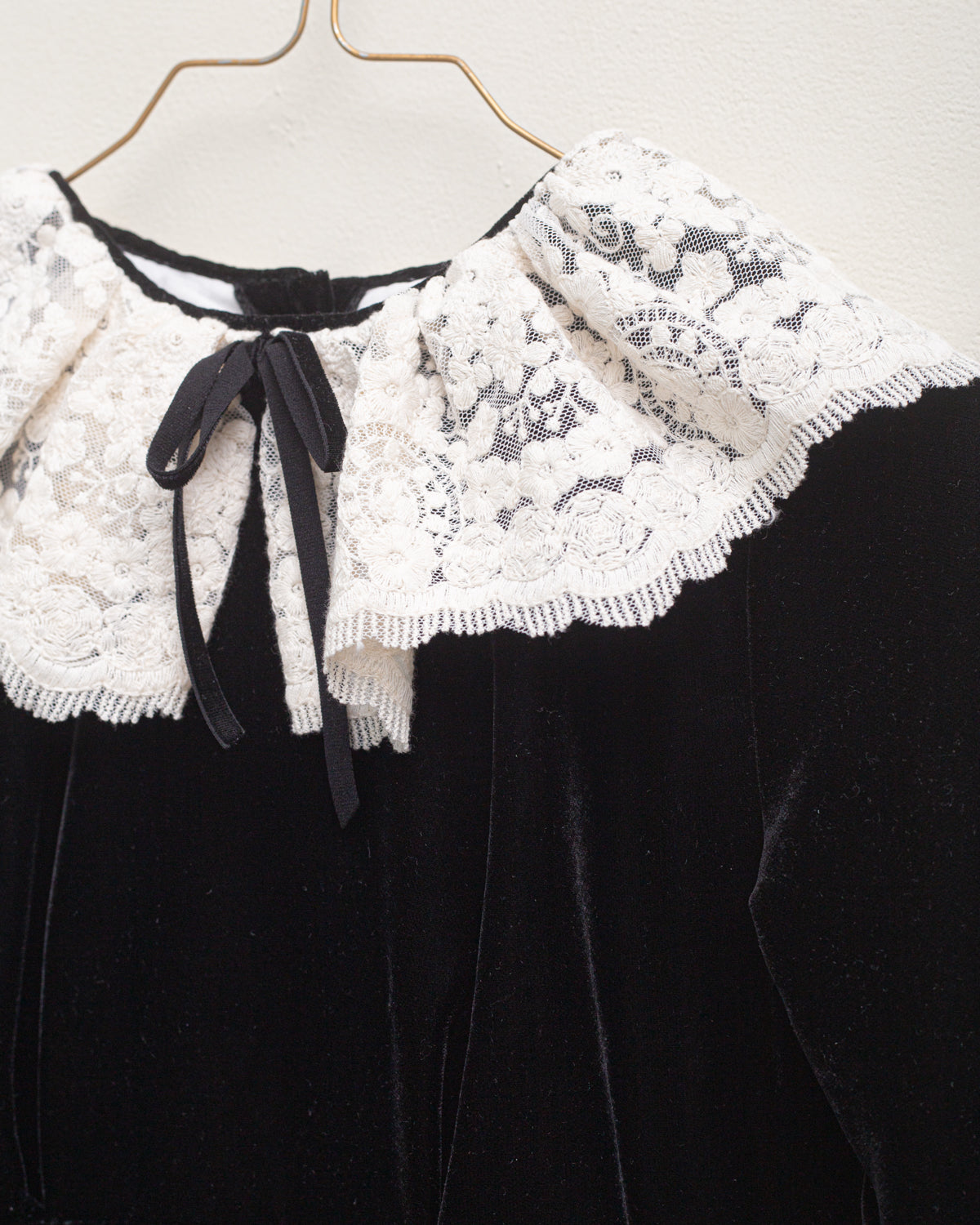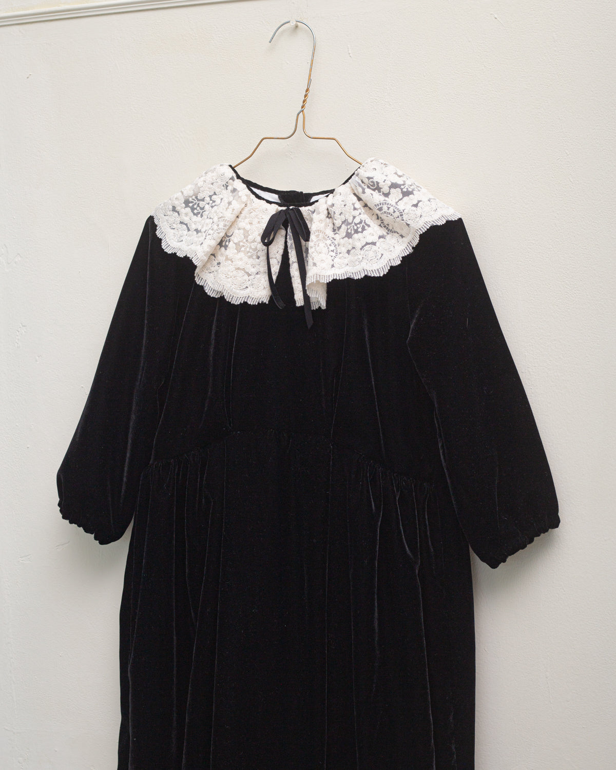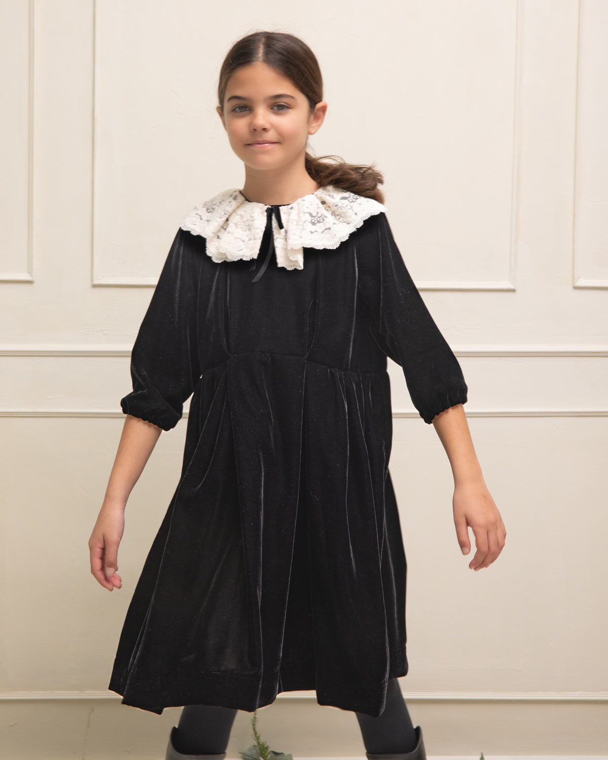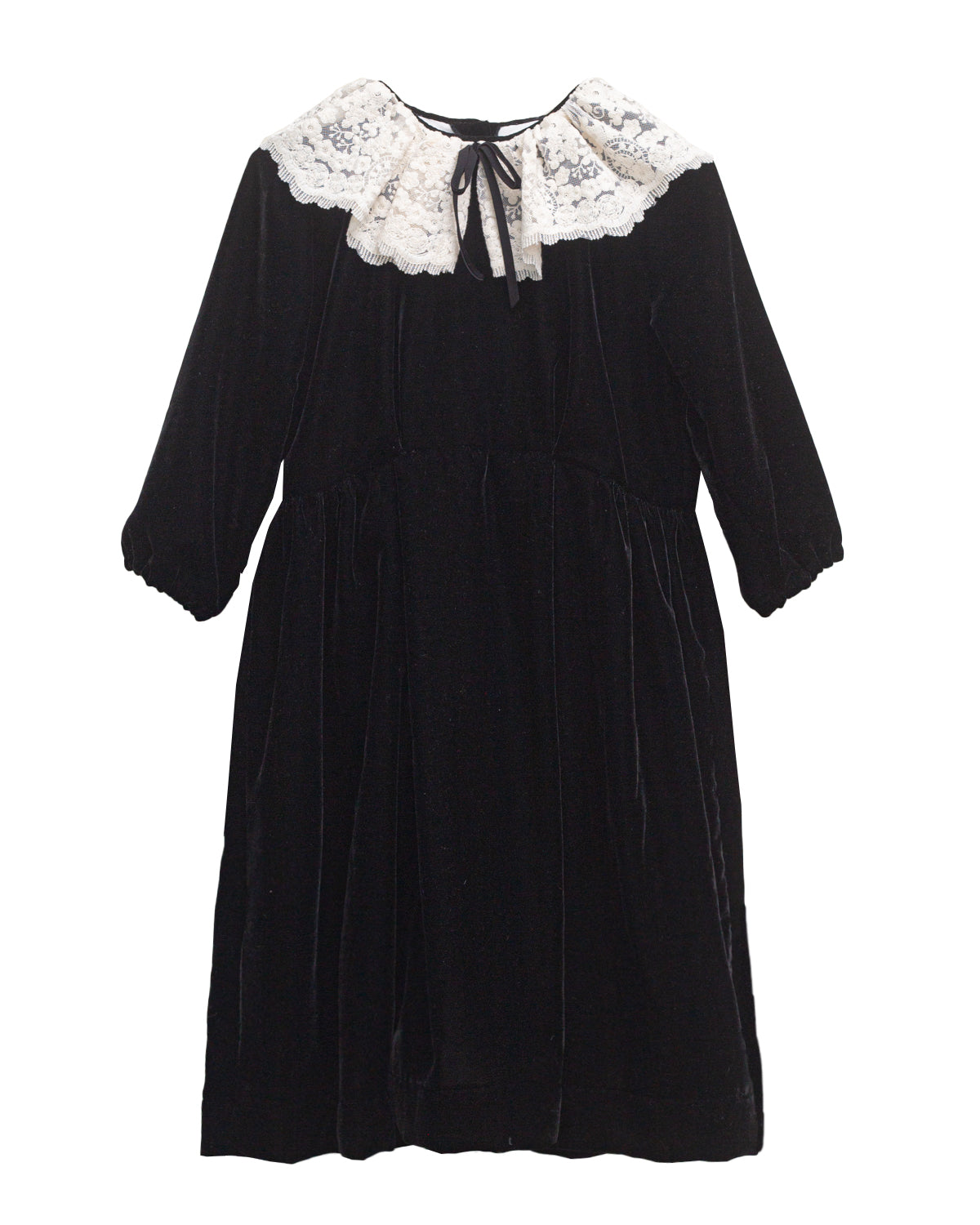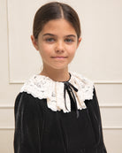 Vestido súper especial en terciopelo negro con mucha caída. Corte amplio alto de talle y gran cuello de encaje de algodón a contraste. Perfecto para una ocasión especial, una fiesta o invitada.