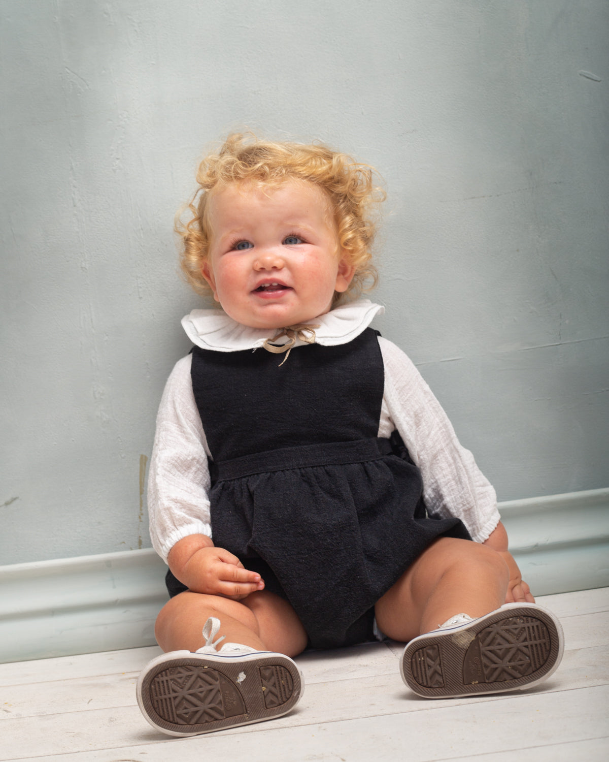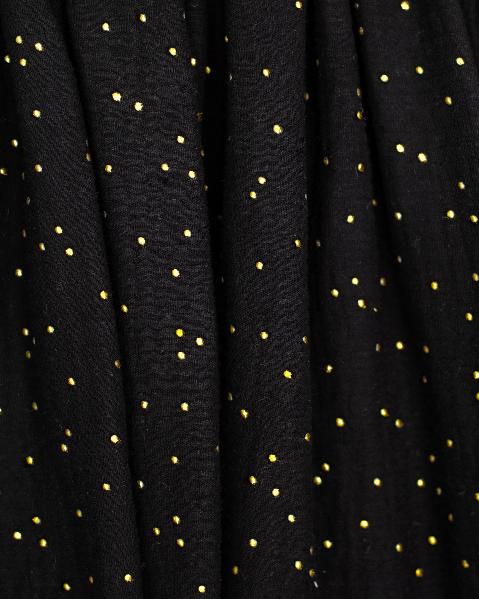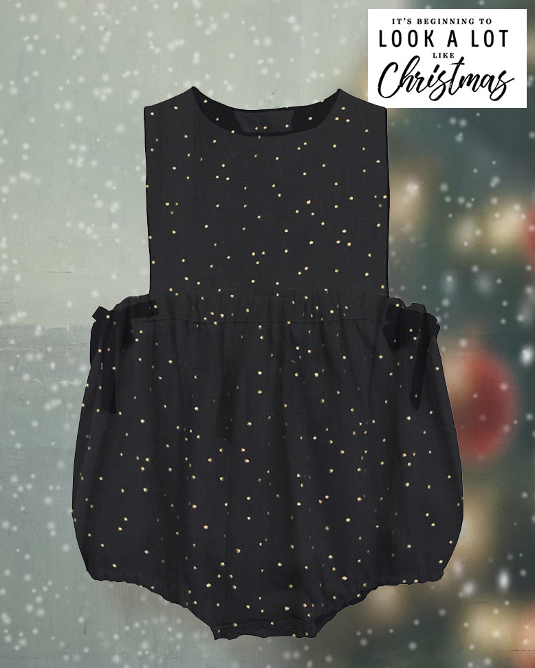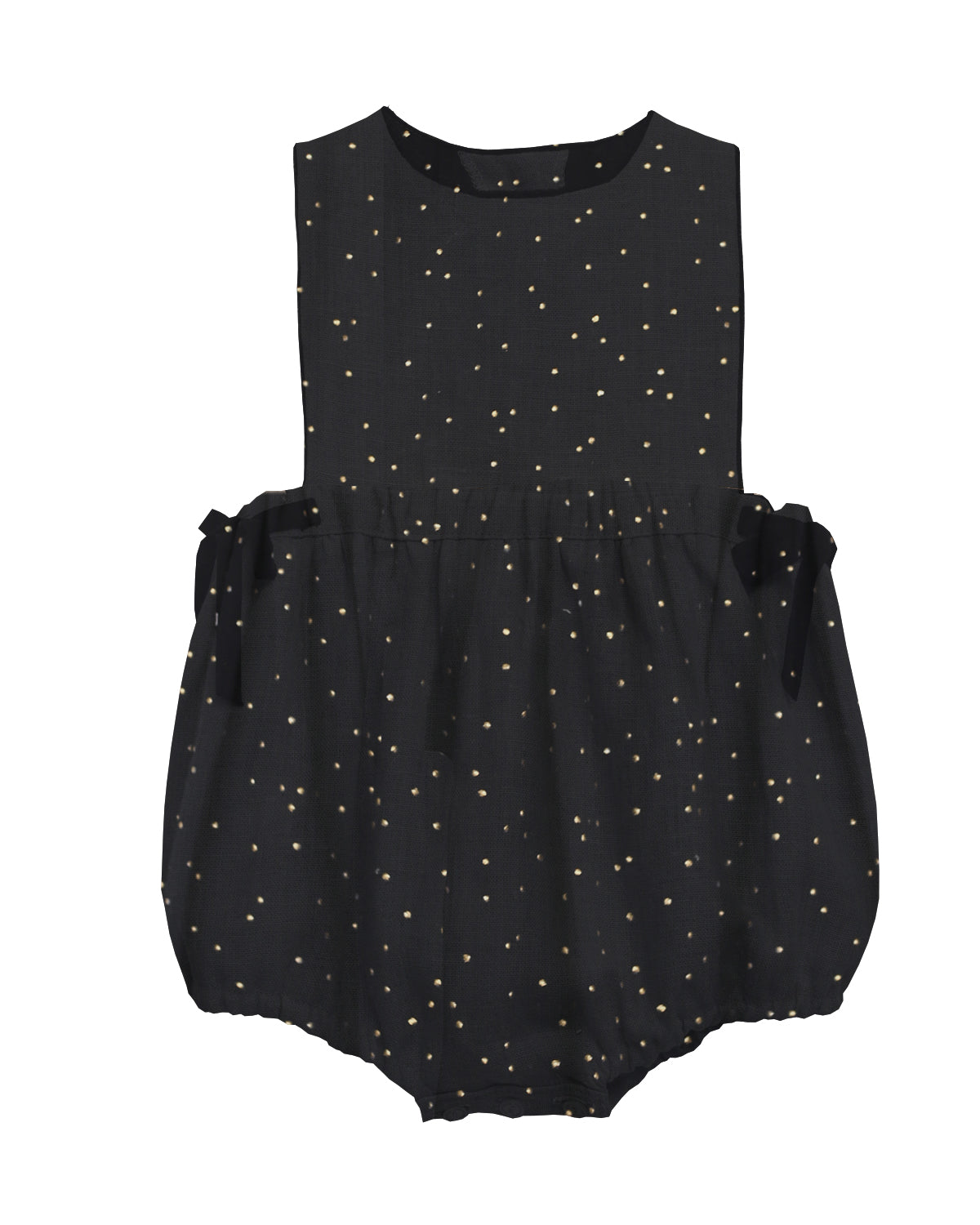 Beautiful pinafore romper made in black double gauze cotton with gold dots printed. Button back and black bows on waits. Perfect for a vintage look.
