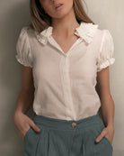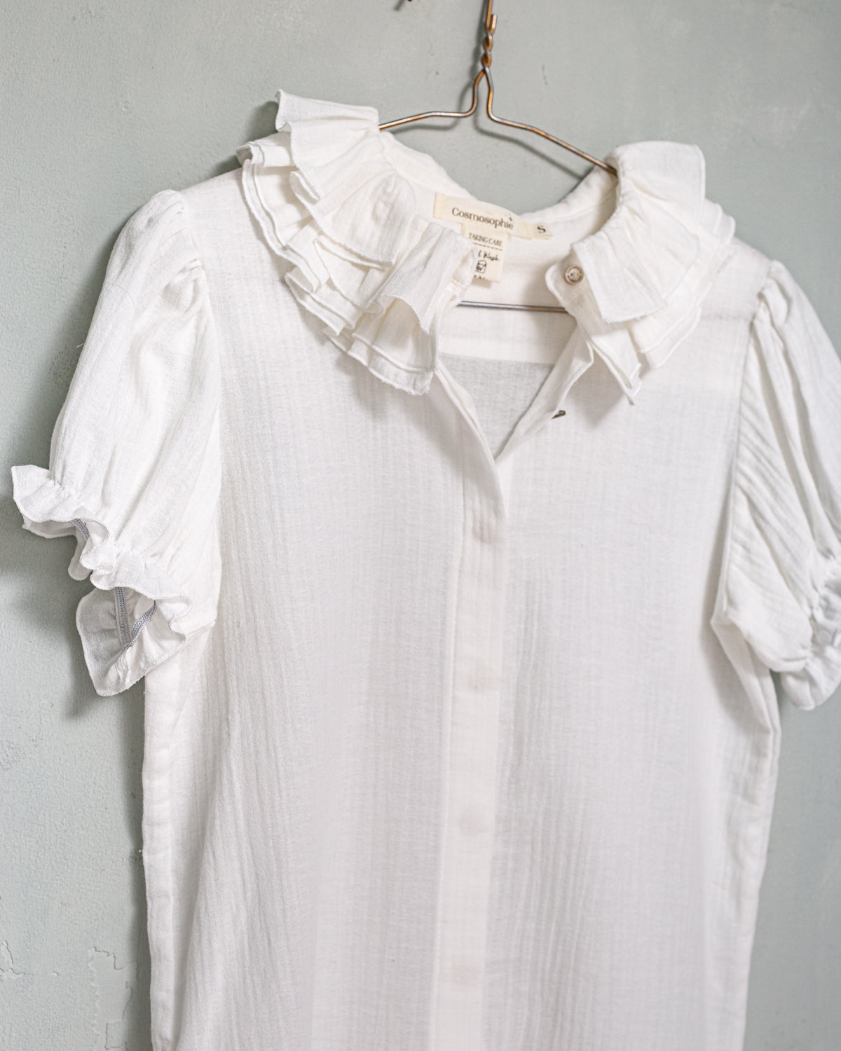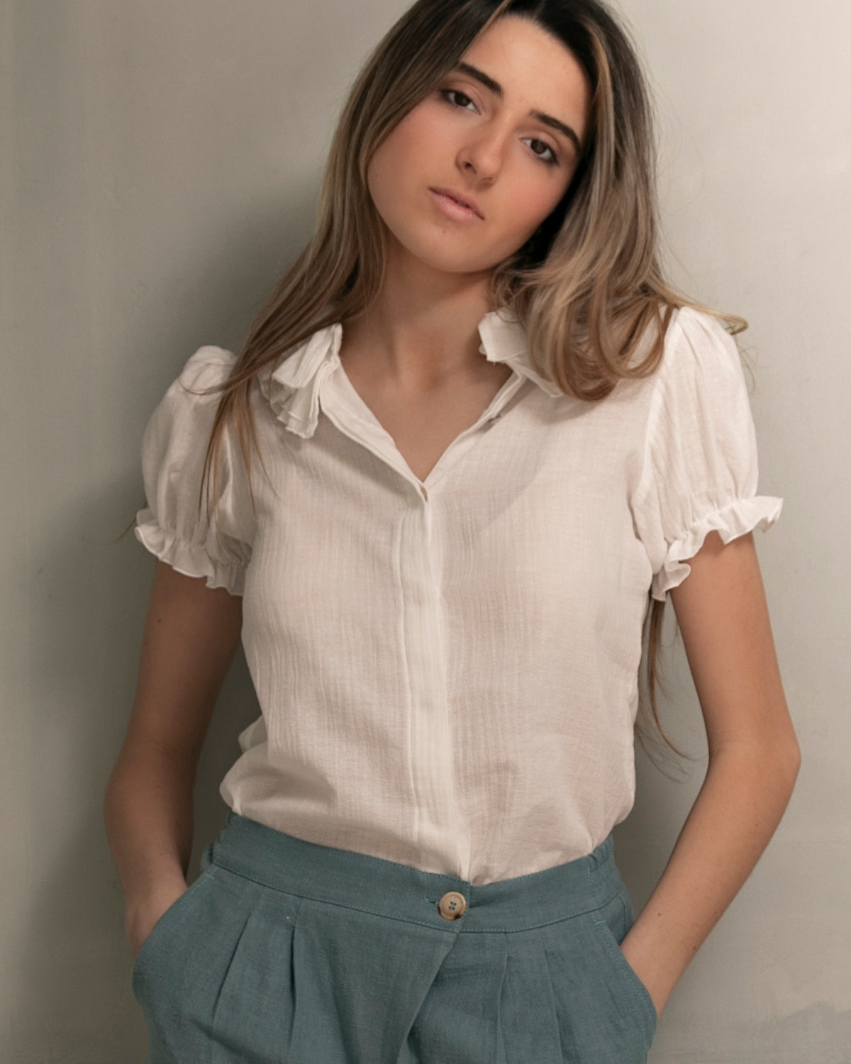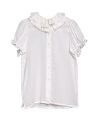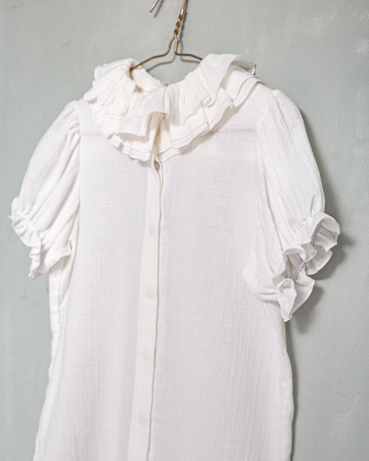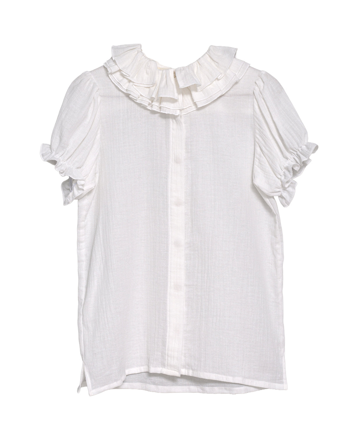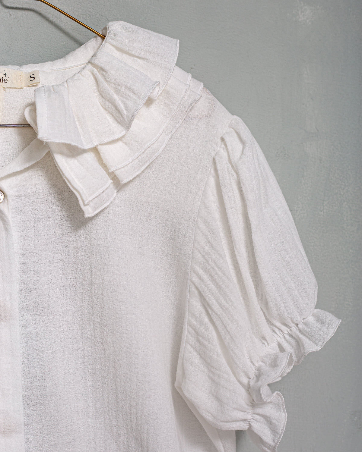 Vintage-inspired blouse crafted from soft cotton. Featuring short puff sleeves and a front button fastening concealed under a placket. You will love its beautiful three-layer ruffled collar. Off-white colour.
