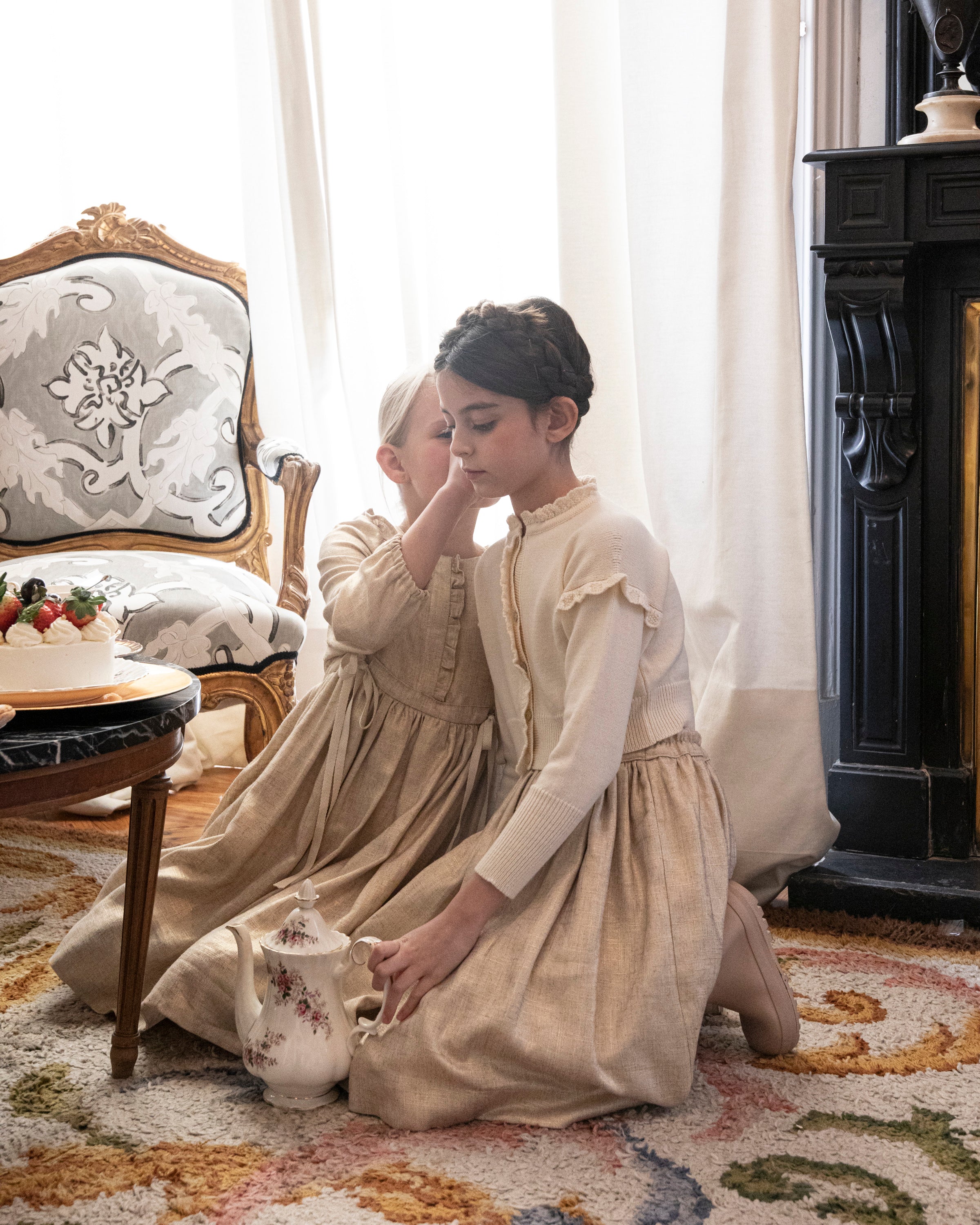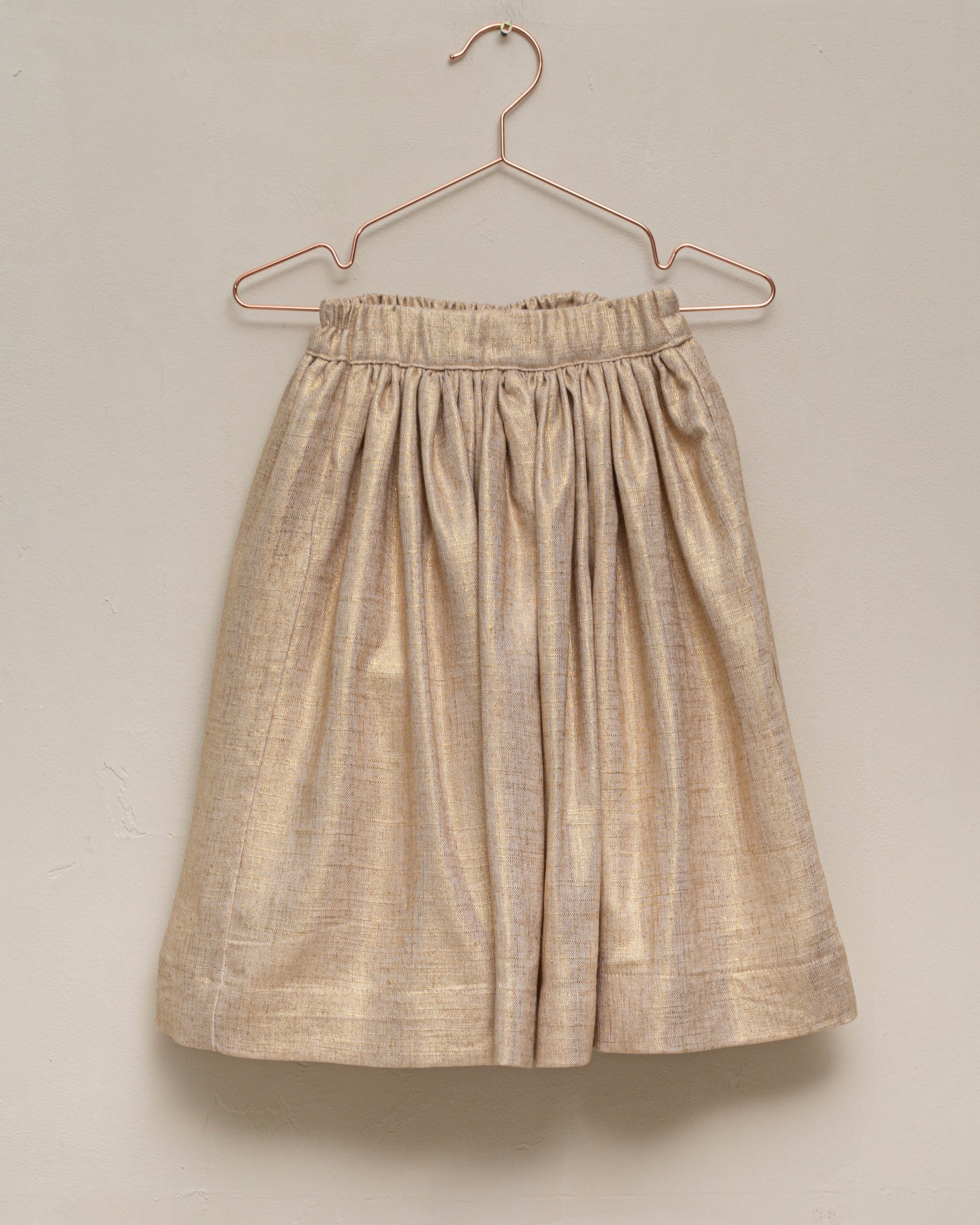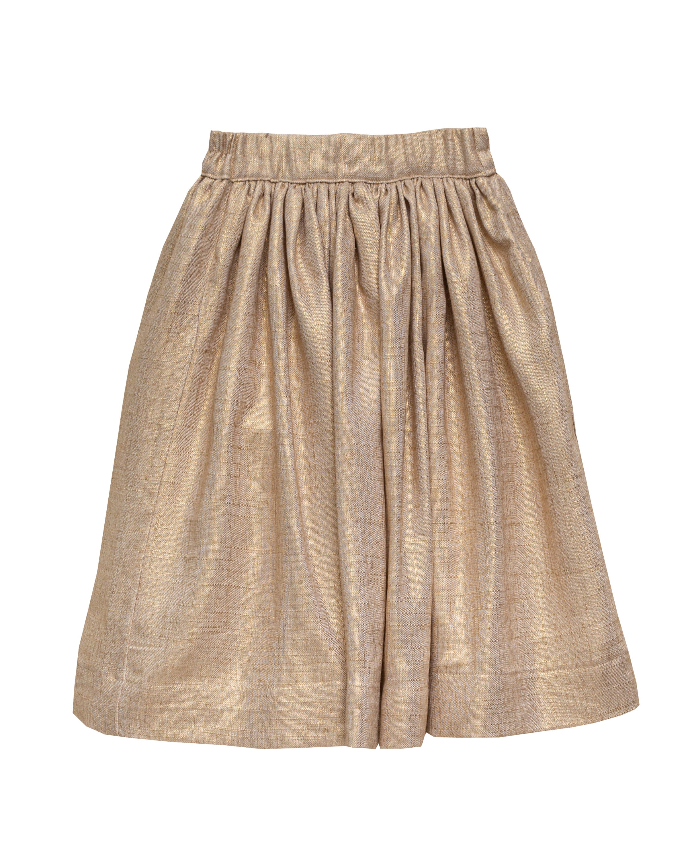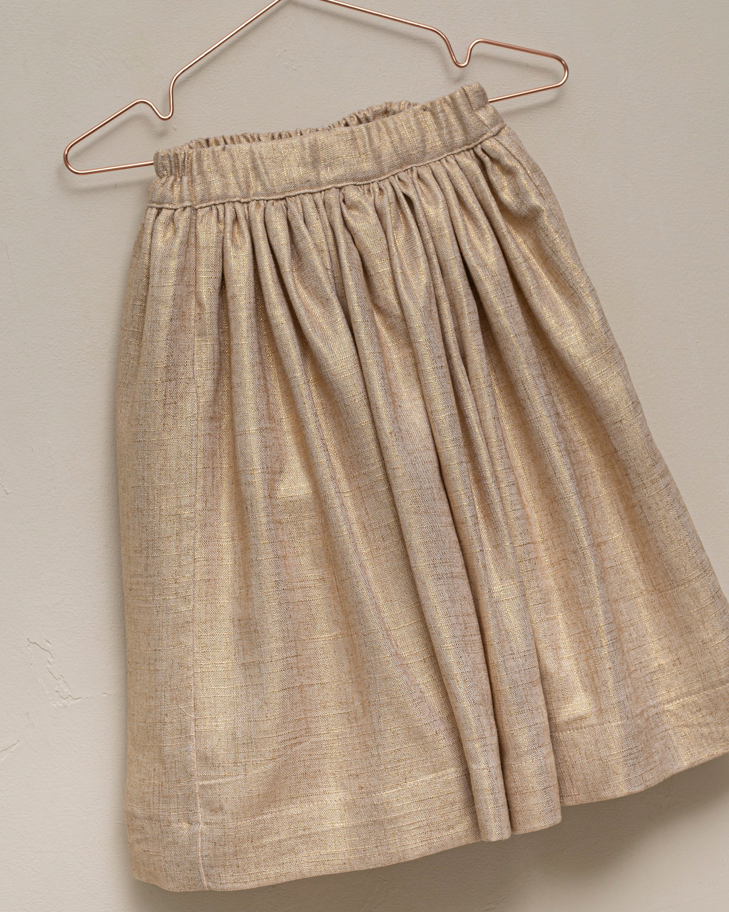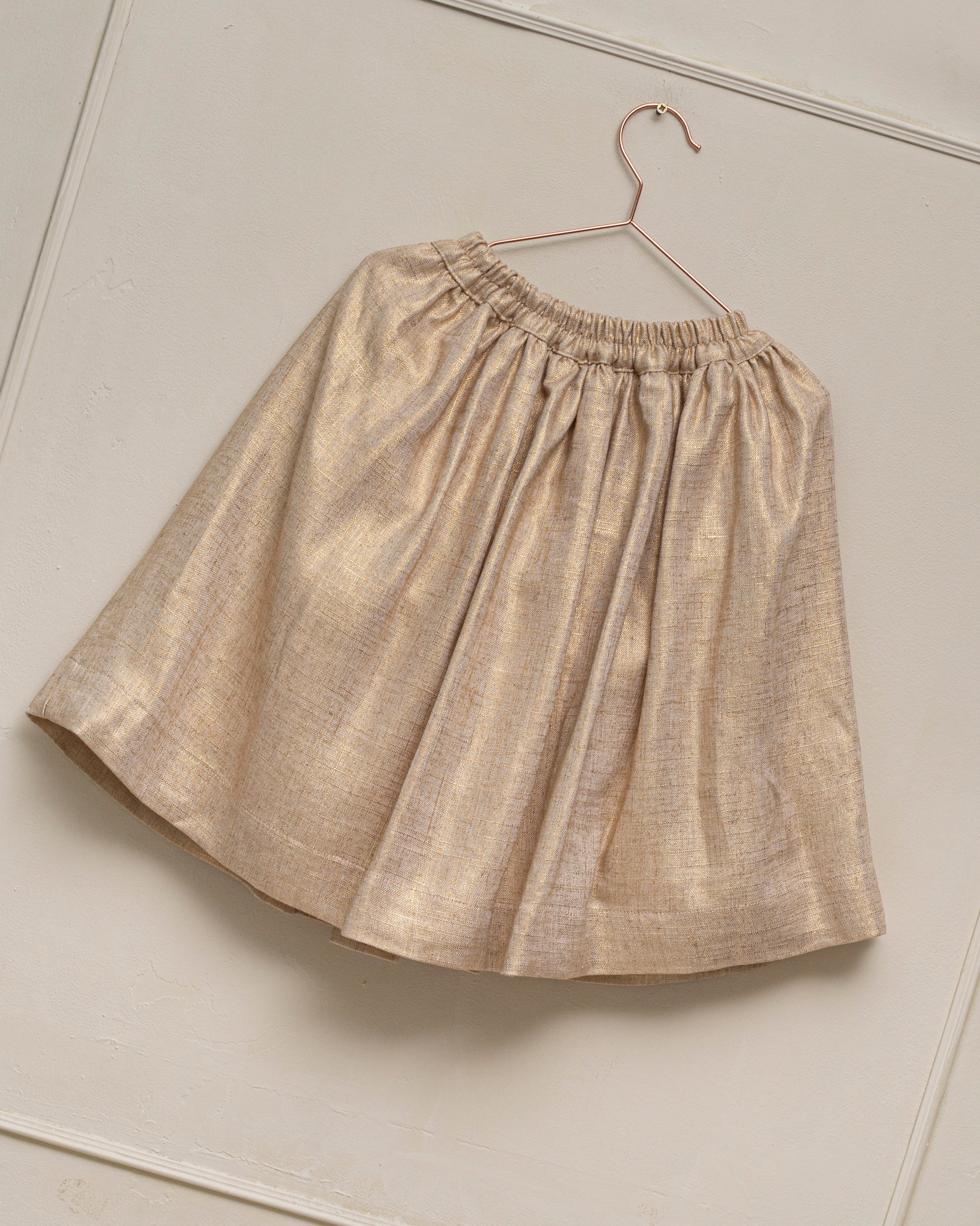 The Cloe Gold skirt is crafted in a fabric with golden threads that bring shine and a truly festive feel. Its gathered waist design creates volume and movement while keeping an elegant and versatile style. Perfect for special occasions or to add a unique touch to a more simple outfit.