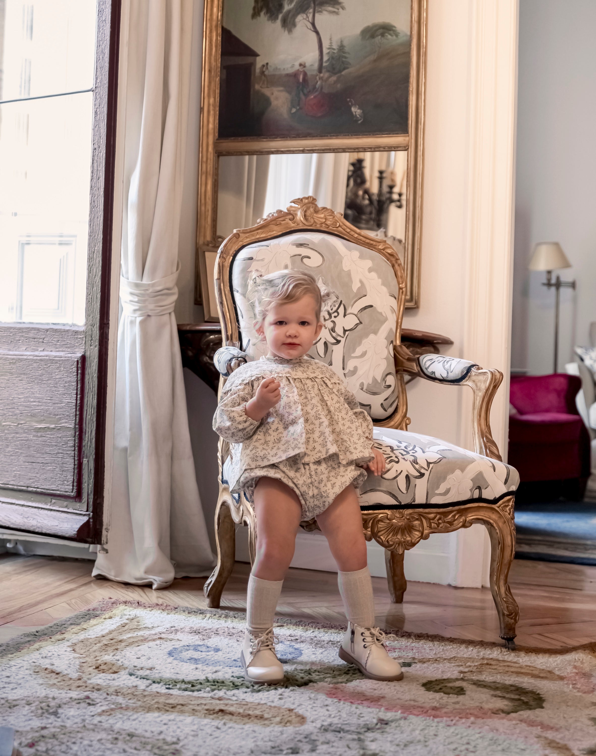 The Orion Willow set is crafted in natural linen with a delicate navy blue print. It includes a wide blouse with a rounded yoke and subtle ruffle details, paired with a matching bloomer with a gathered finish. A charming, comfortable, and versatile two-piece set, perfect for little ones.