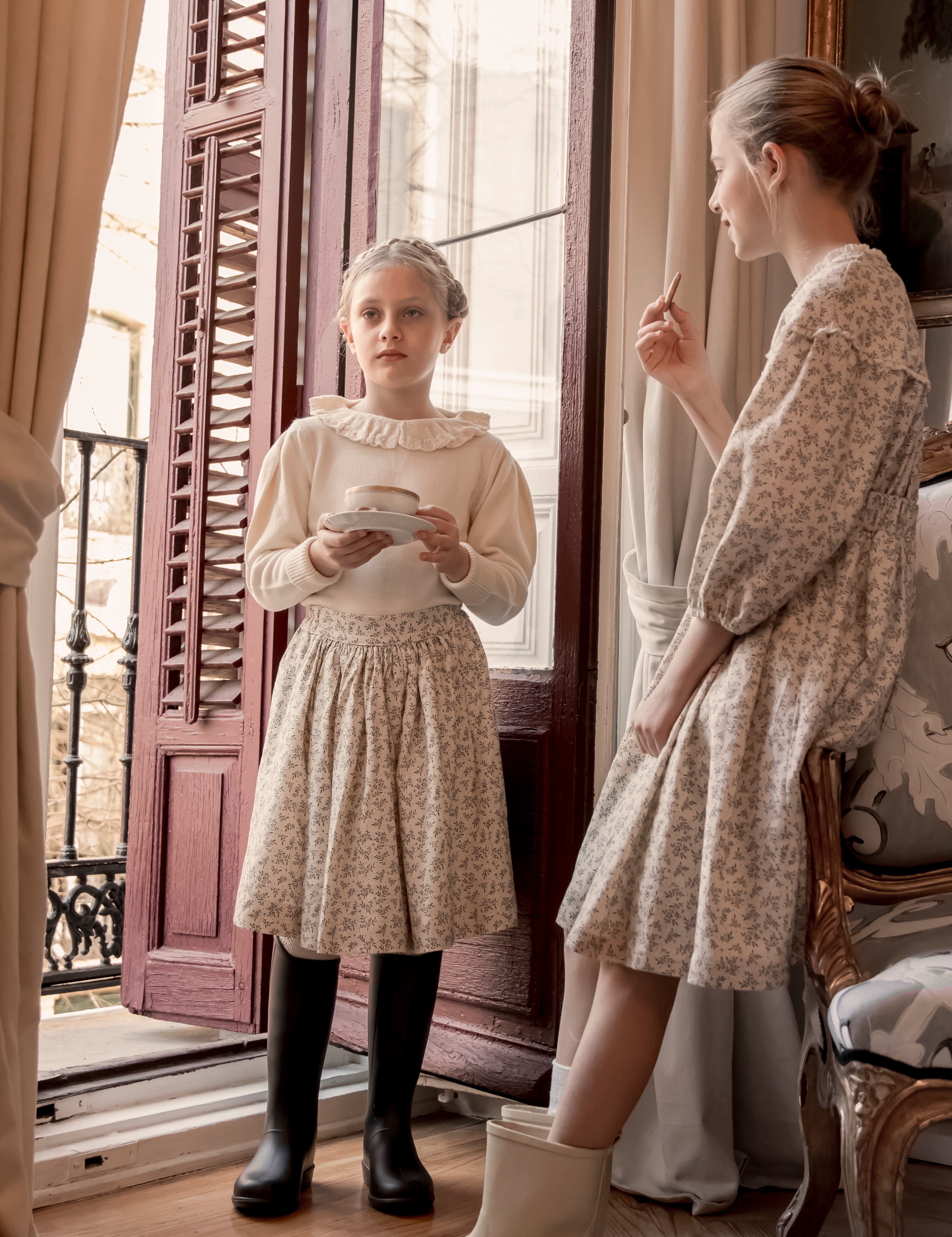 The Nat Willow skirt is made of linen with a delicate blue print on a natural background. Featuring a gathered waistband and wide cut, it offers comfort and movement, making it a versatile and feminine piece. Perfect to pair with a cream or navy sweater to create a charming look.