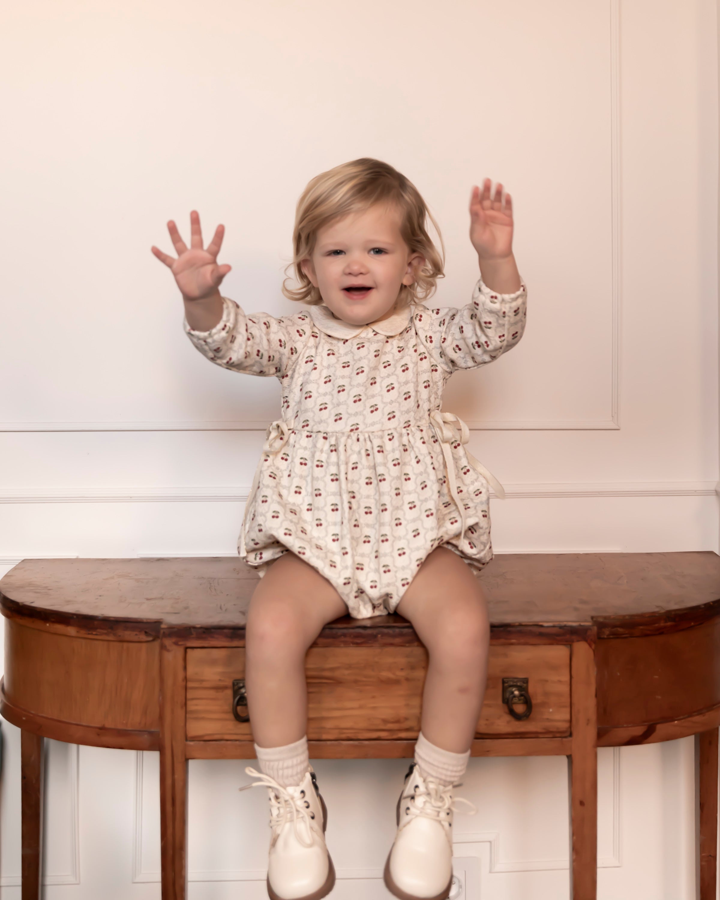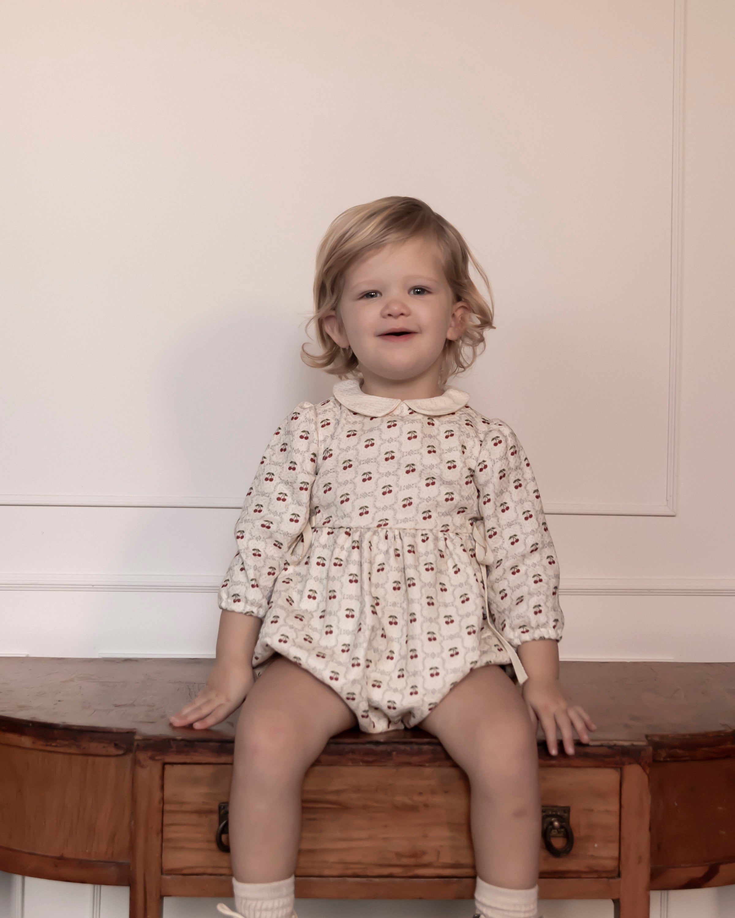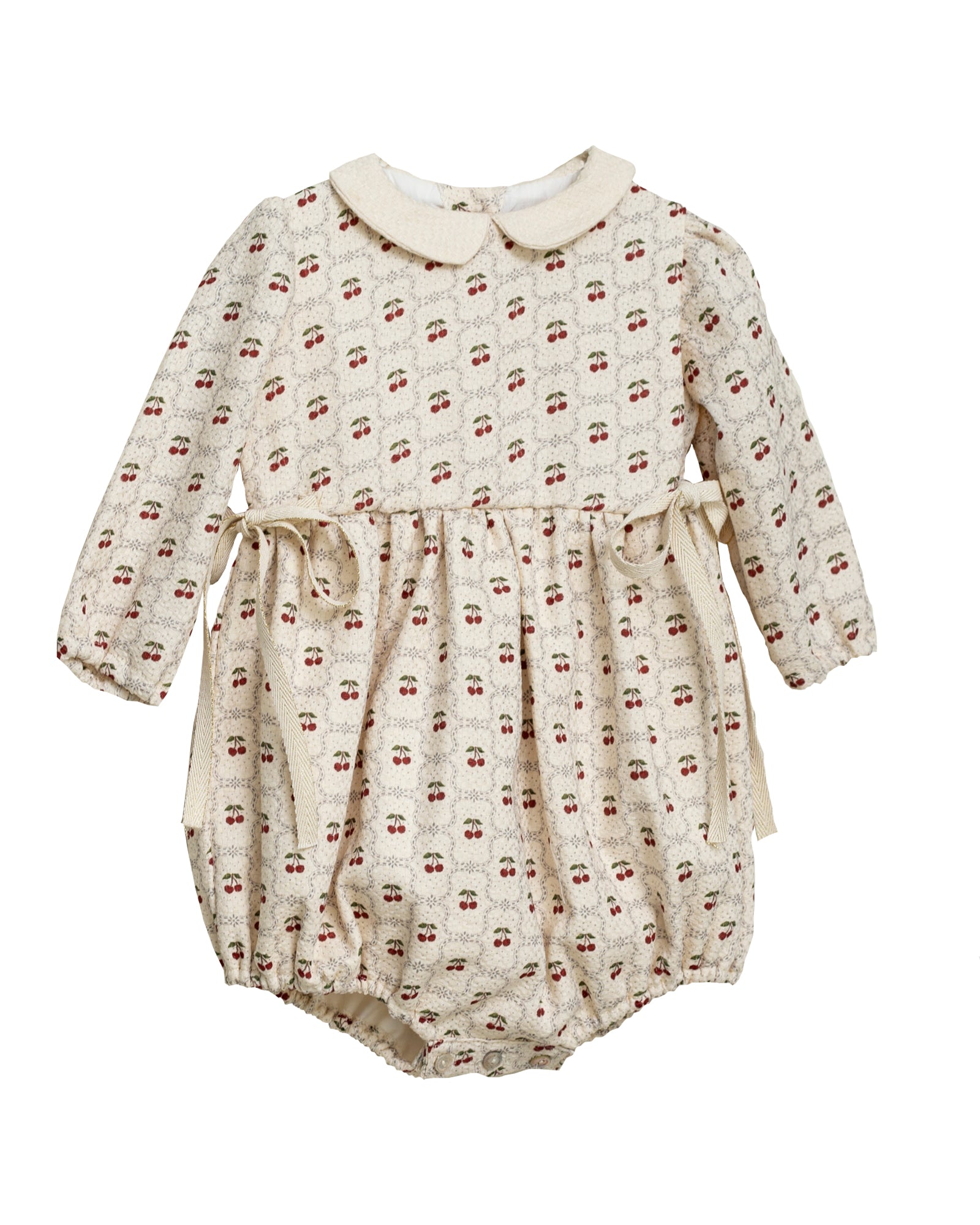 You will fall in love with our Mona romper, infused with a charming retro spirit. It fastens at the back and between legs and features a contrasting Peter Pan collar, along with delicate side ties. The cherry print on a beige cotton background makes this design cheerful and distinctive.