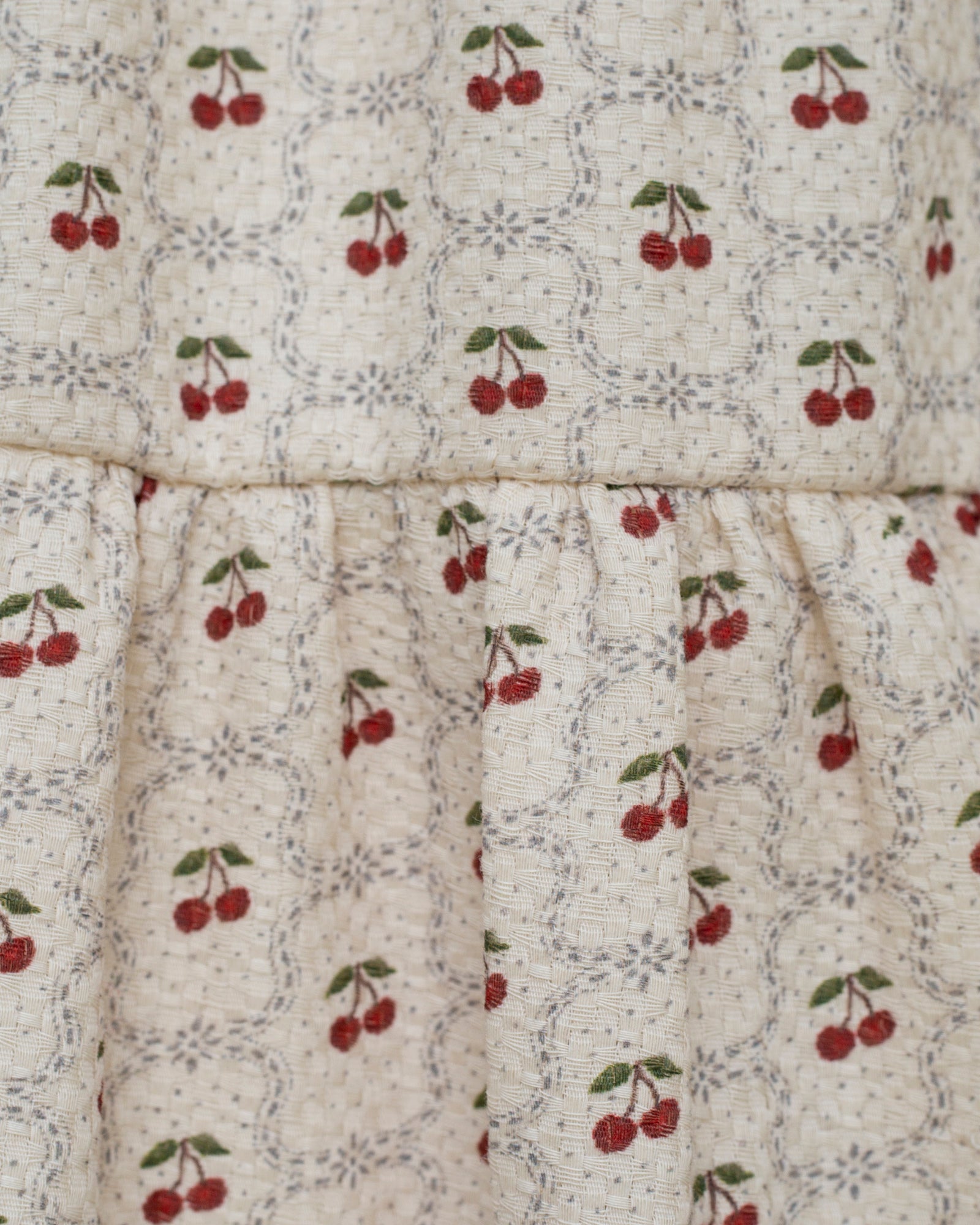 Wide-cut dress with a flowing silhouette enhanced by three ruffles. It ties at the side with delicate bows, adding a feminine and effortless touch. The vintage-inspired cherry print on a beige cotton fabric makes this piece both unique and joyful.