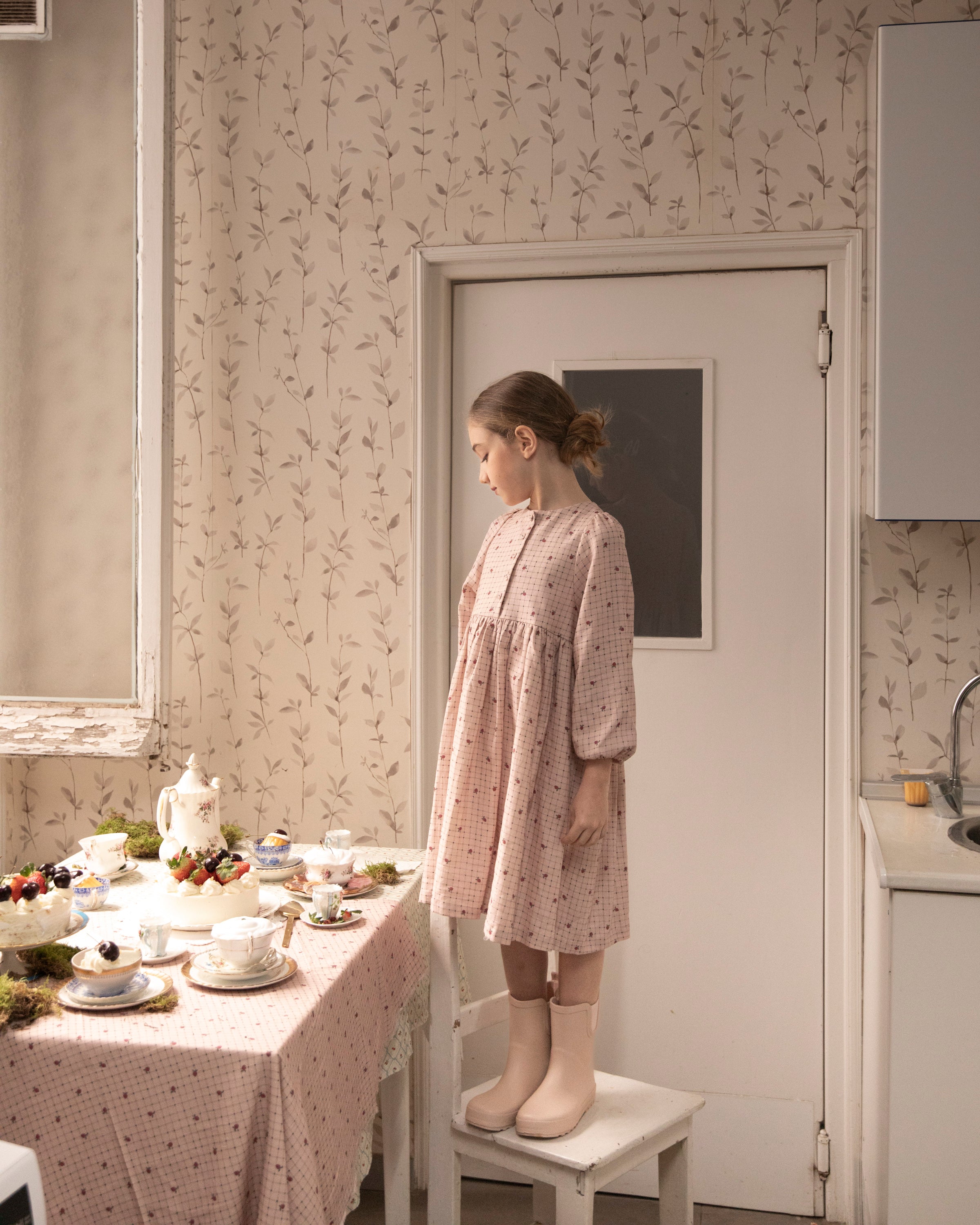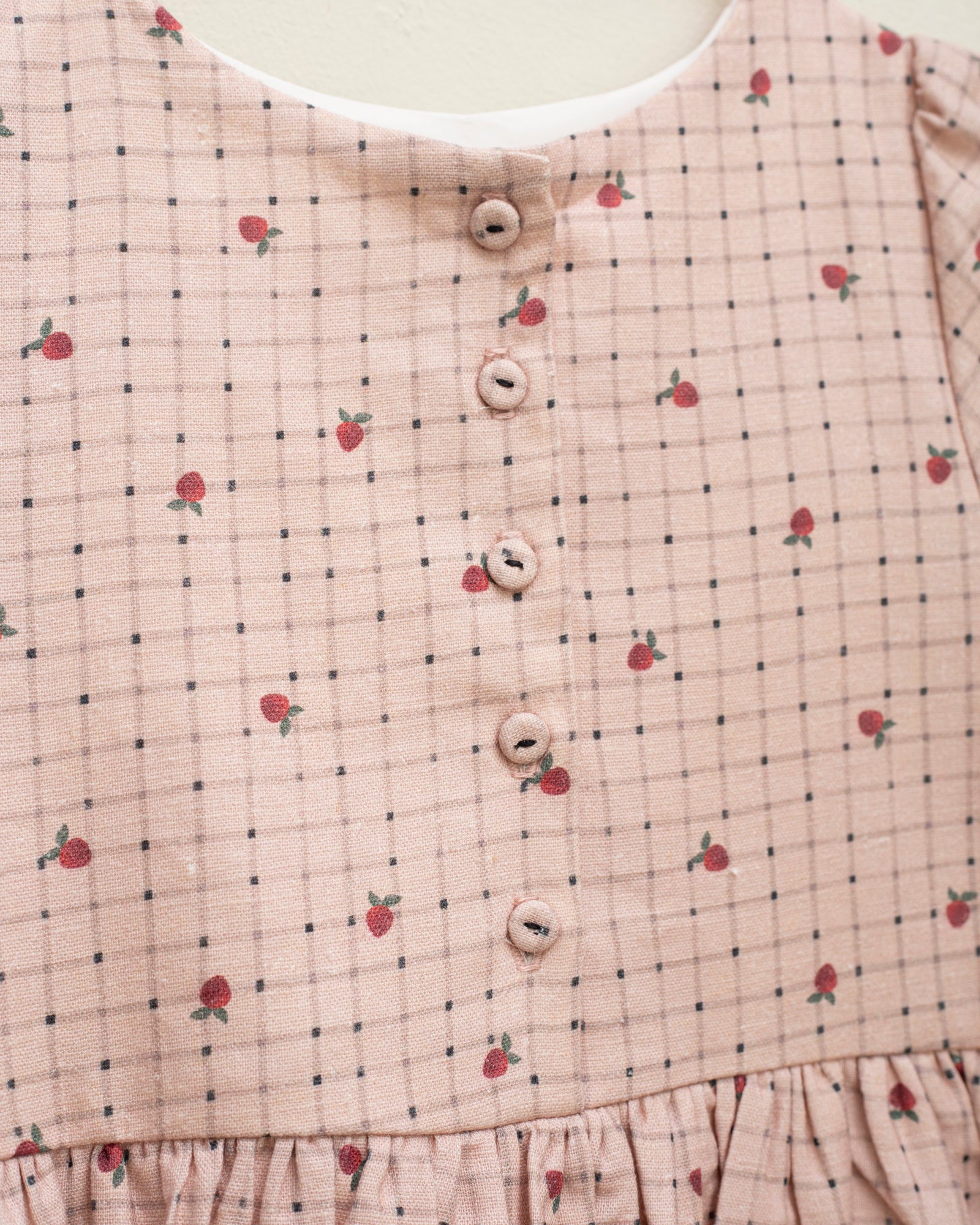 The Fiona dress stands out for its sweet print of tiny cherries over a soft check pattern. Its design is enhanced by covered buttons on the chest and long sleeves with gathered cuffs, adding comfort and timeless charm. A delicate and versatile piece, perfect for everyday wear or for special occasions with a romantic touch.