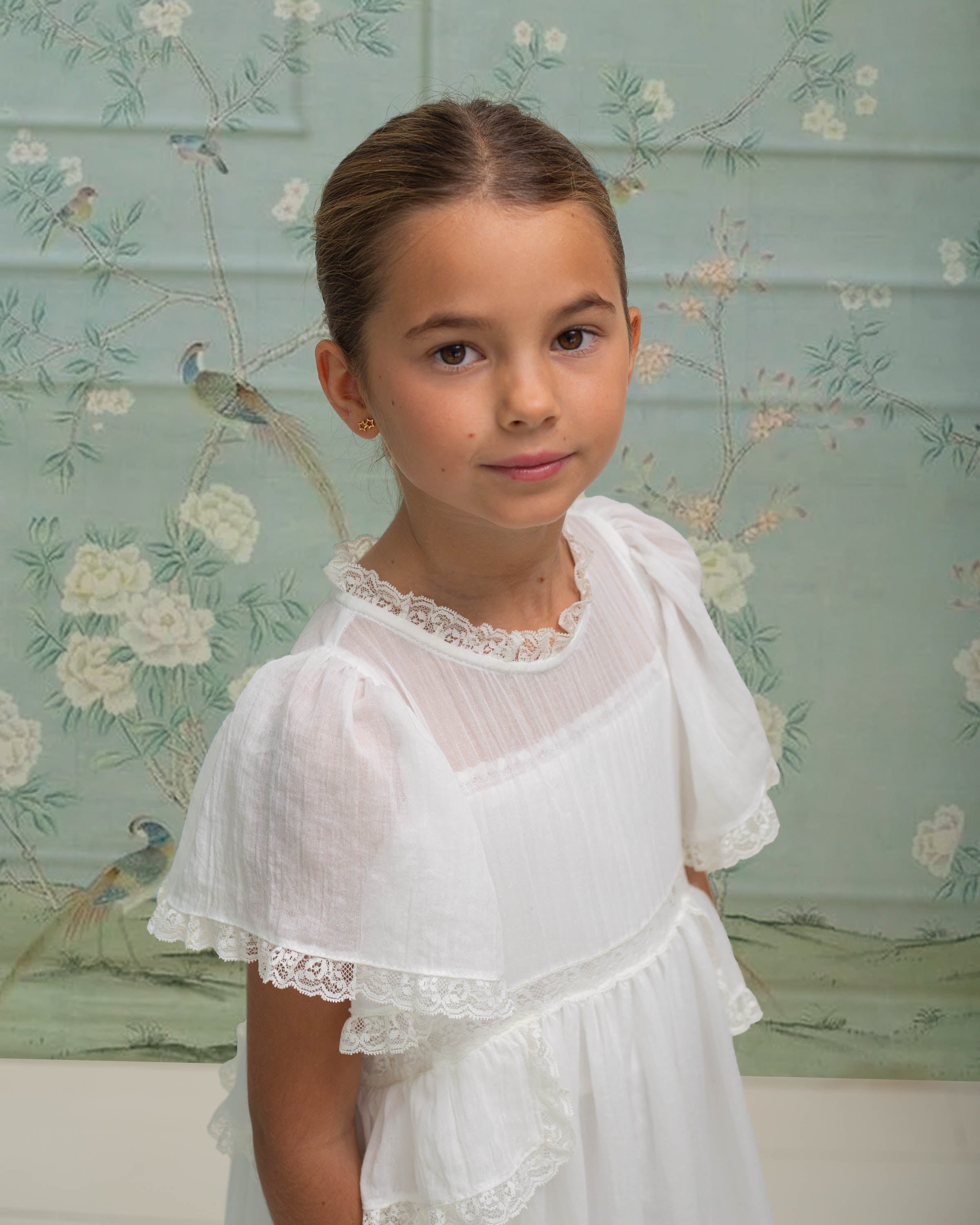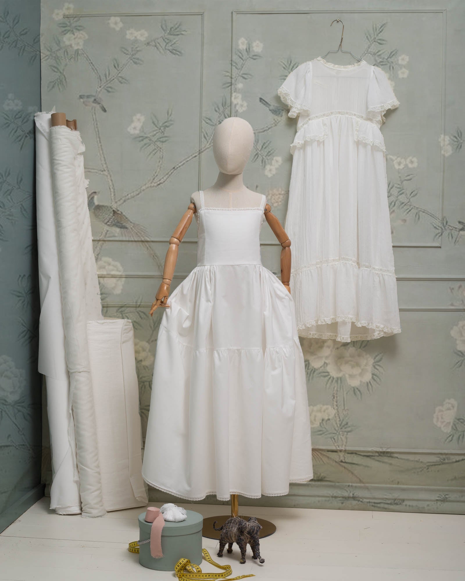 The Kanon communion dress is made from off-white Musola. Musola is a blend of cotton with a touch of polyester, giving it a slightly textured and very lightweight appearance. It doesn’t wrinkle, so it will remain perfect all day long.