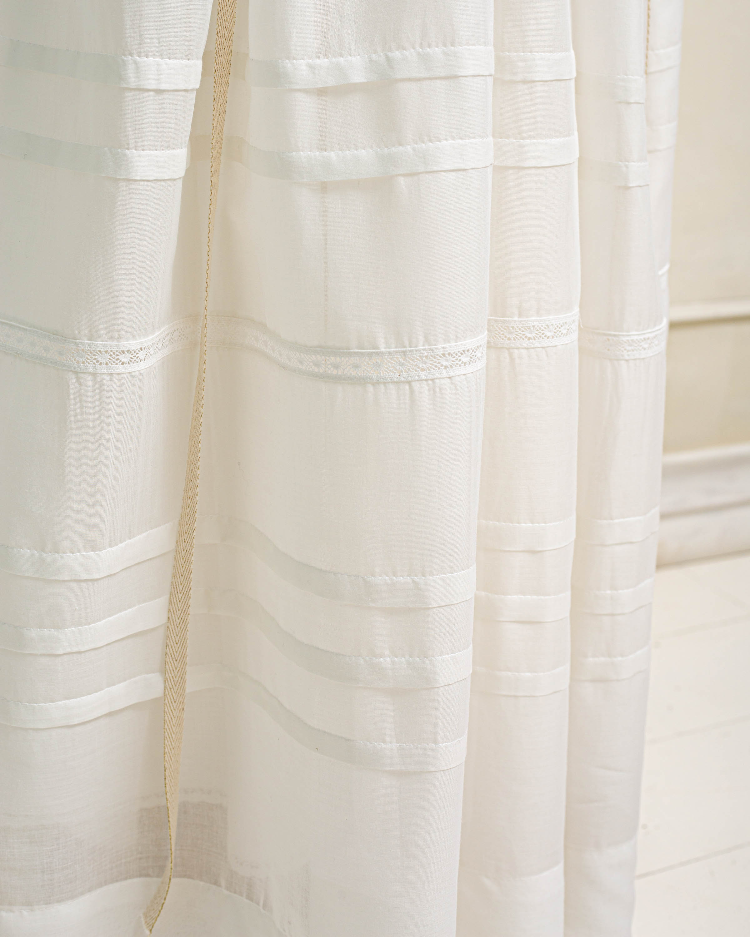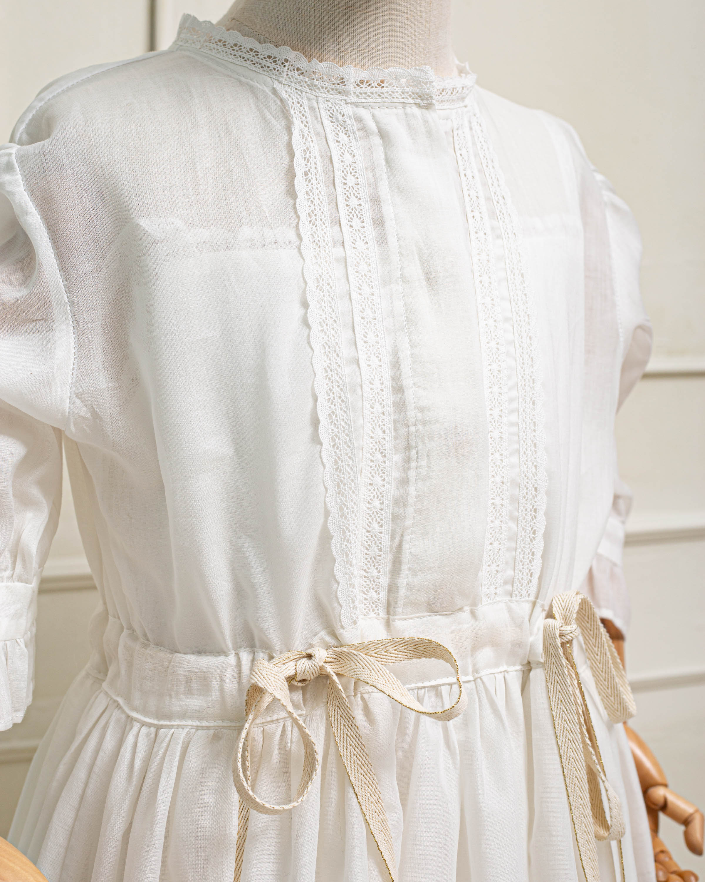 It opens at the front with buttons and a placket. The bodice features vertical lace details and two bows to cinch it at the waist. Its stunning skirt is adorned with pleats and a matching lace insert that mirrors the bodice design.