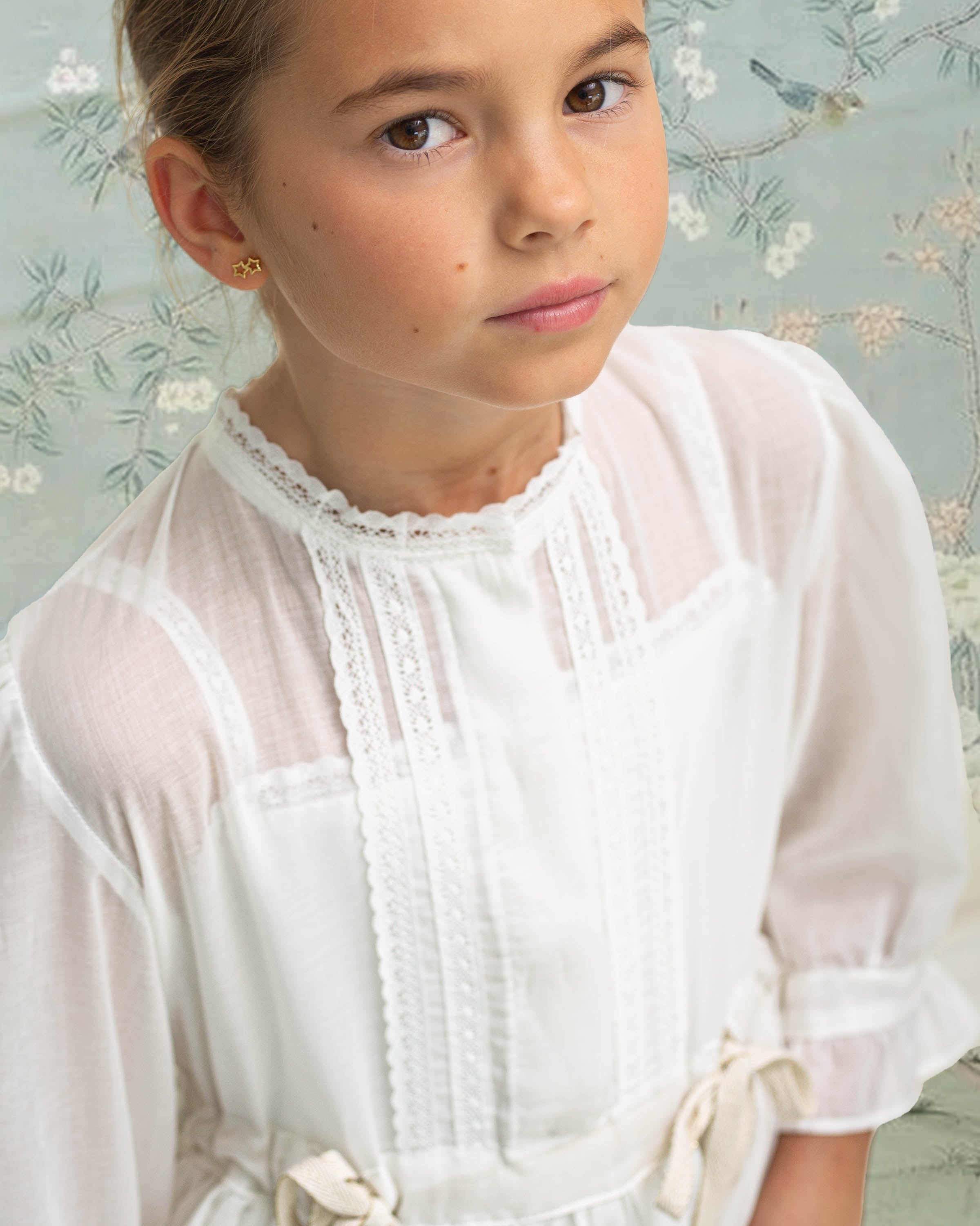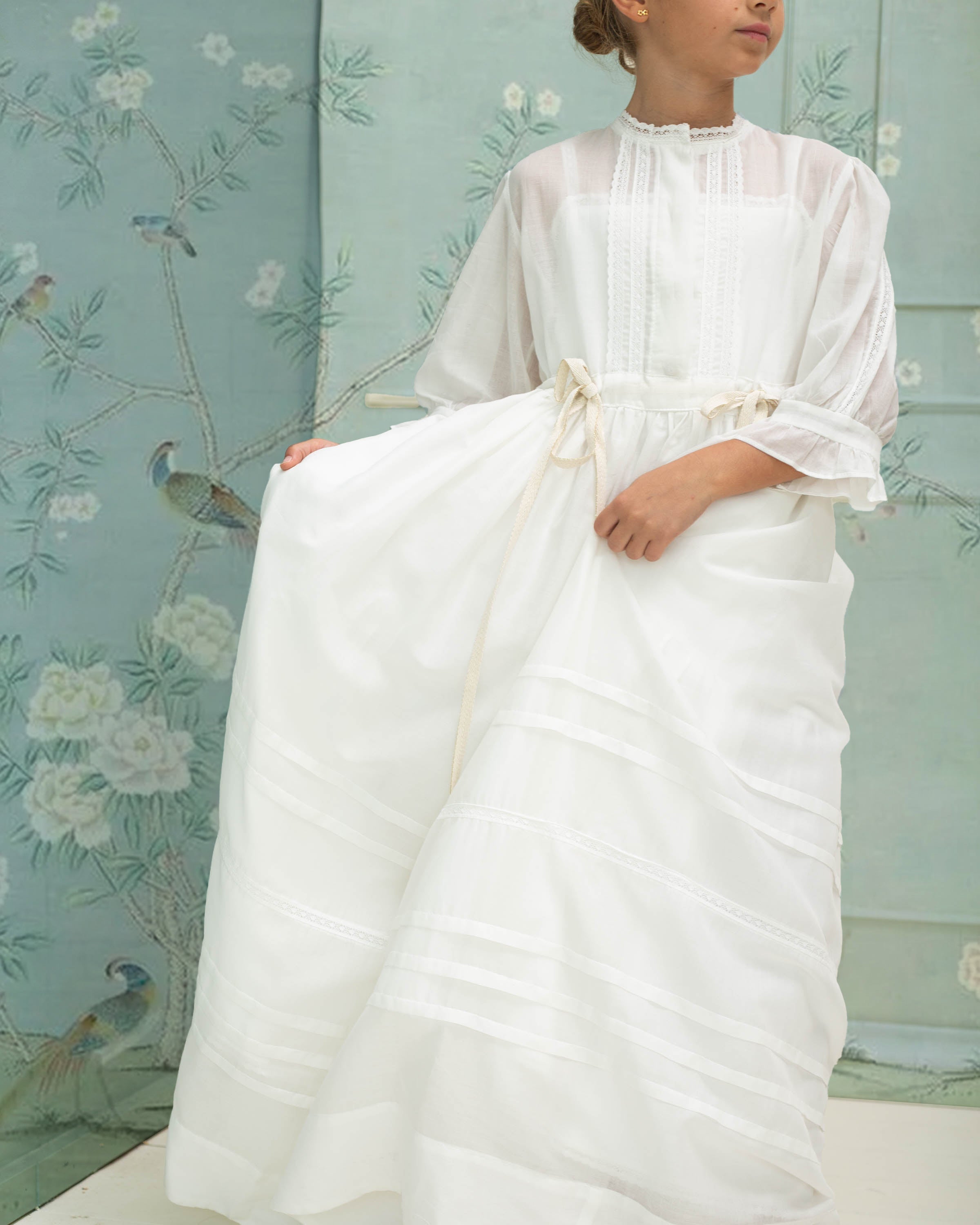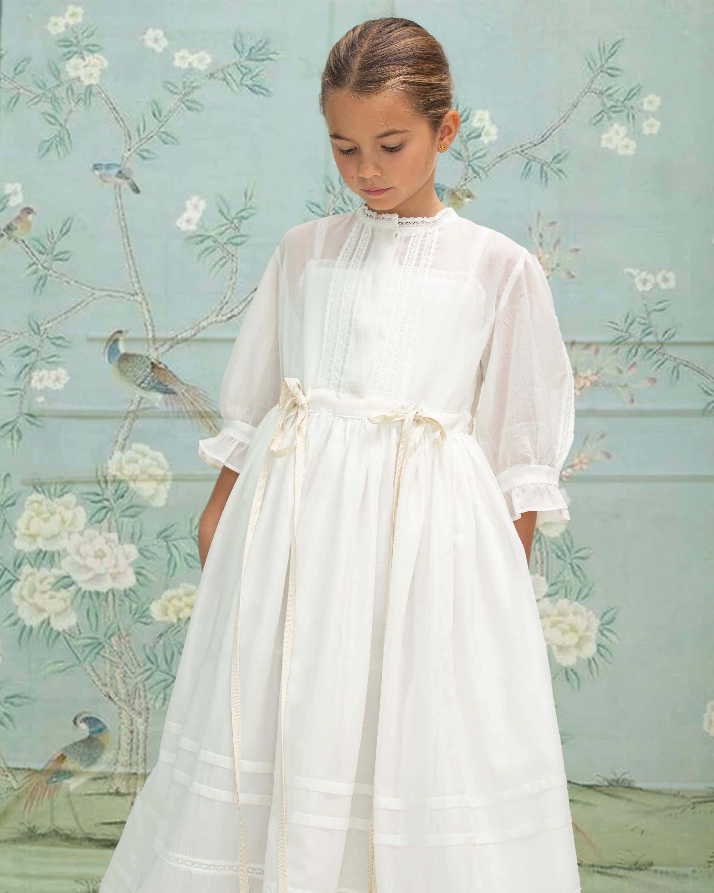 If you're looking for a truly unique and original First Communion dress, you’ll love Moss. This dress is made from off-white Muslin 100% Cotton, combined with matching guipure lace.