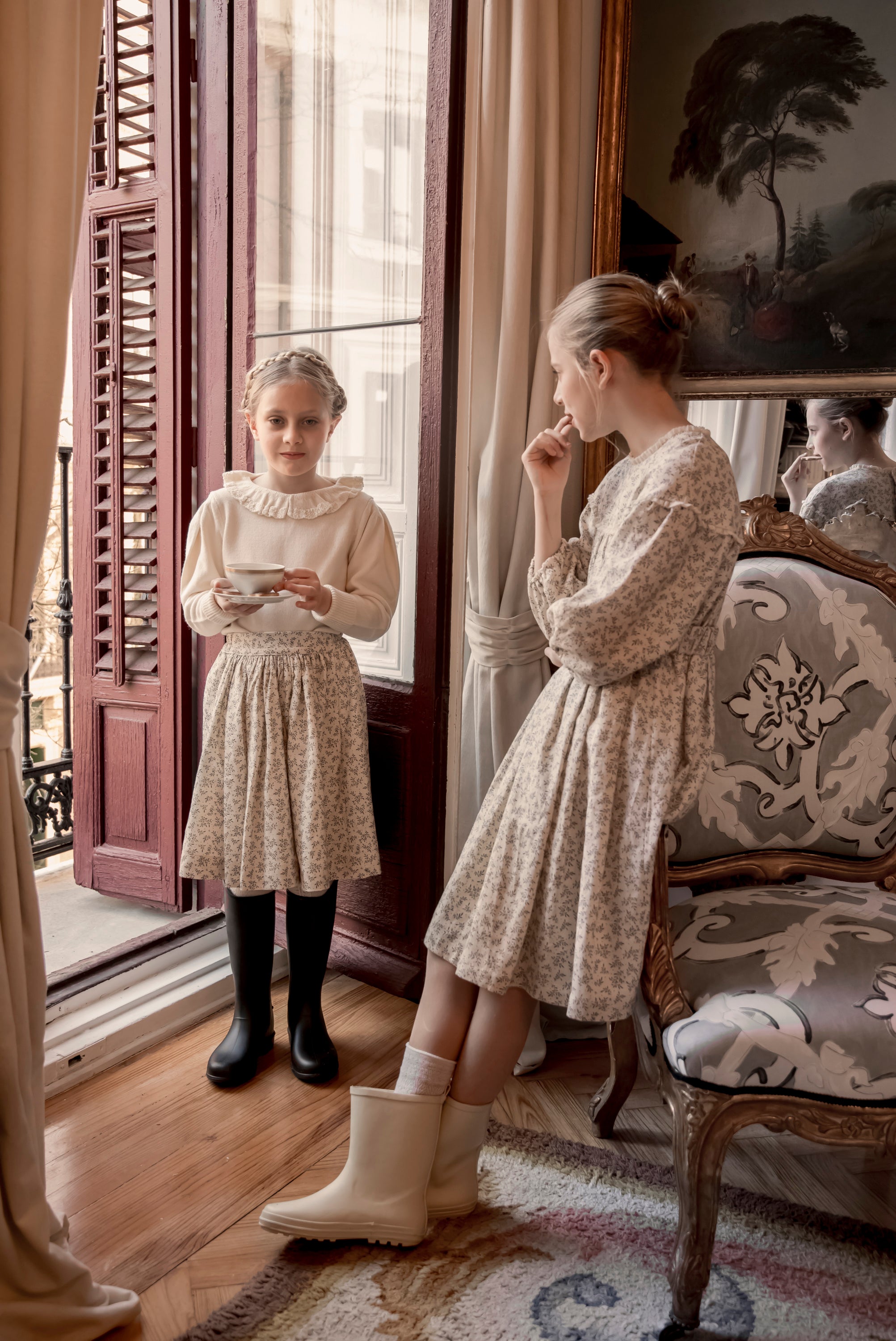 The Oreli dress is crafted in cotton with a delicate blue floral print on a natural background. Its design is highlighted by a yoke with a ruffle framing the bodice and subtle gathered details at the waist that gently define the silhouette. Long sleeves with elastic cuffs and a wide skirt add comfort and movement, making this a feminine and timeless style.