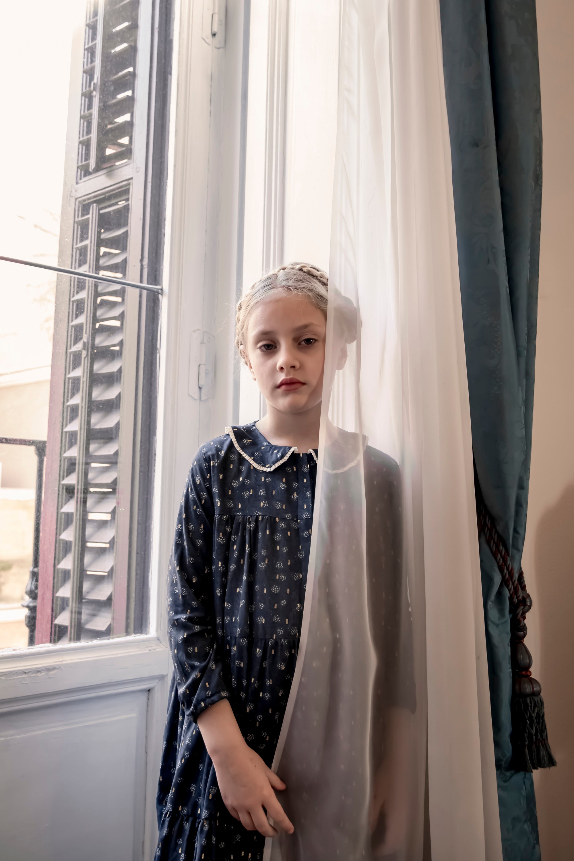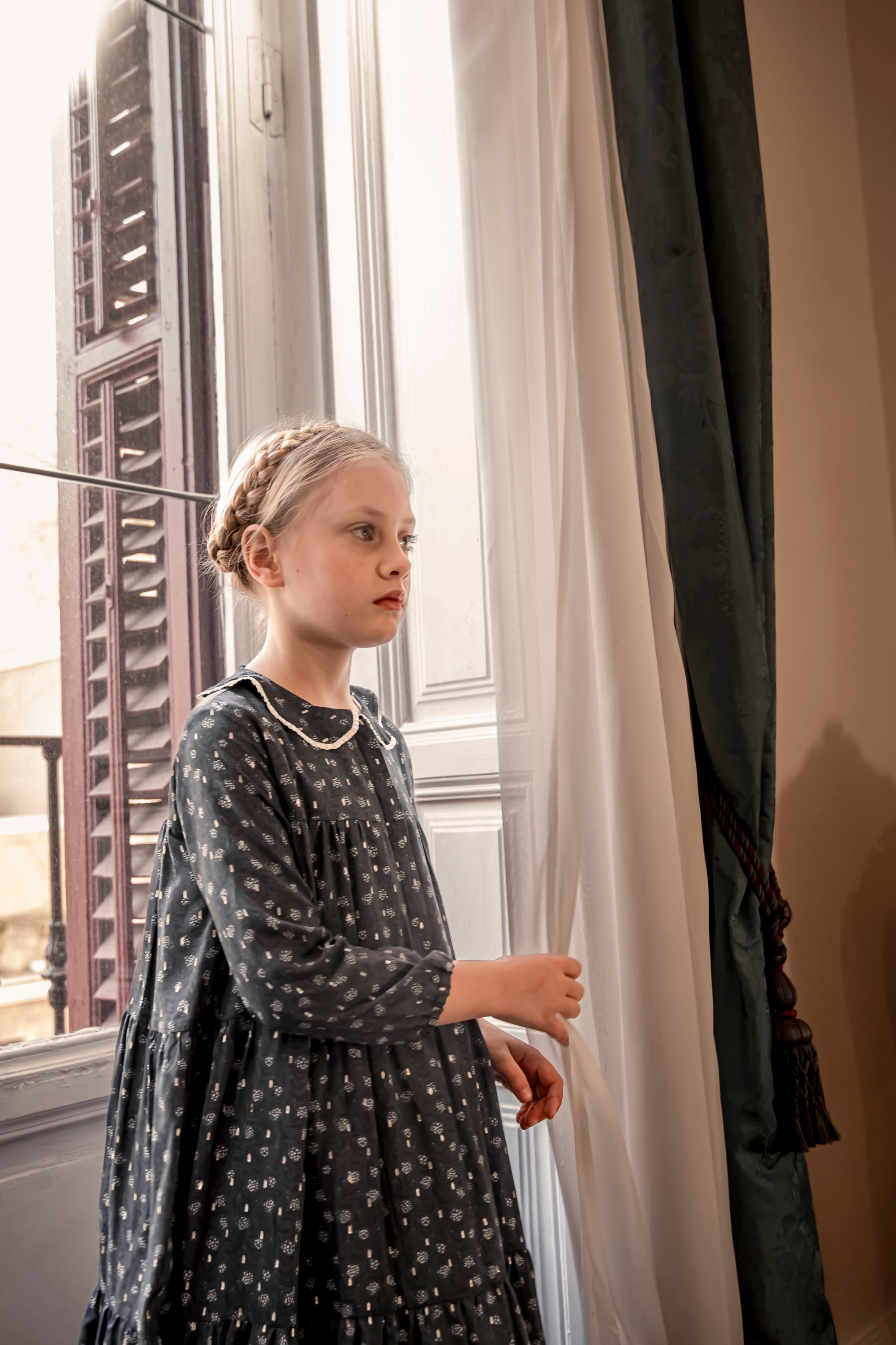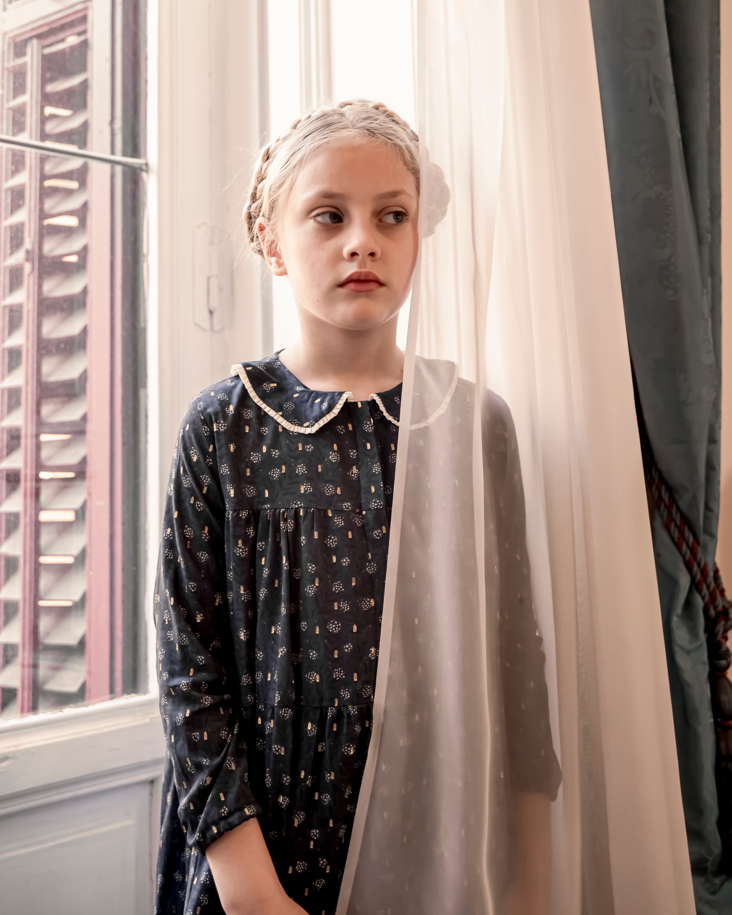 The Edge dress is crafted in midnight blue viscose with a delicate floral print highlighted by subtle golden accents. Its loose silhouette with three gathered tiers brings freshness and movement. The Peter Pan collar with contrasting trim adds a charming feminine detail. It opens  at the front and fastens with buttons hidden under a placket, giving it a clean and elegant finish.