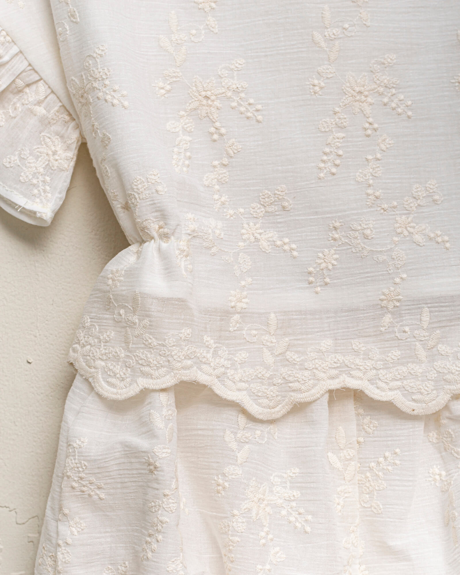 Beautiful two-piece set for girls in embroidered beige bambula. It features a little blouse with a back opening and matching bloomer-style trousers.