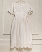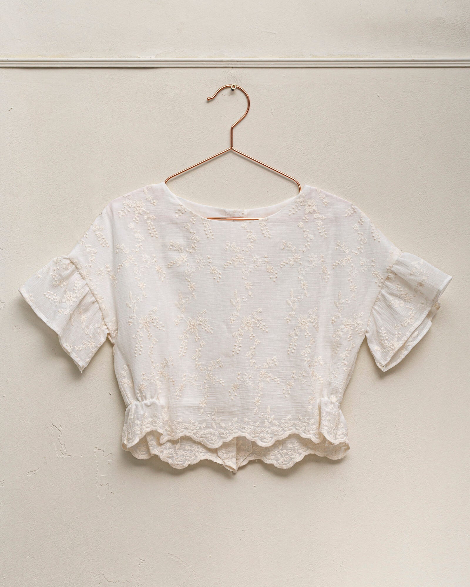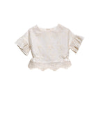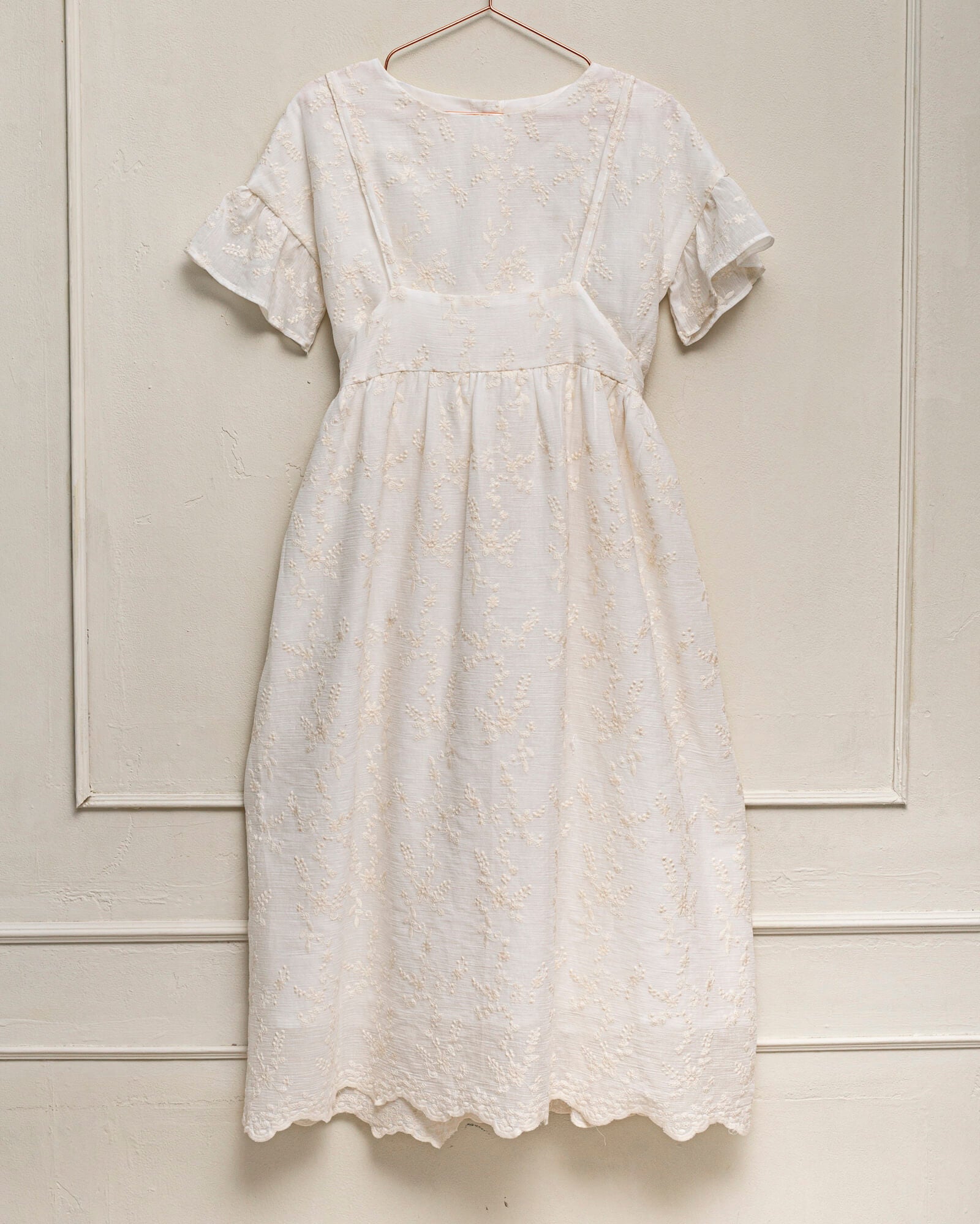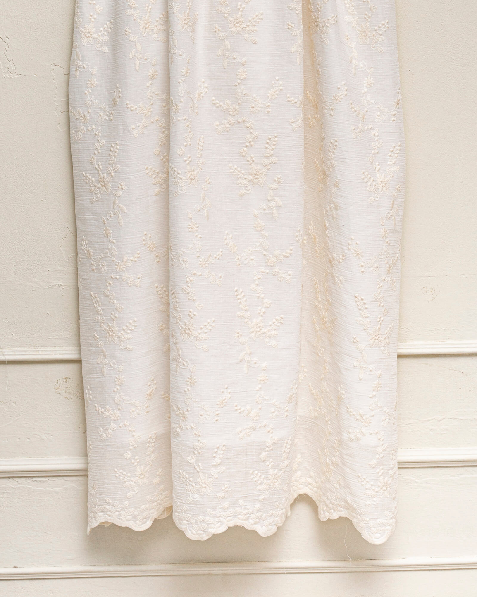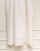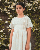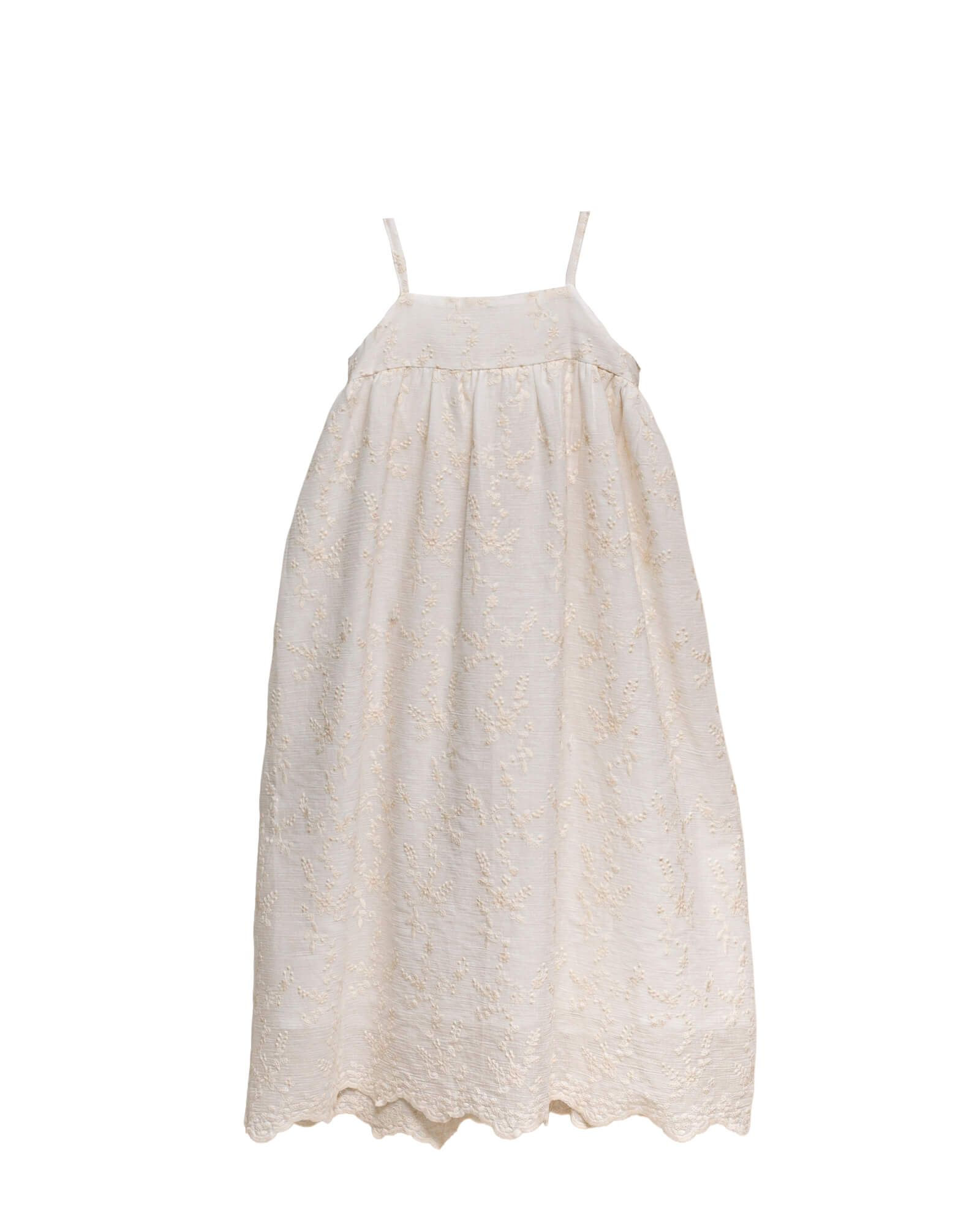 Beautiful two-piece set for girls in beige embroidered bambula. It features a little blouse with a back opening, topped with a wonderful midi-length strappy dress.