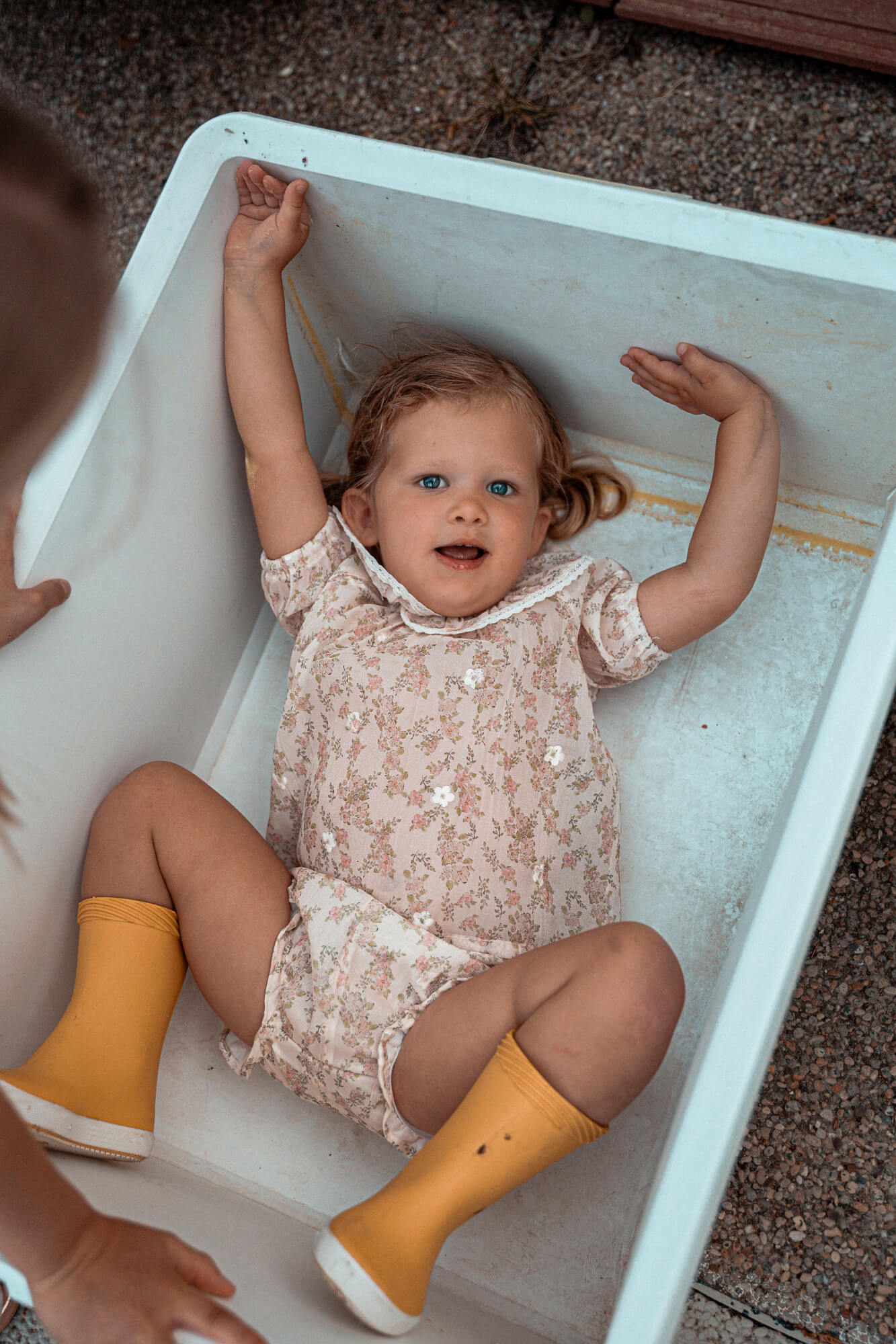 Baby set made from a beautiful lightweight floral fabric in pink and green tones. The blouse features a ruffled collar with cotton lace detail, paired with matching bloomers. Perfect for a special occasion, such as a christening, a First Communion, or a wedding.