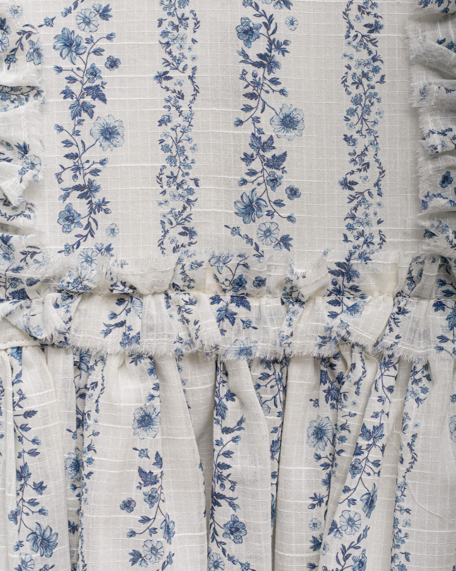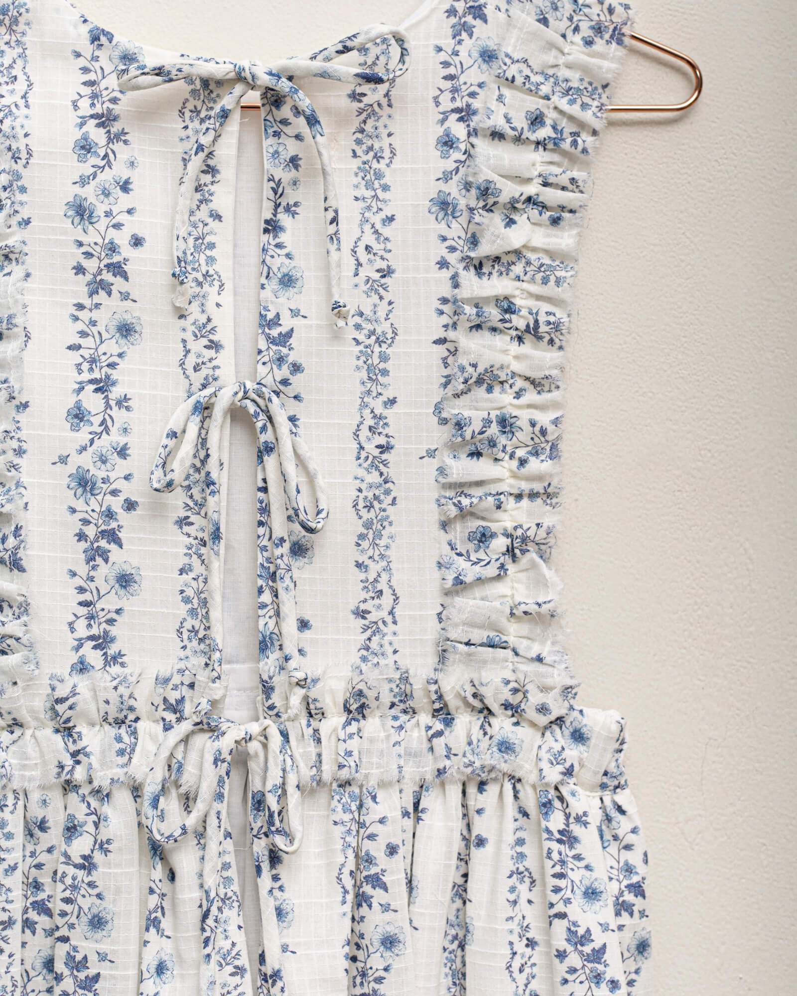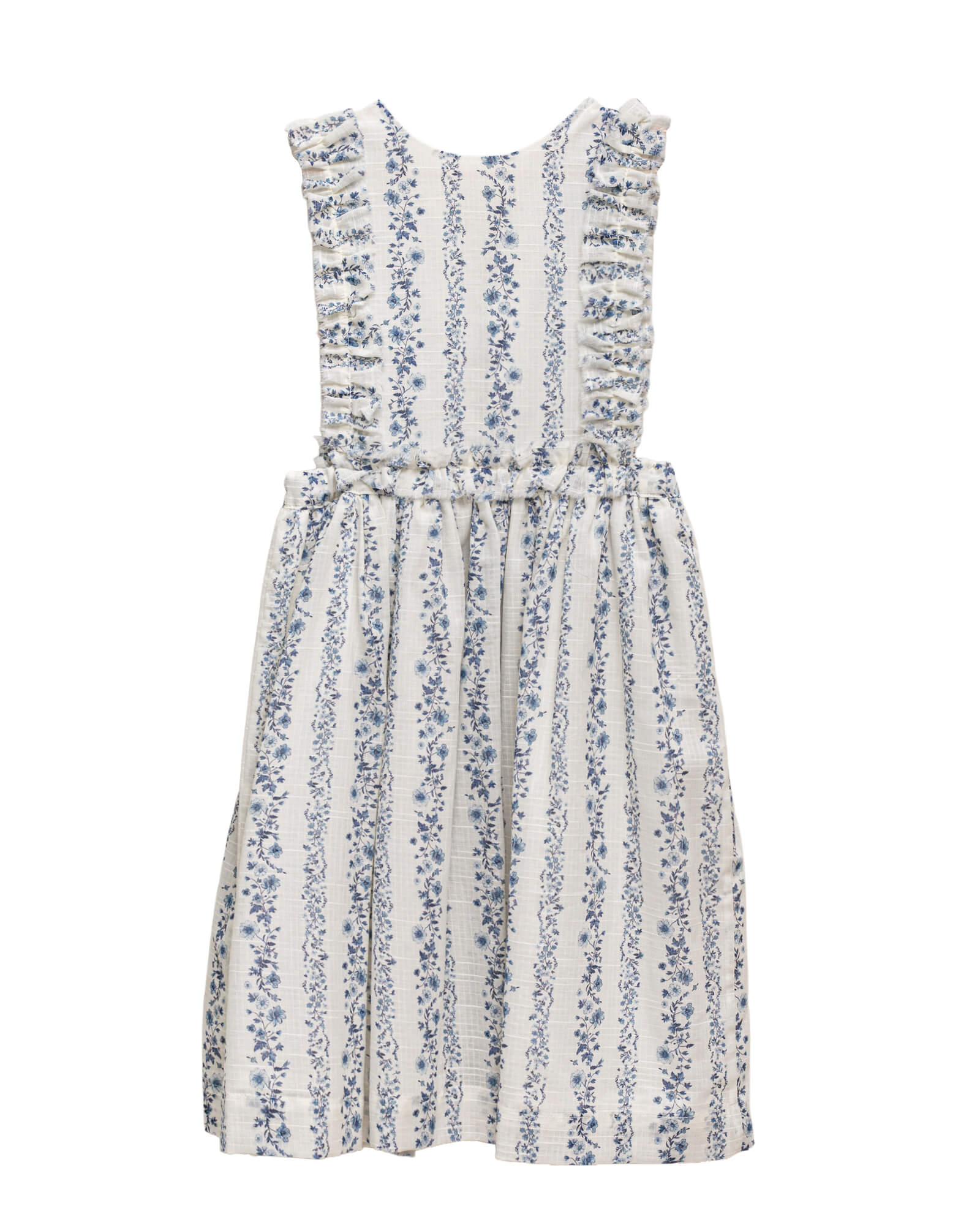 Wonderful pinafore dress with a frayed-effect ruffled bodice. It ties at the back with bows. Made from delicate textured batiste with a blue floral print. Perfect for a casual summer day or as a guest outfit for a special occasion, a wedding, or a First Communion.