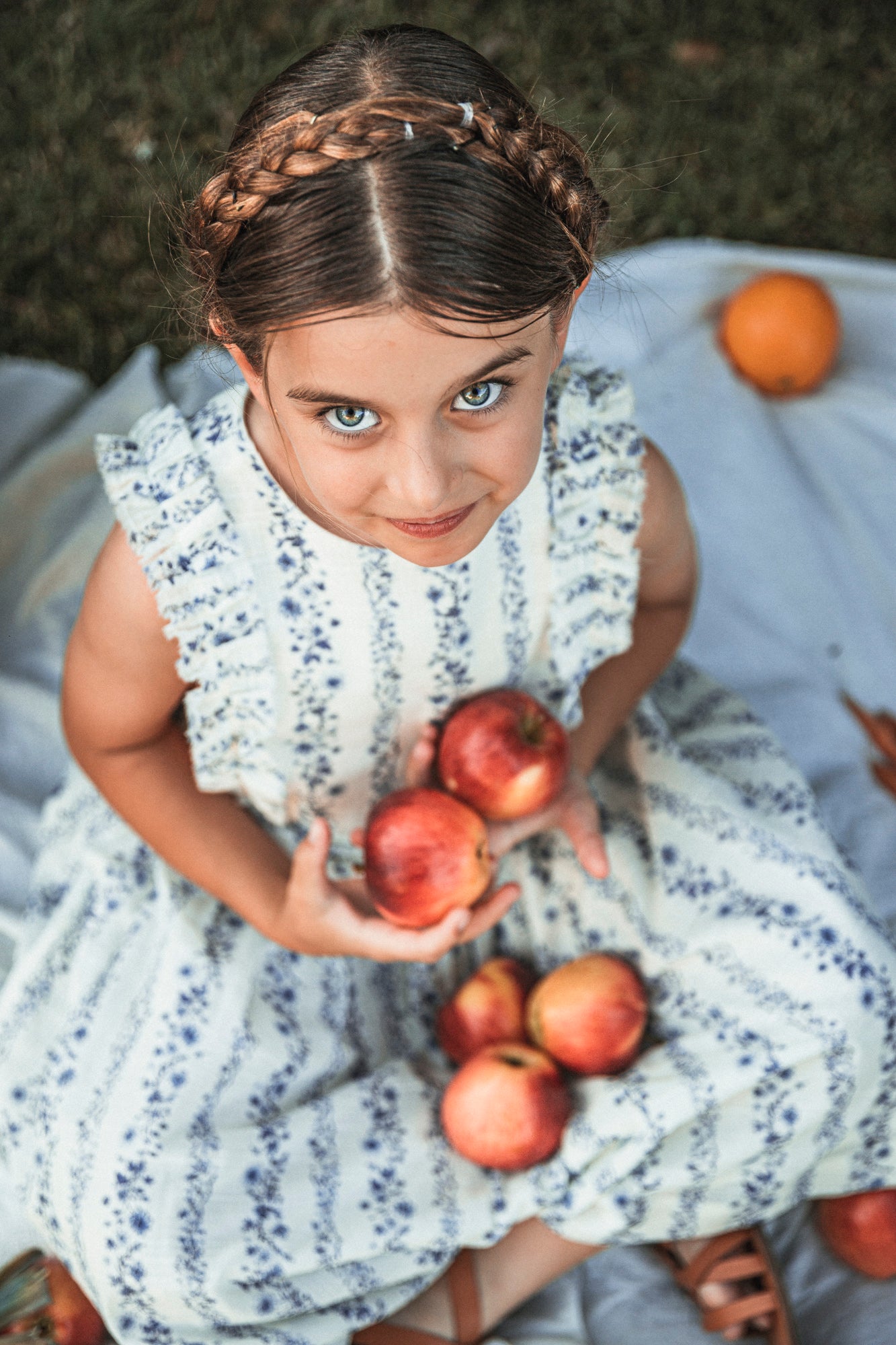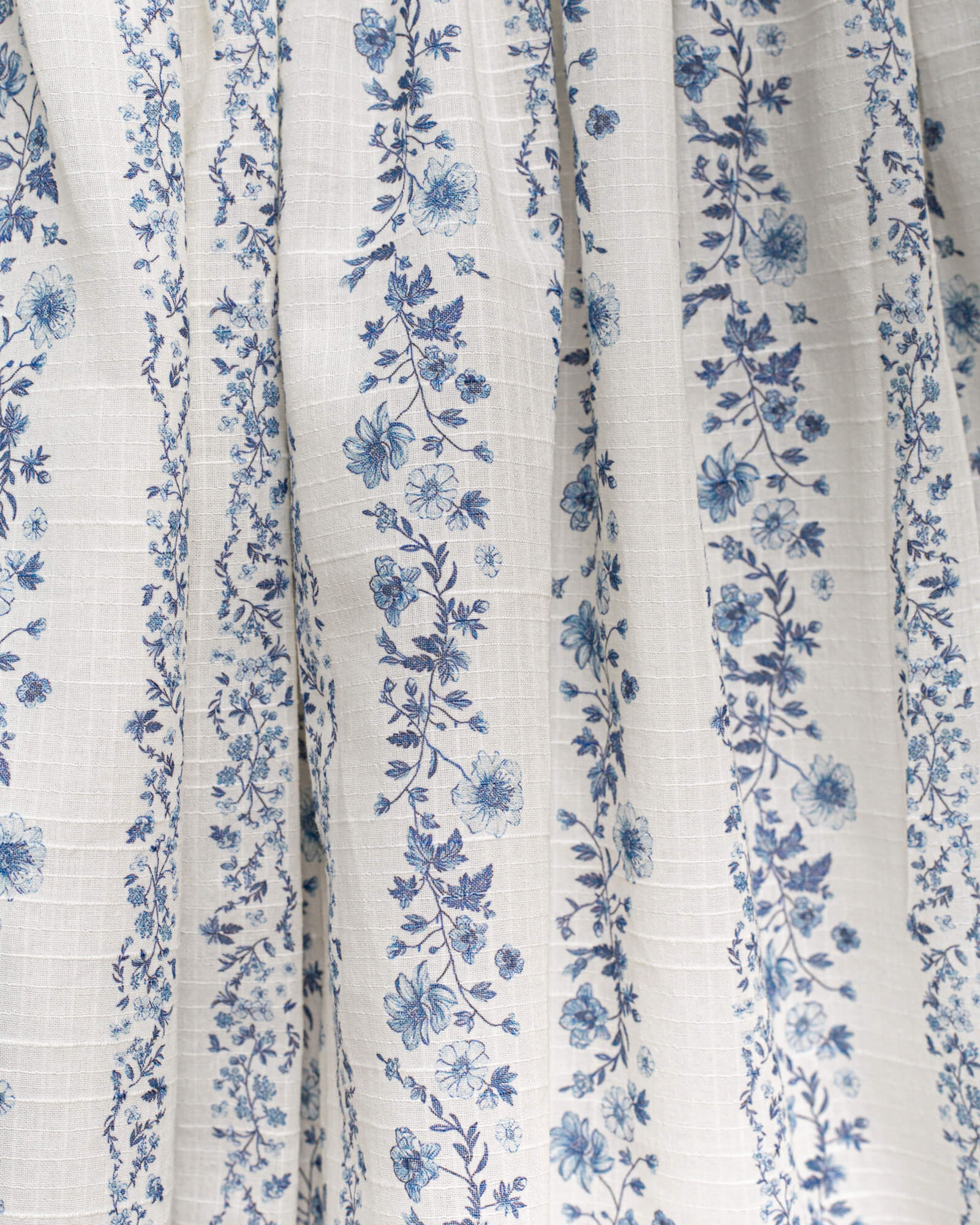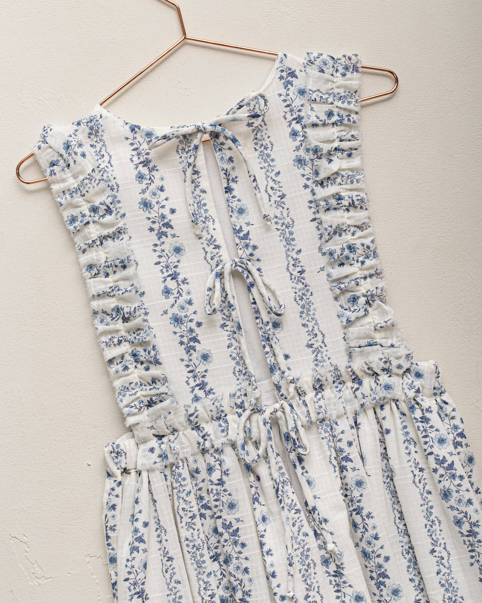 Wonderful pinafore dress with a frayed-effect ruffled bodice. It ties at the back with bows. Made from delicate textured batiste with a blue floral print. Perfect for a casual summer day or as a guest outfit for a special occasion, a wedding, or a First Communion.