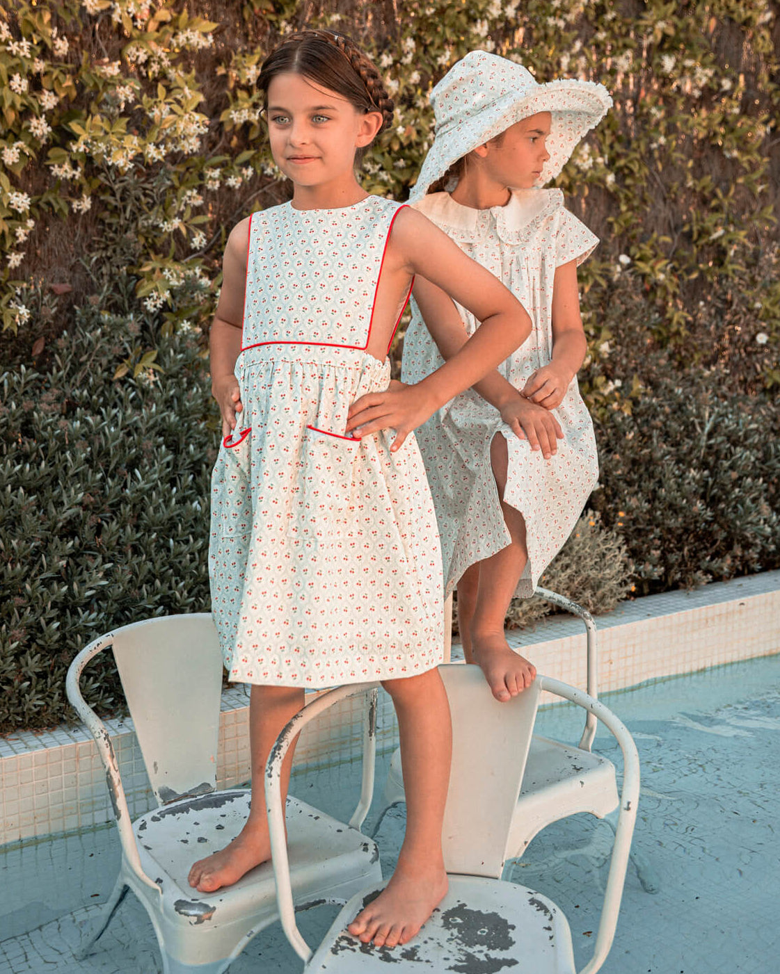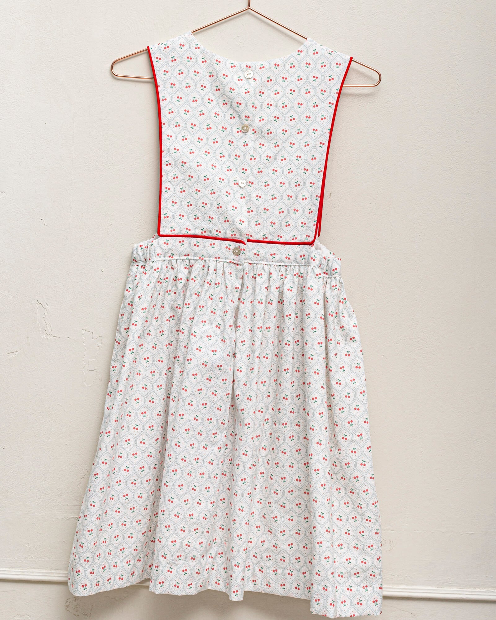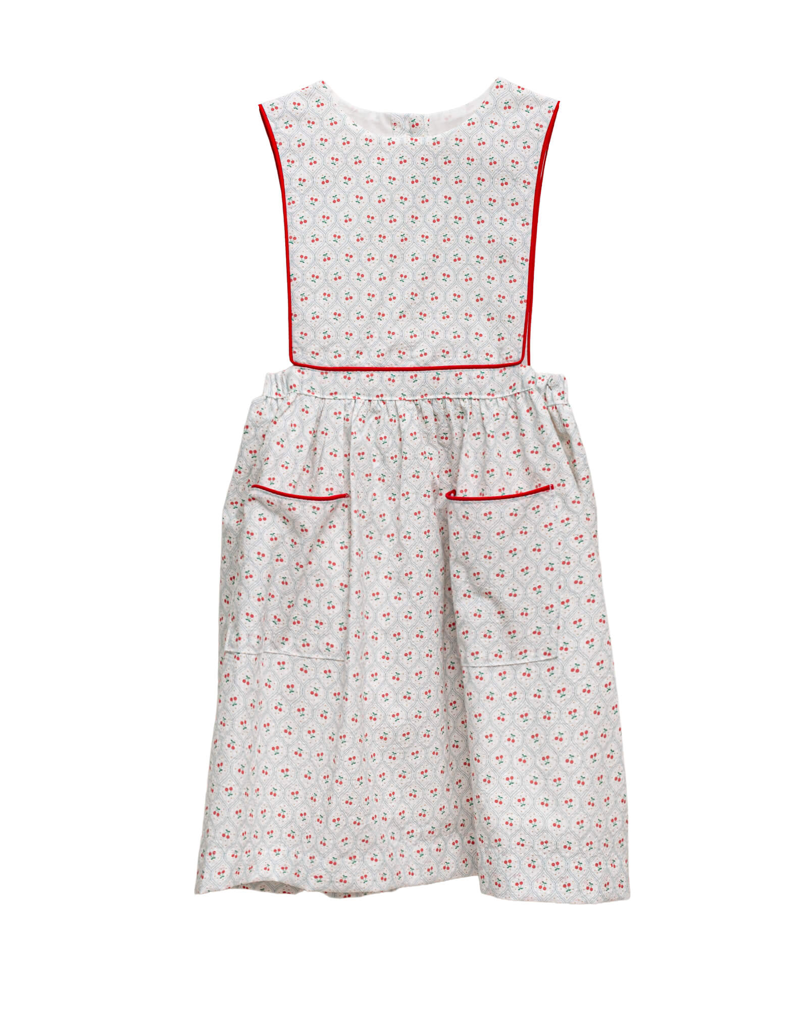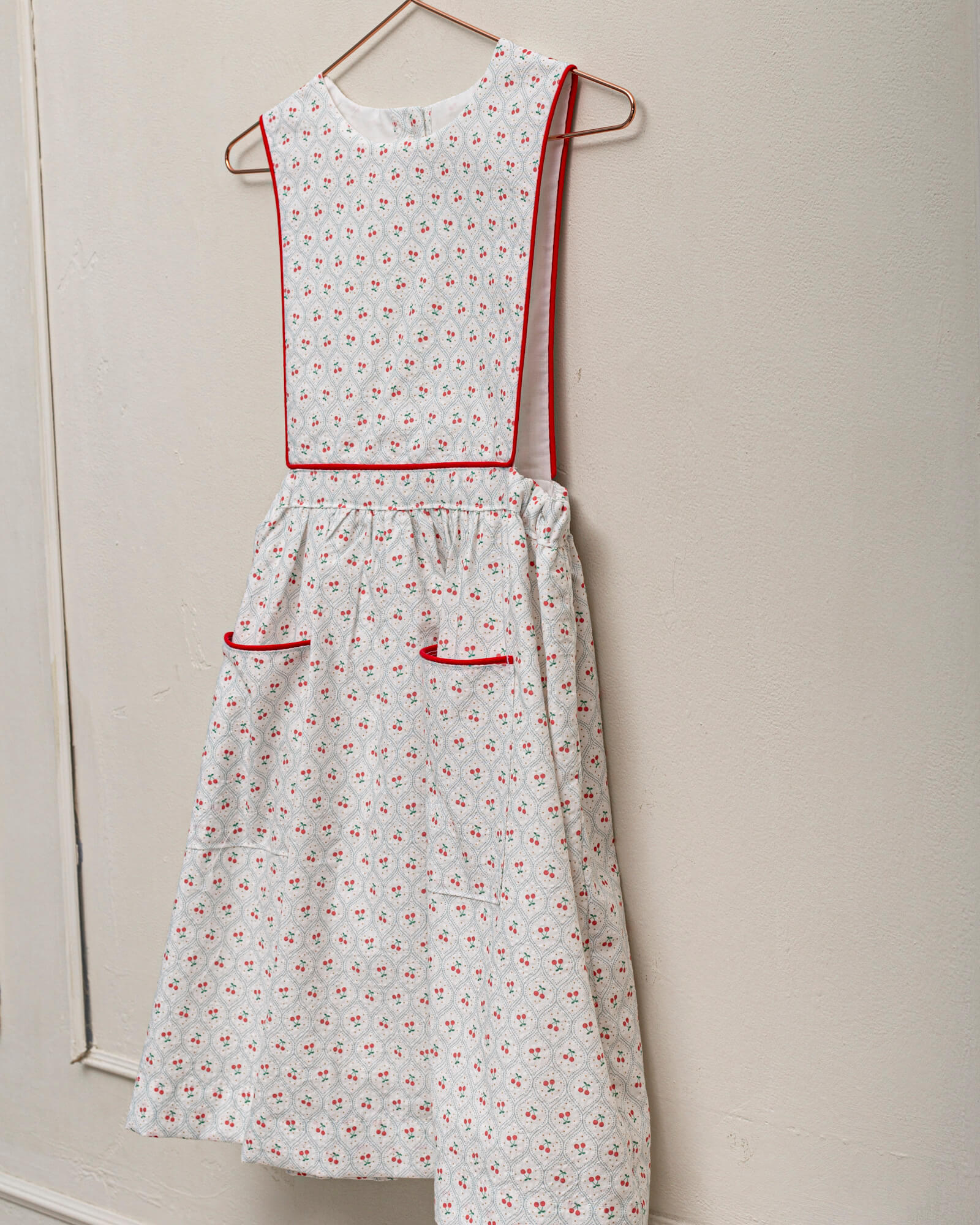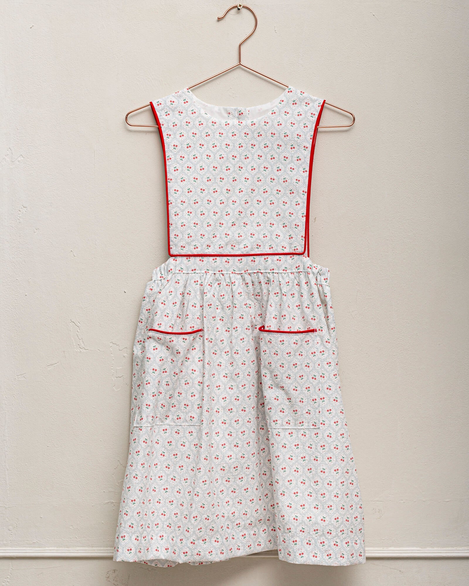 You’ll love this white pinafore dress with a cherry print. It features contrasting red piping on the bodice and pockets. Perfect for a casual summer day or as a guest outfit for a special occasion, a wedding, or a First Communion.