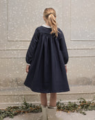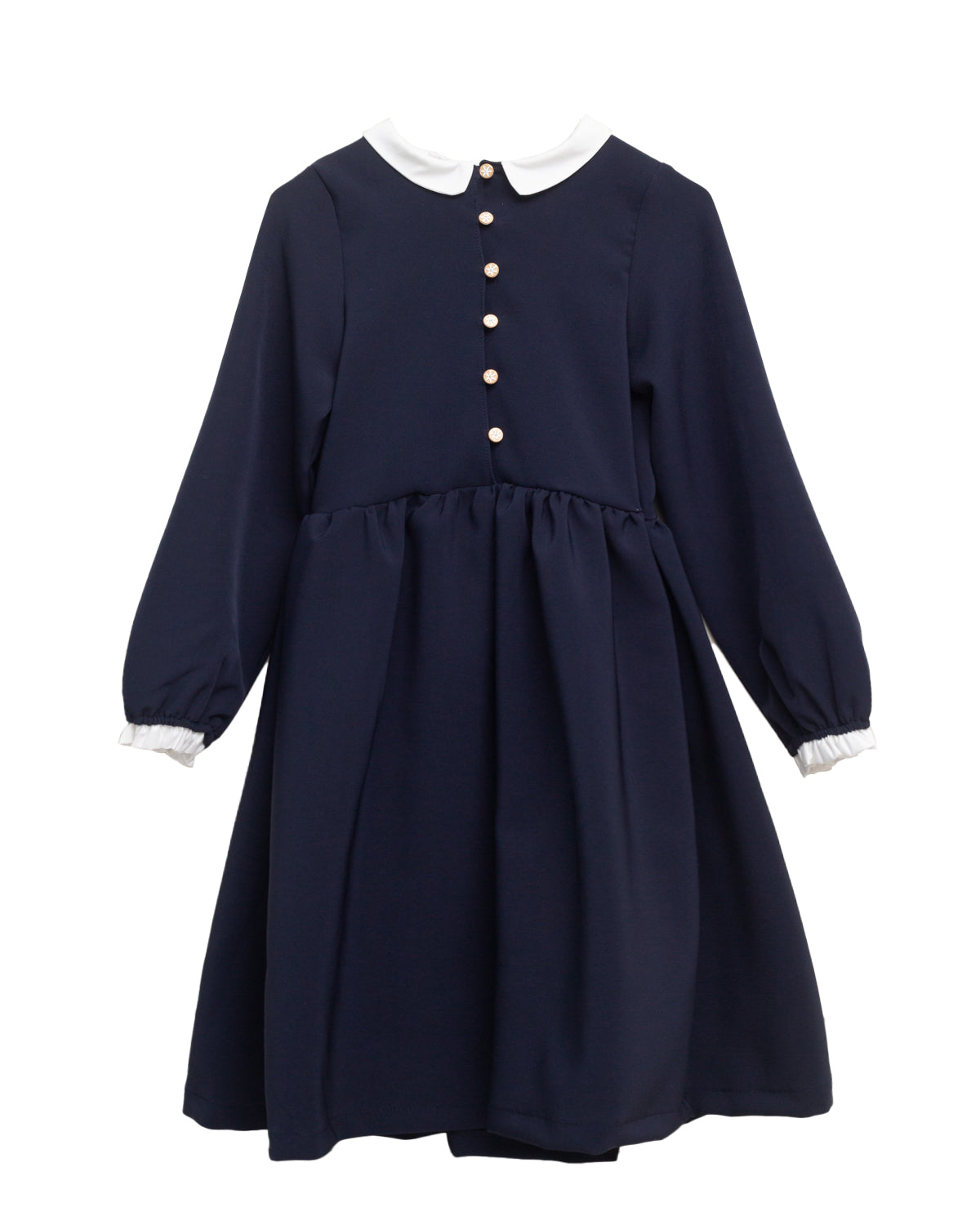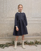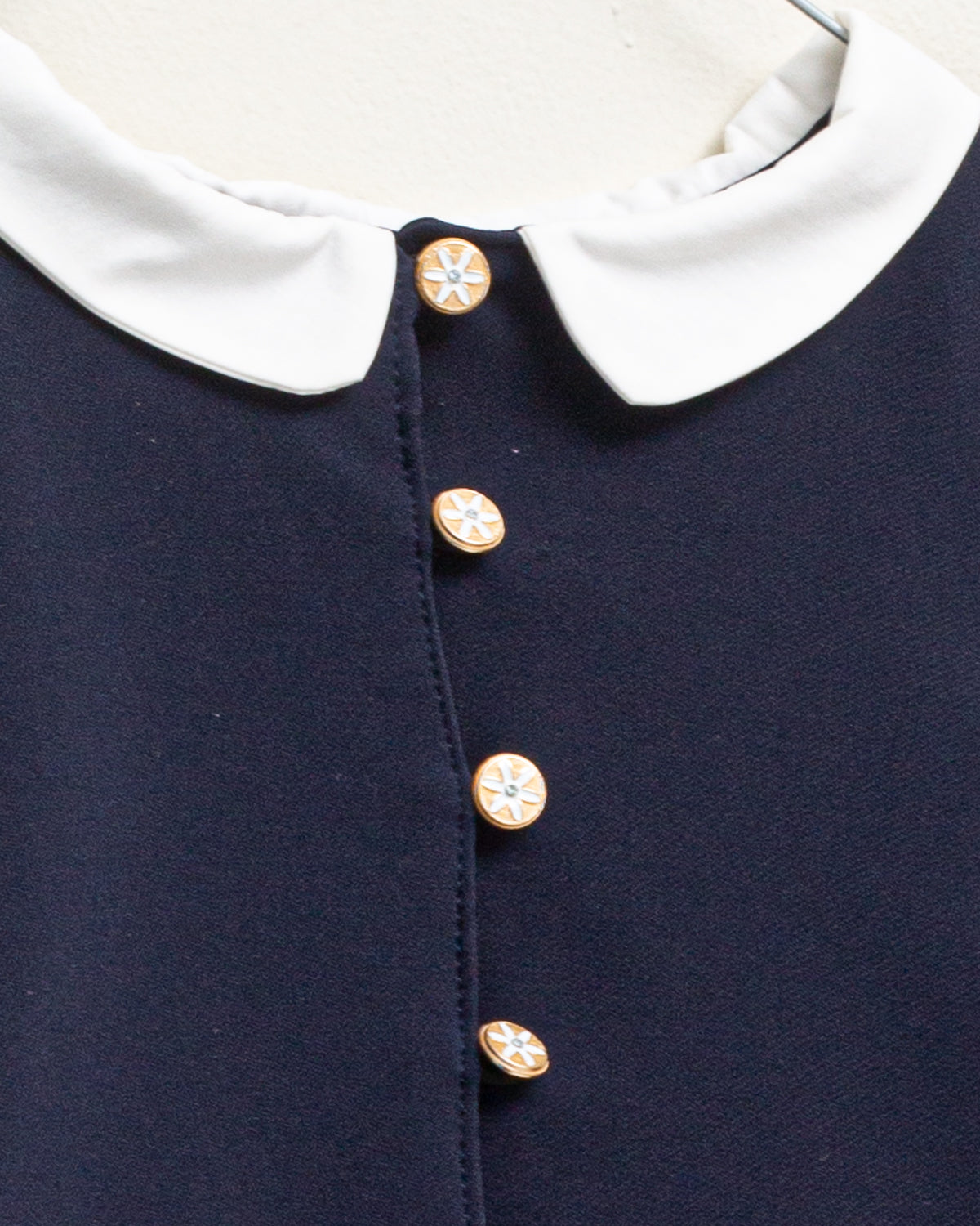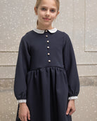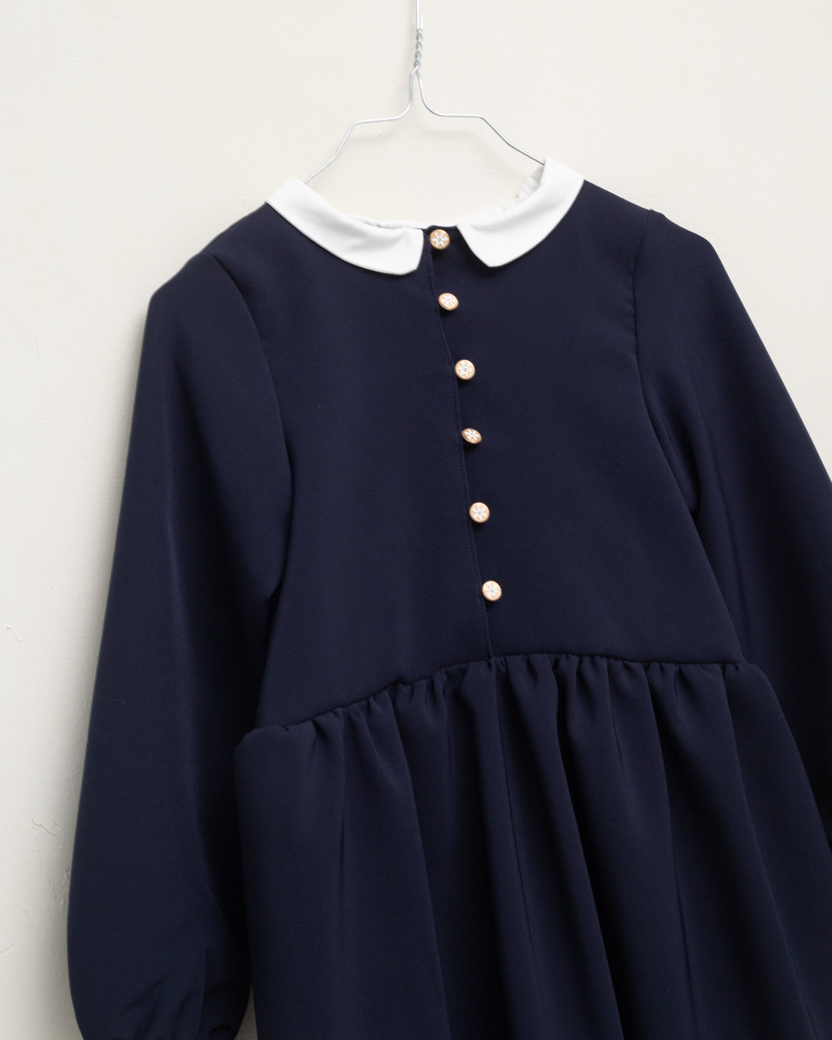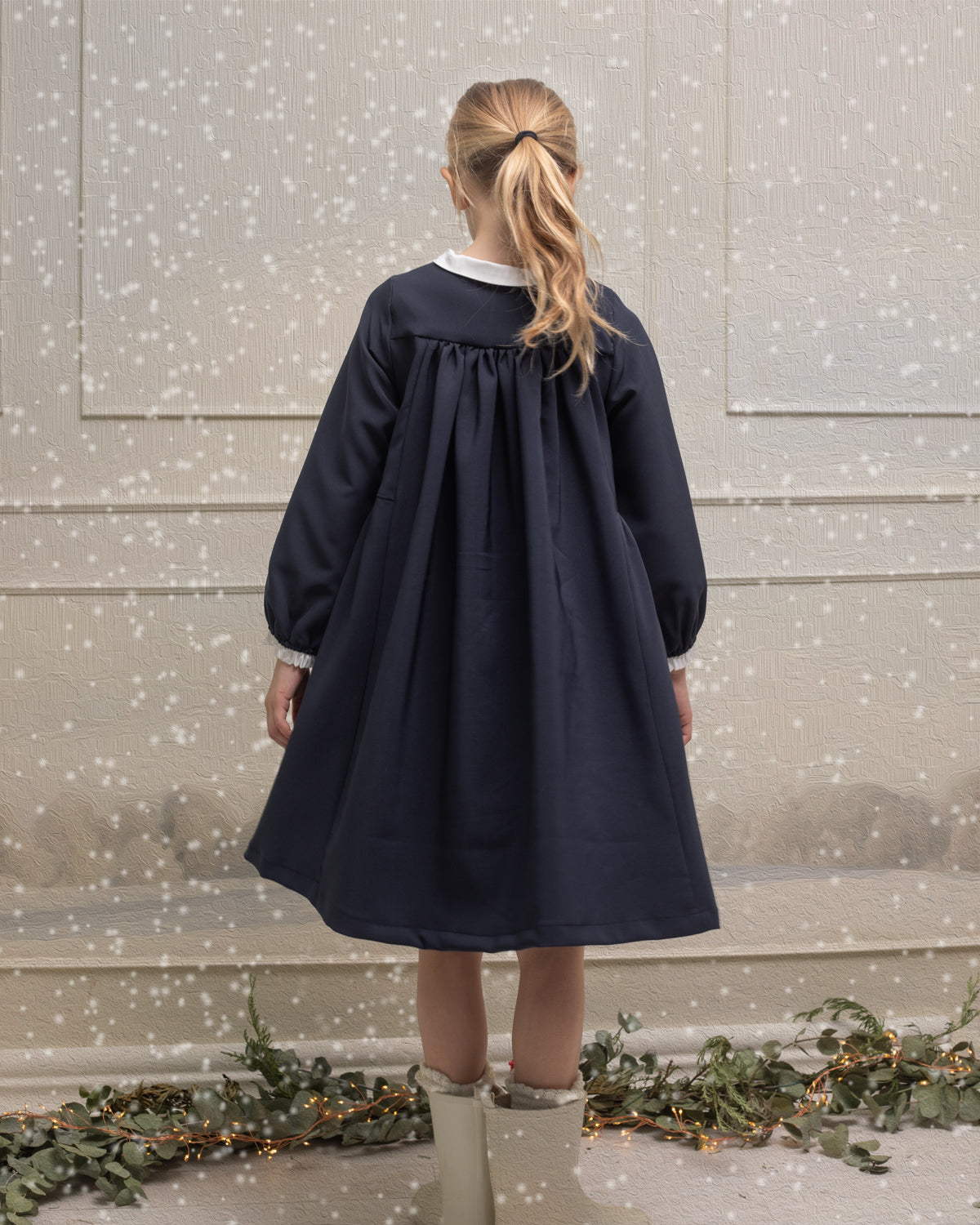 We adore the Leonor dress in blue crepe with a contrasting white shirt collar. The golden jewel buttons with white floral details give this dress a vintage touch that makes it truly special. Don’t miss the spectacular design with a layered back.