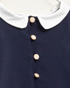 Nos encanta el vestido Leonor en crepe azul con cuello de camisa blanco a contraste. Sus botones joya en dorado con una florecita blanca le dan un toque vintage que hace que el vestido sea realmente especial. No te pierdas su espectacular patrón con espalda en capa.