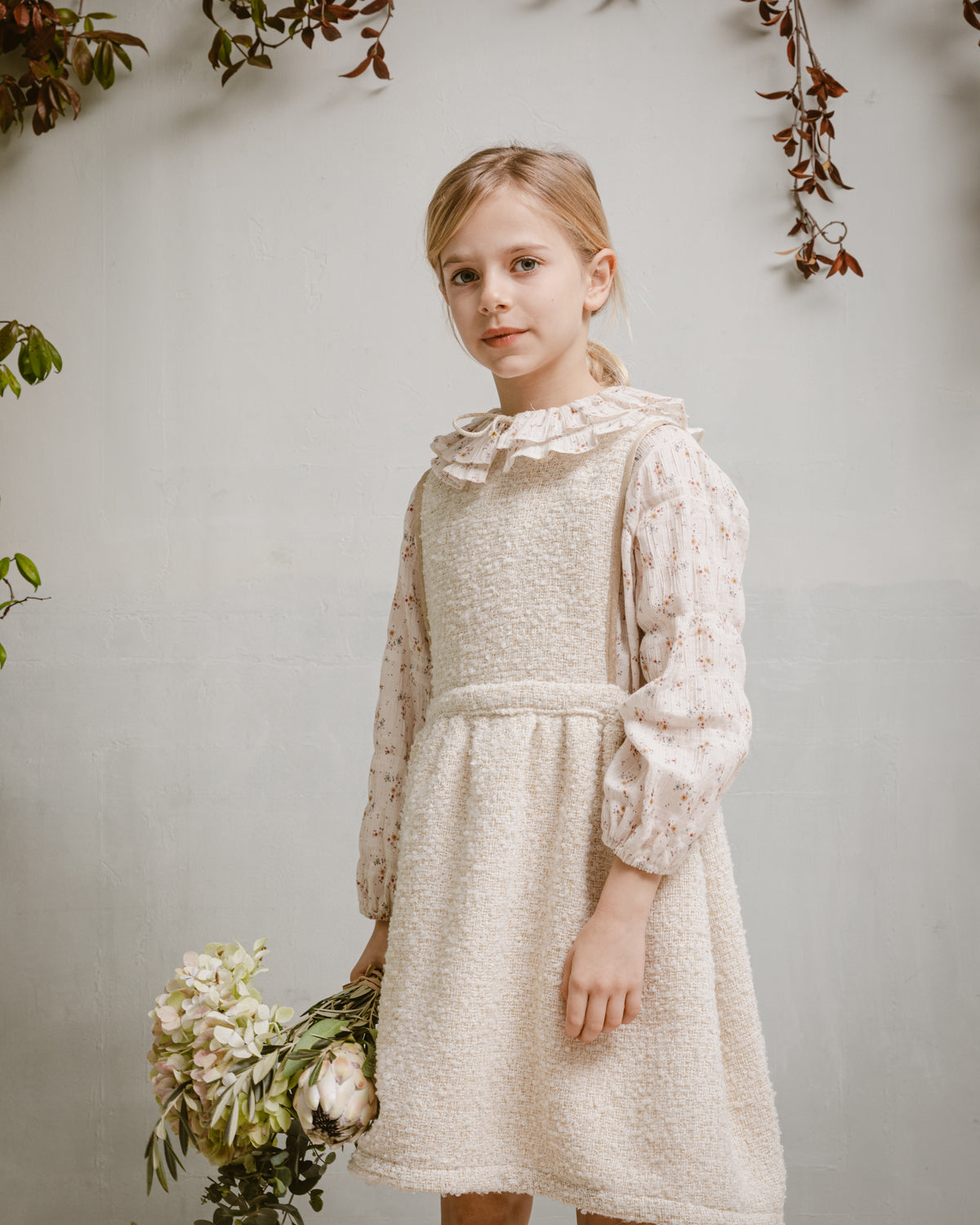 Pinafore dress in tweed fabric with a touch of gold lurex. Contrasting gold ribbon detail on the chest. Elastic waist on the sides to adjust the dress. Opening in the back in a teardrop shape with a button. Lined in 100% Cotton. Made in Spain.