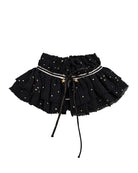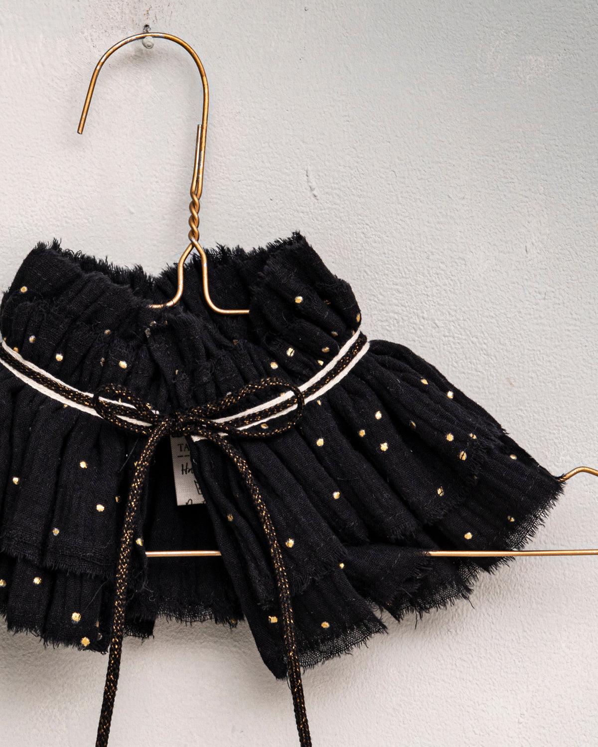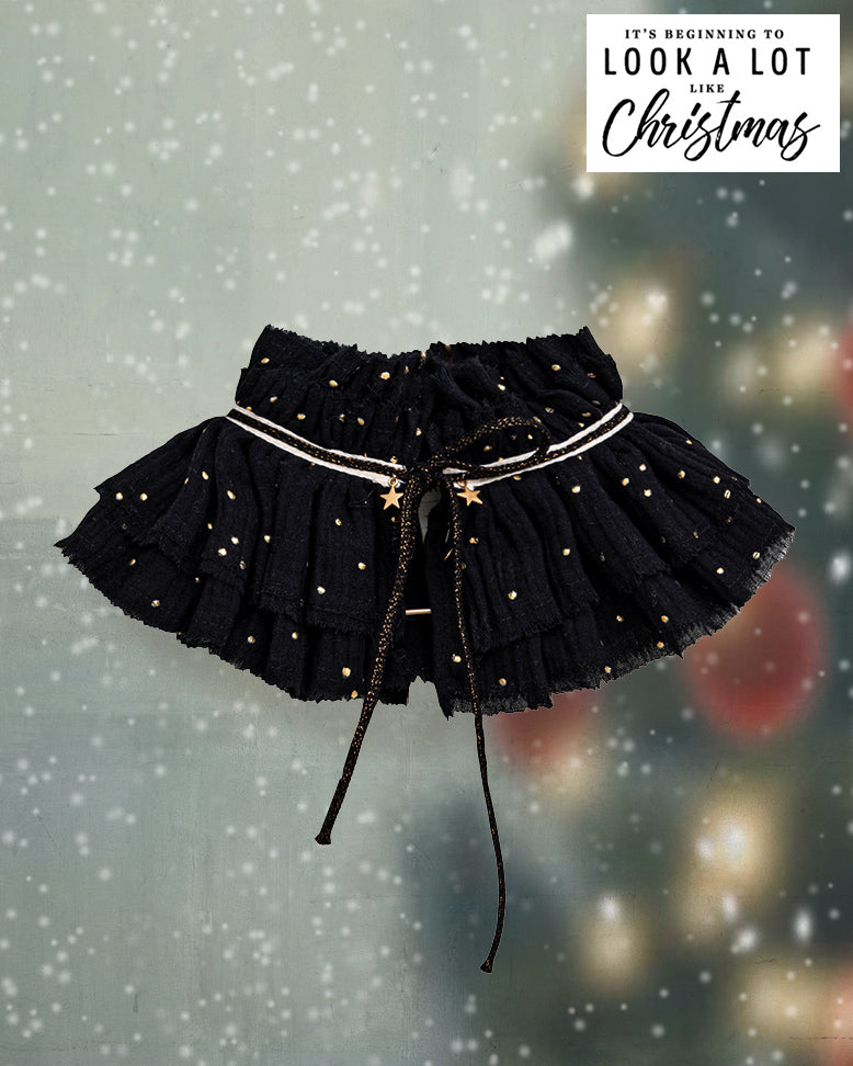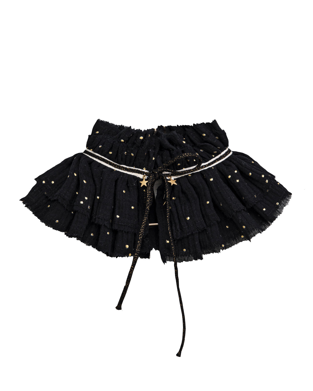 The most romantic and delicate of our collars gives a special touch to any blouse, sweater, or dress. The Sagan Collar has two layers of gathered fabric with black and gold ribbon detail. It is tied at the neck with a bow. We love the two pom-poms and the gold stars.