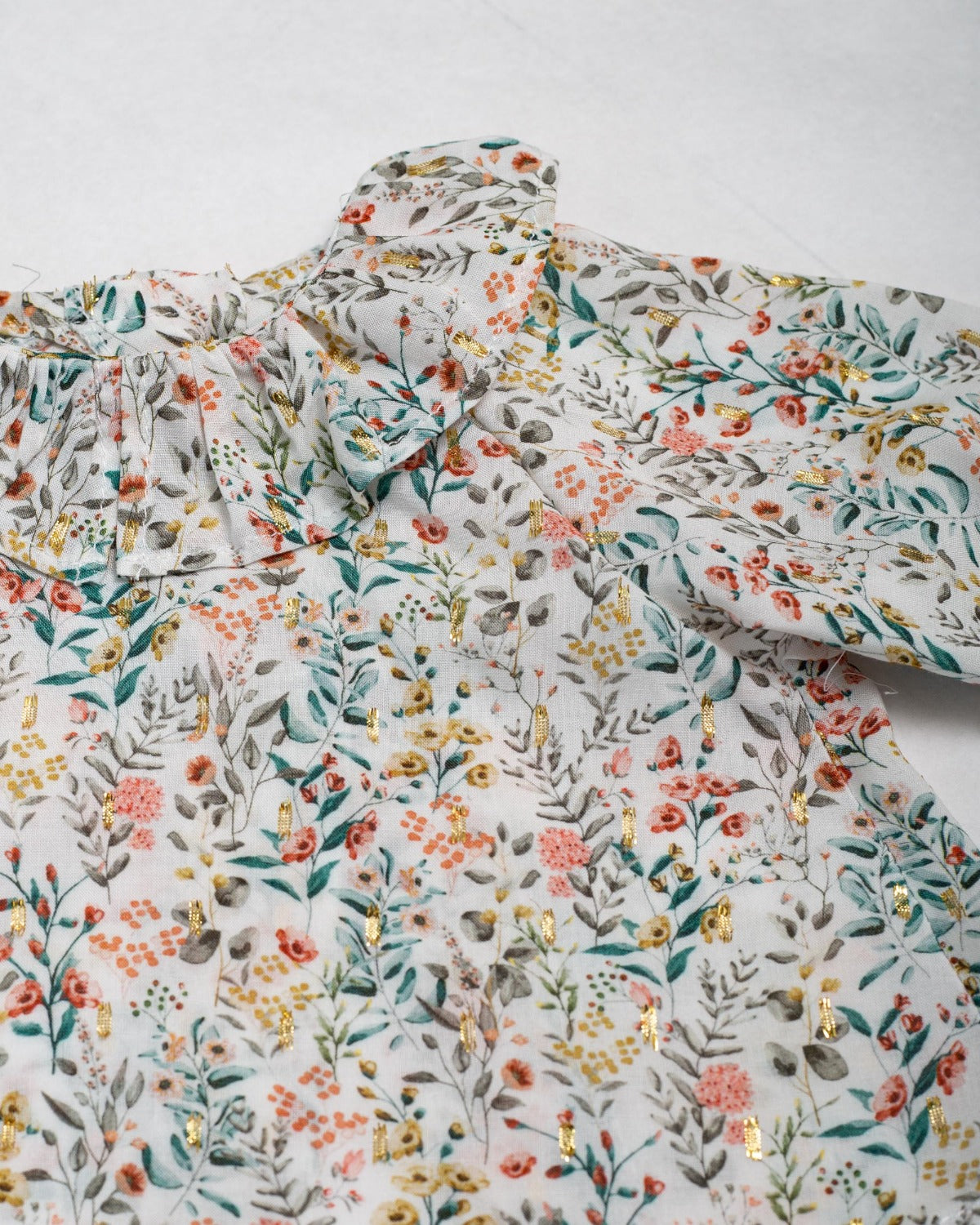 1. A shirt in light fabric with an evasé cut, closed in the back with buttons, long sleeves with an elastic finish, and the cutest baby doll neck.