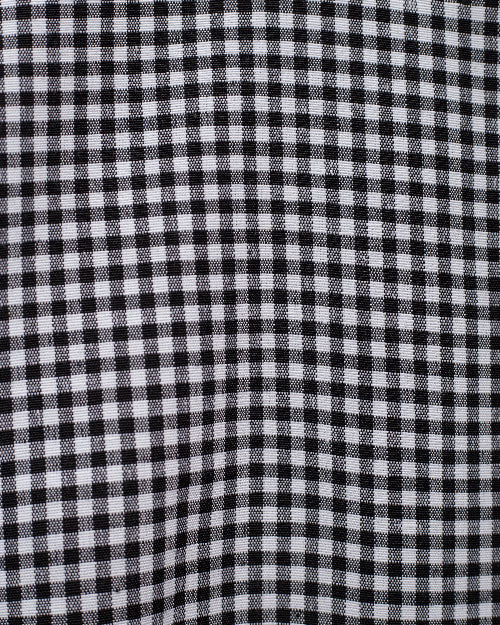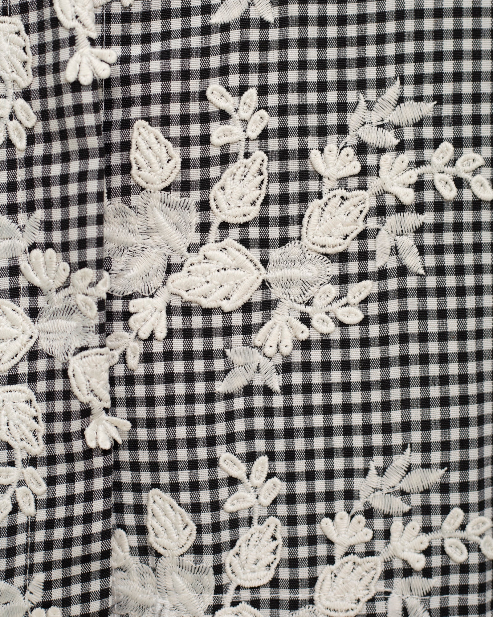 The Dauphin set in black-and-white gingham brings together two stylish pieces. The skirt, enhanced with contrasting floral embroidery, offers a romantic and refined touch. The blouse, in the same fabric but without embroidery, features delicate ruffles at the collar and cuffs for a harmonious and versatile look. Worn together they create the perfect ensemble, yet each piece can also be styled on its own.