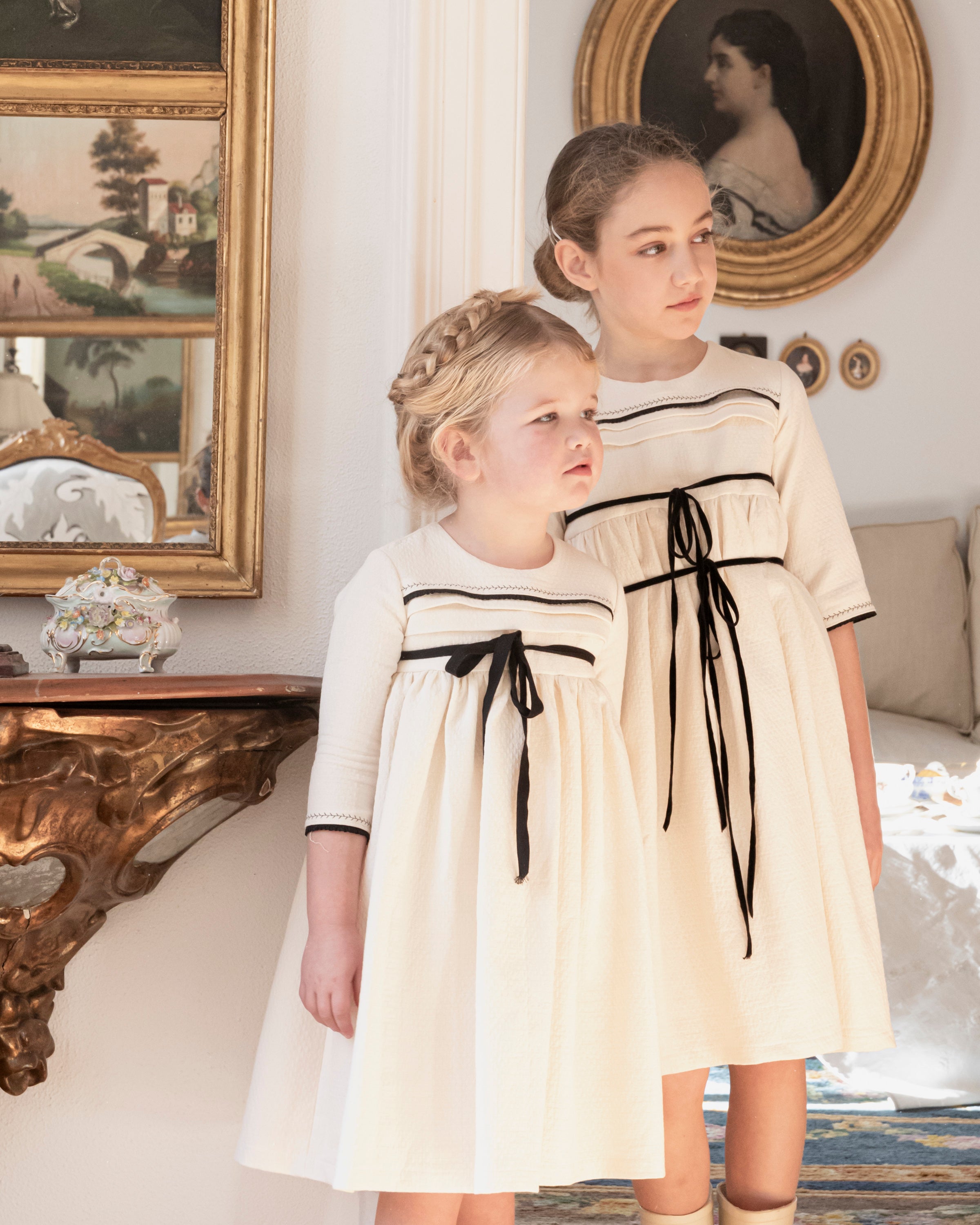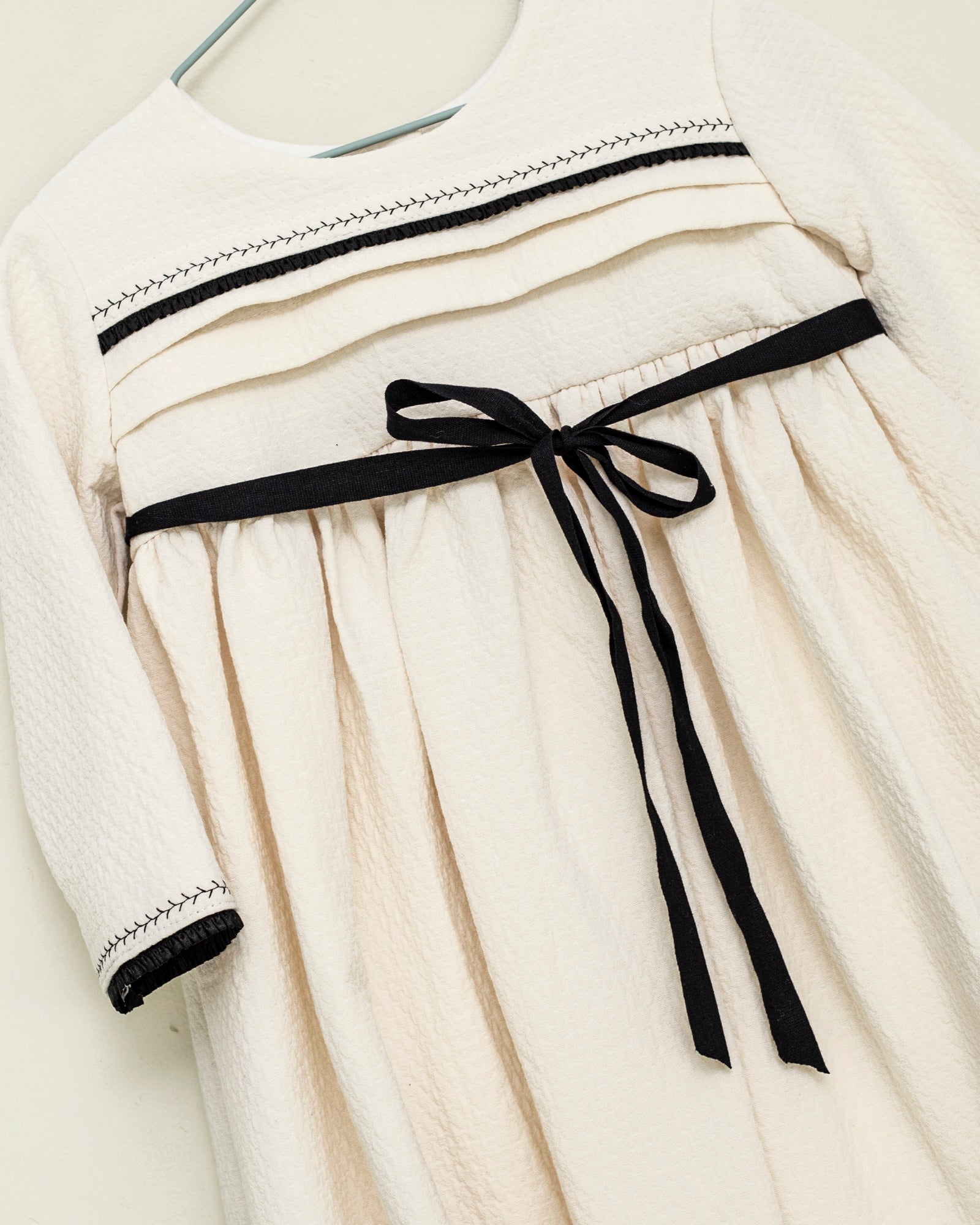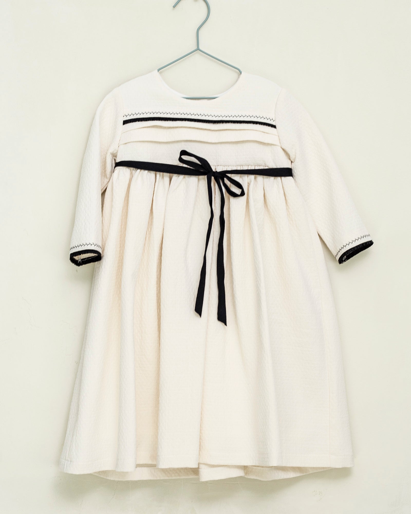 The Palais dress is made of cotton with a delicate diamond quilt that adds texture and sophistication. It features black embroidery on the chest and cuffs, as well as a contrasting bow at the front. From size 8 onwards, it also includes an additional bow at the waist to enhance the silhouette. An elegant and timeless piece for the most special occasions.