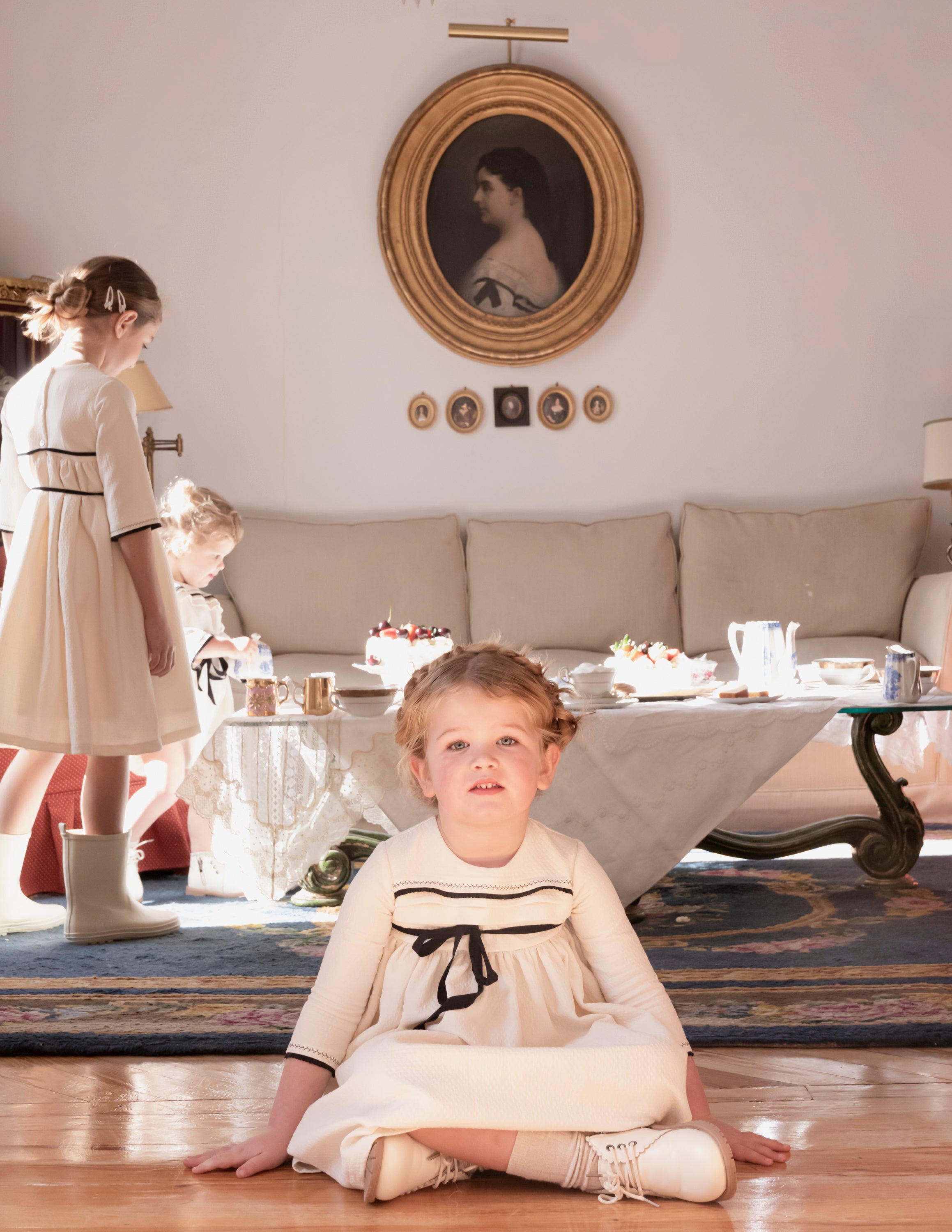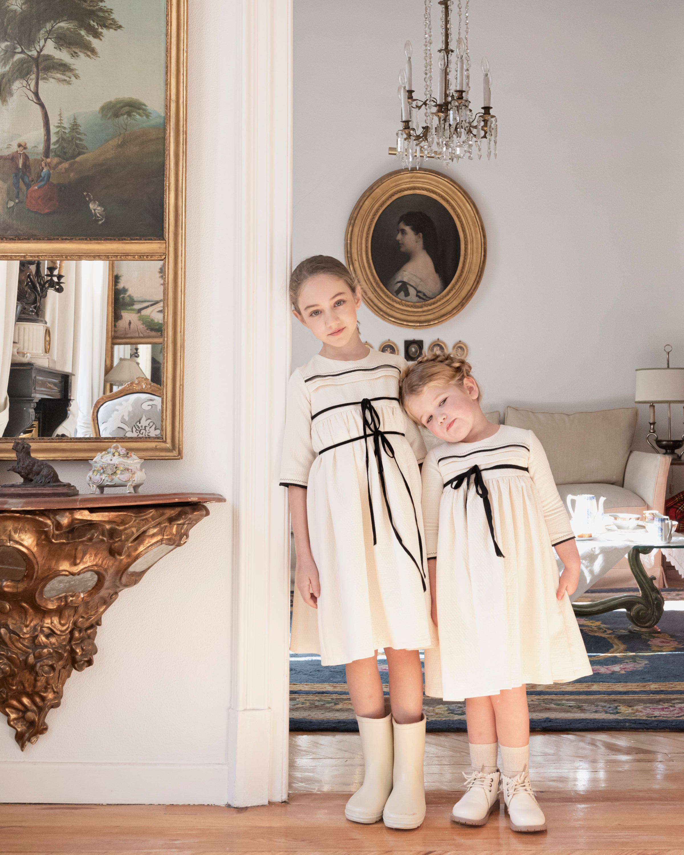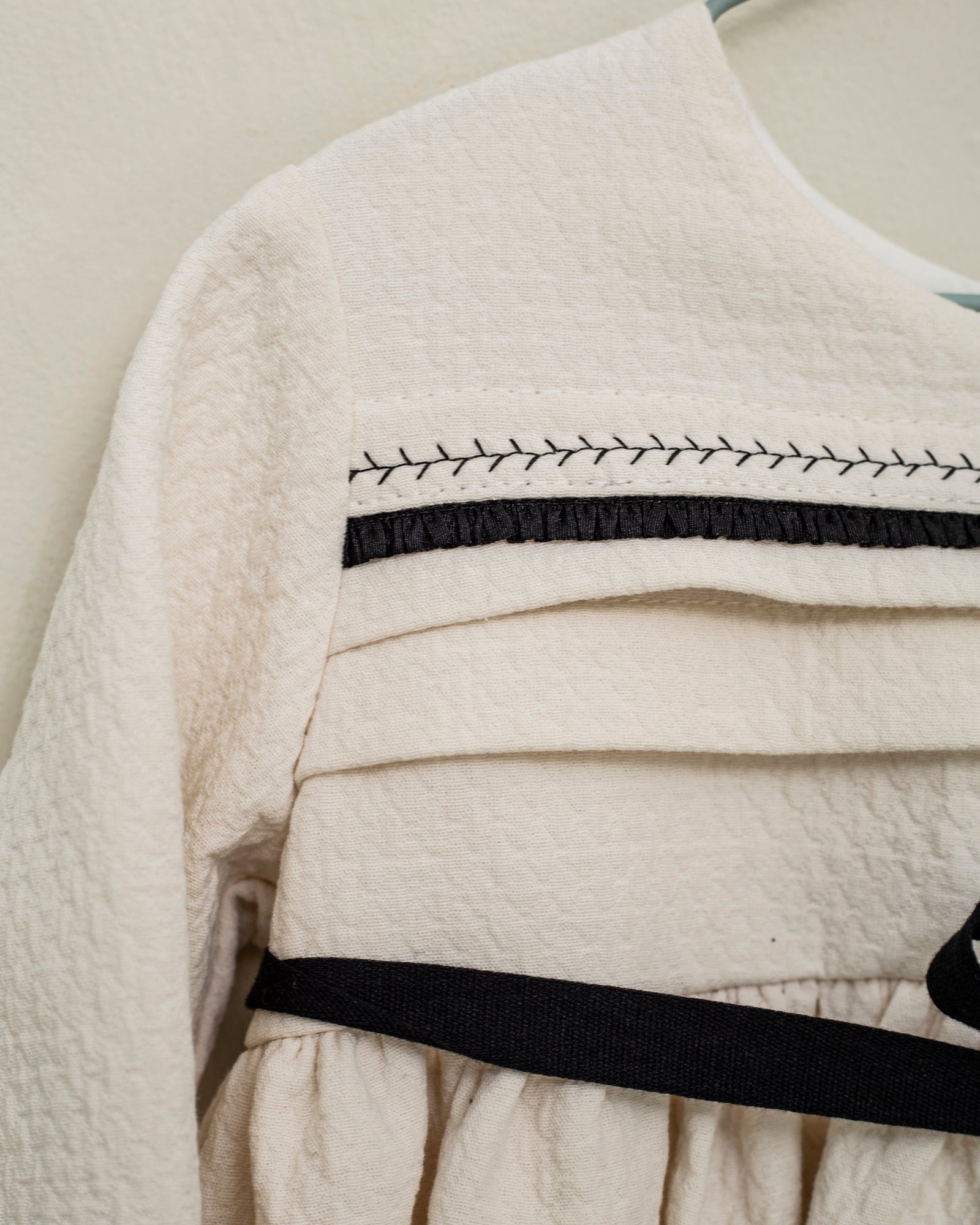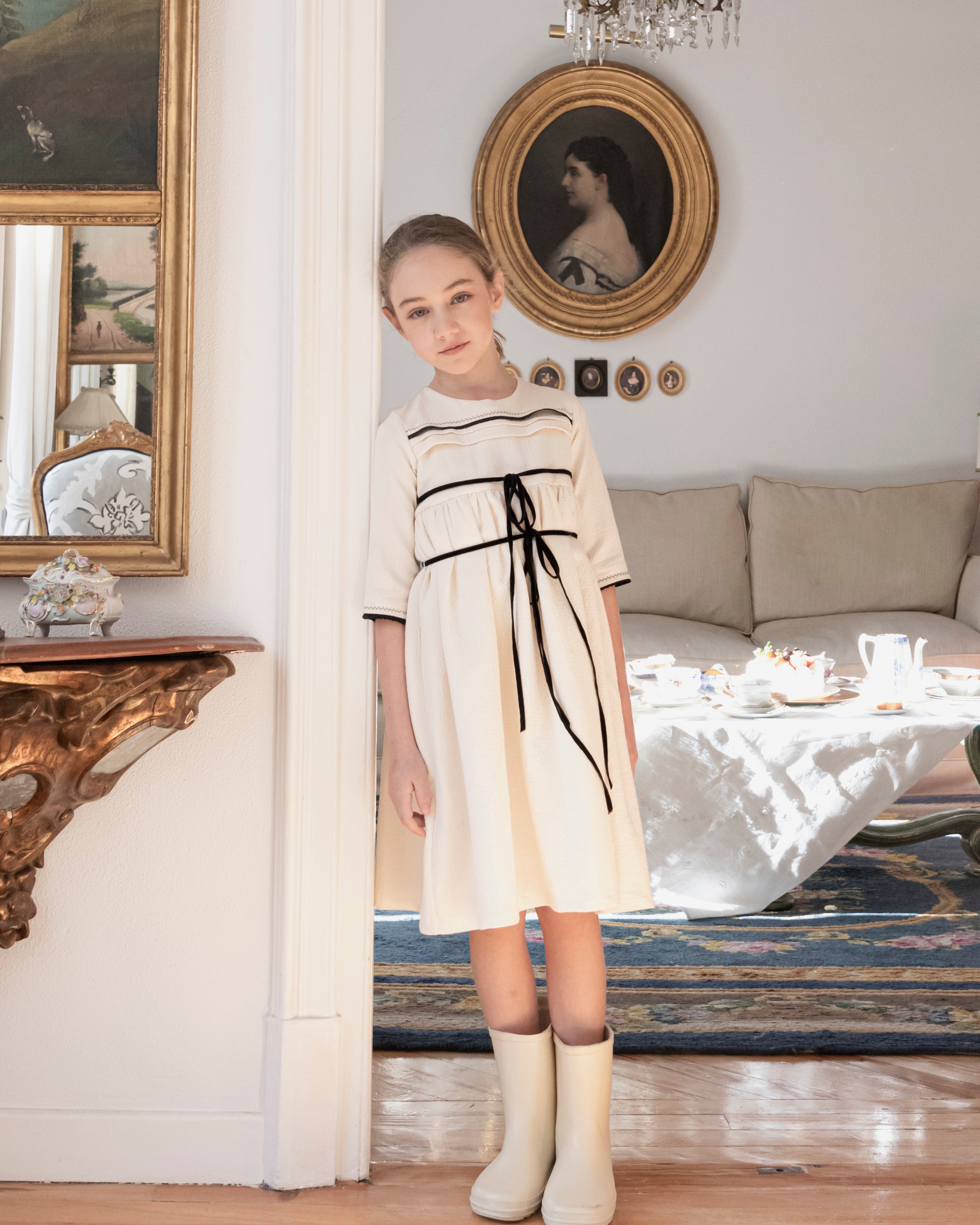 The Palais dress is made of cotton with a delicate diamond quilt that adds texture and sophistication. It features black embroidery on the chest and cuffs, as well as a contrasting bow at the front. From size 8 onwards, it also includes an additional bow at the waist to enhance the silhouette. An elegant and timeless piece for the most special occasions.