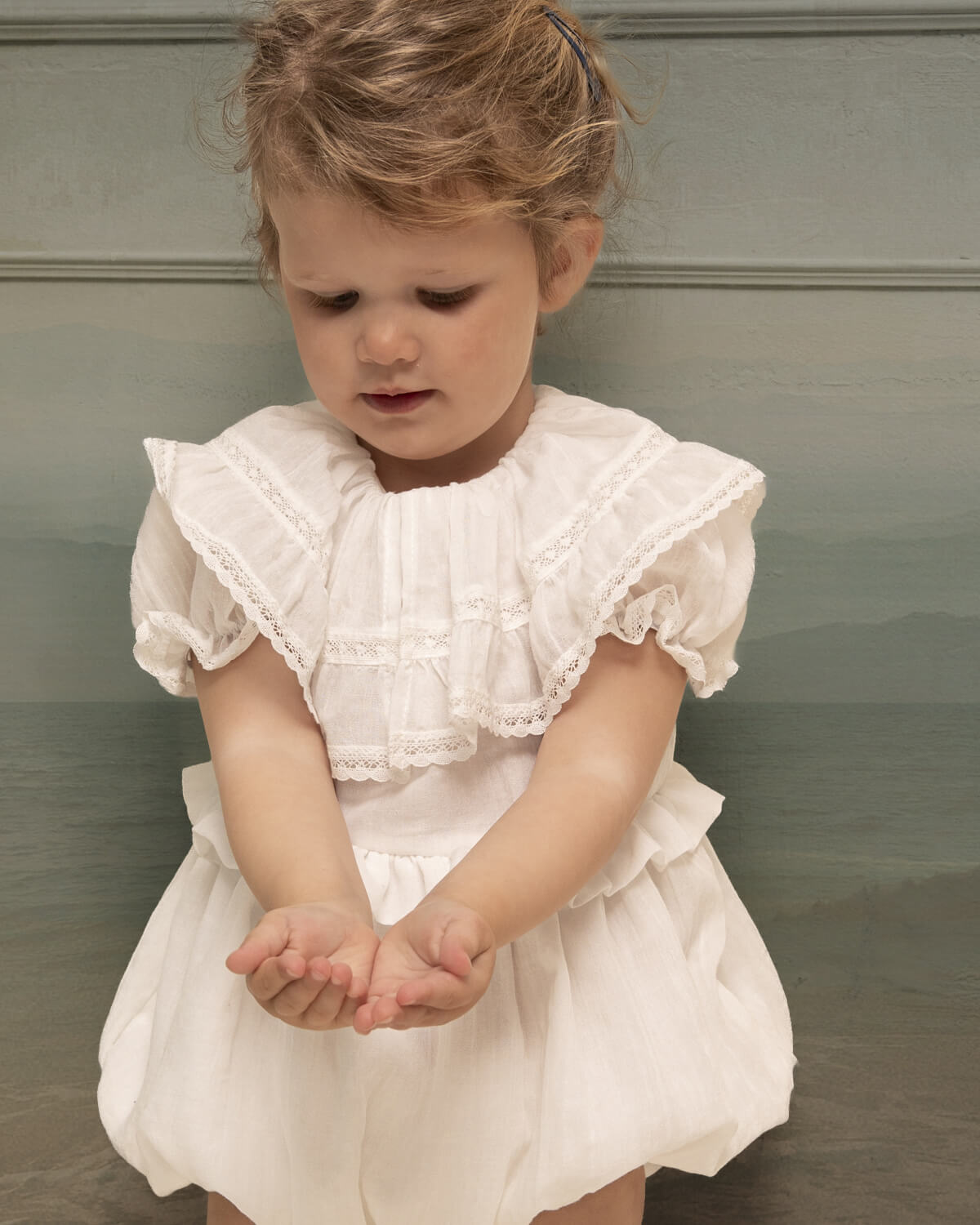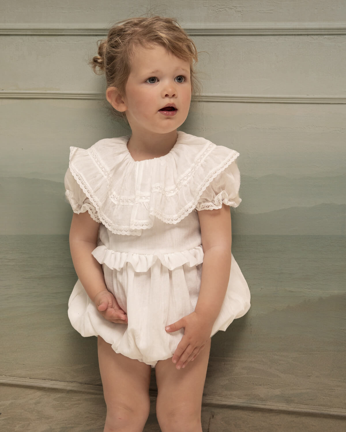 Our Yves baby romper is both original and romantic. We adore its large double-ruffle collar with cotton lace details. It features a small ruffle at the waist for an extra vintage and charming touch.