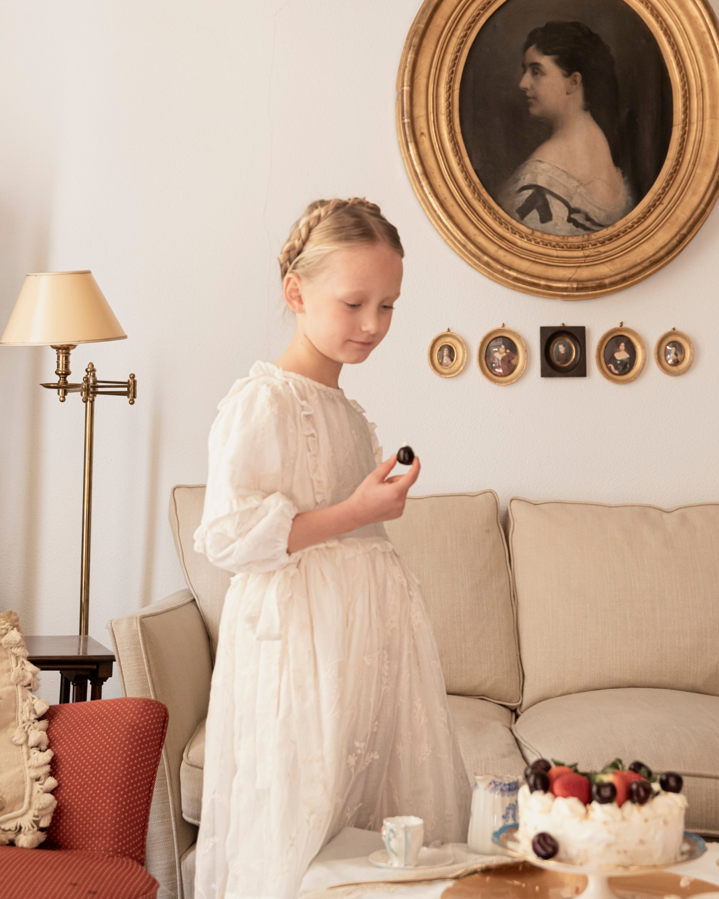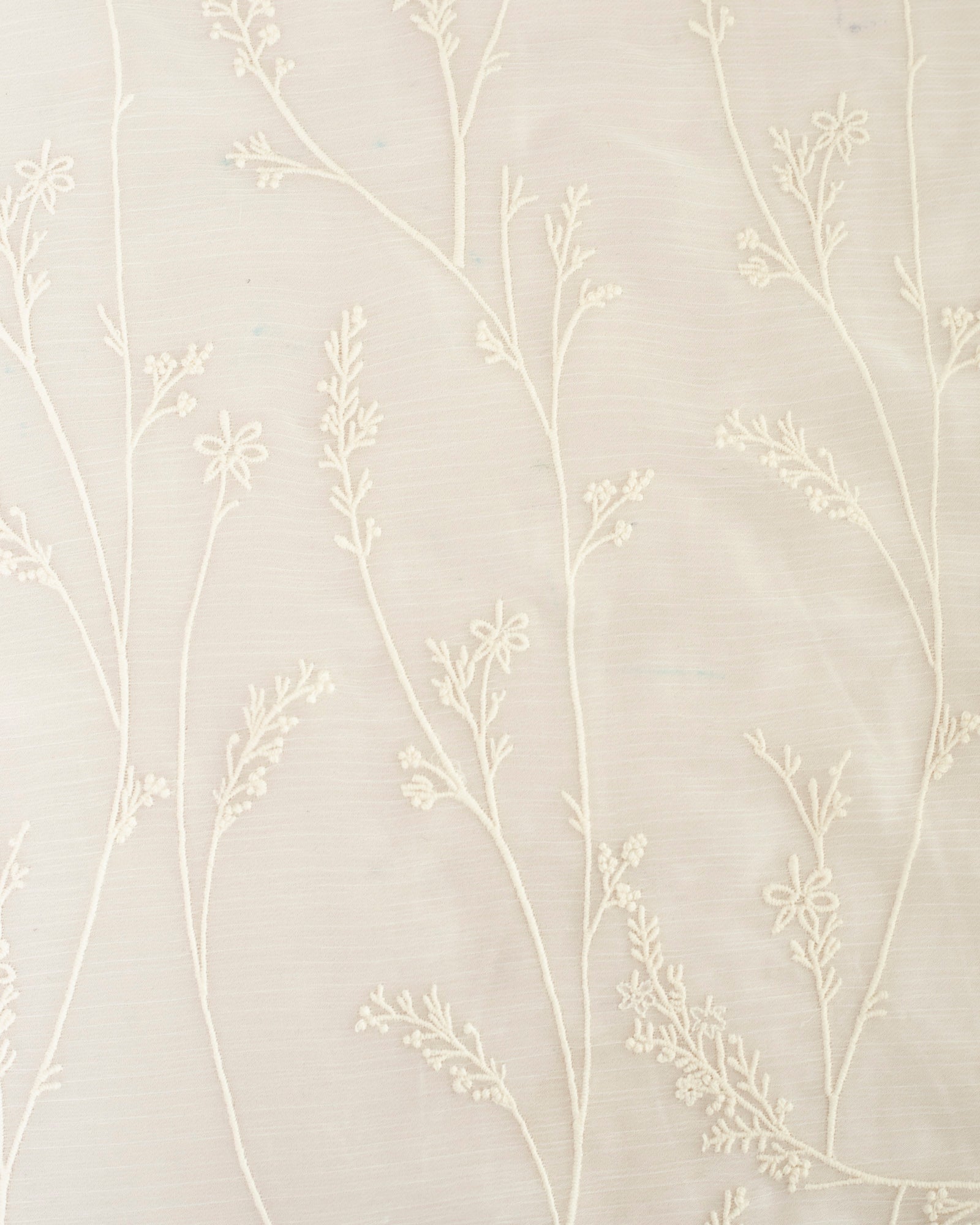 The Ember dress is crafted in embroidered polyester chiffon in a soft ivory tone, giving it lightness and sophistication. Vertical ruffles along the bodice and side ties delicately enhance the silhouette. With three-quarter sleeves featuring gathered details and a wide flowing skirt, it is a romantic and timeless piece, perfect for special occasions.