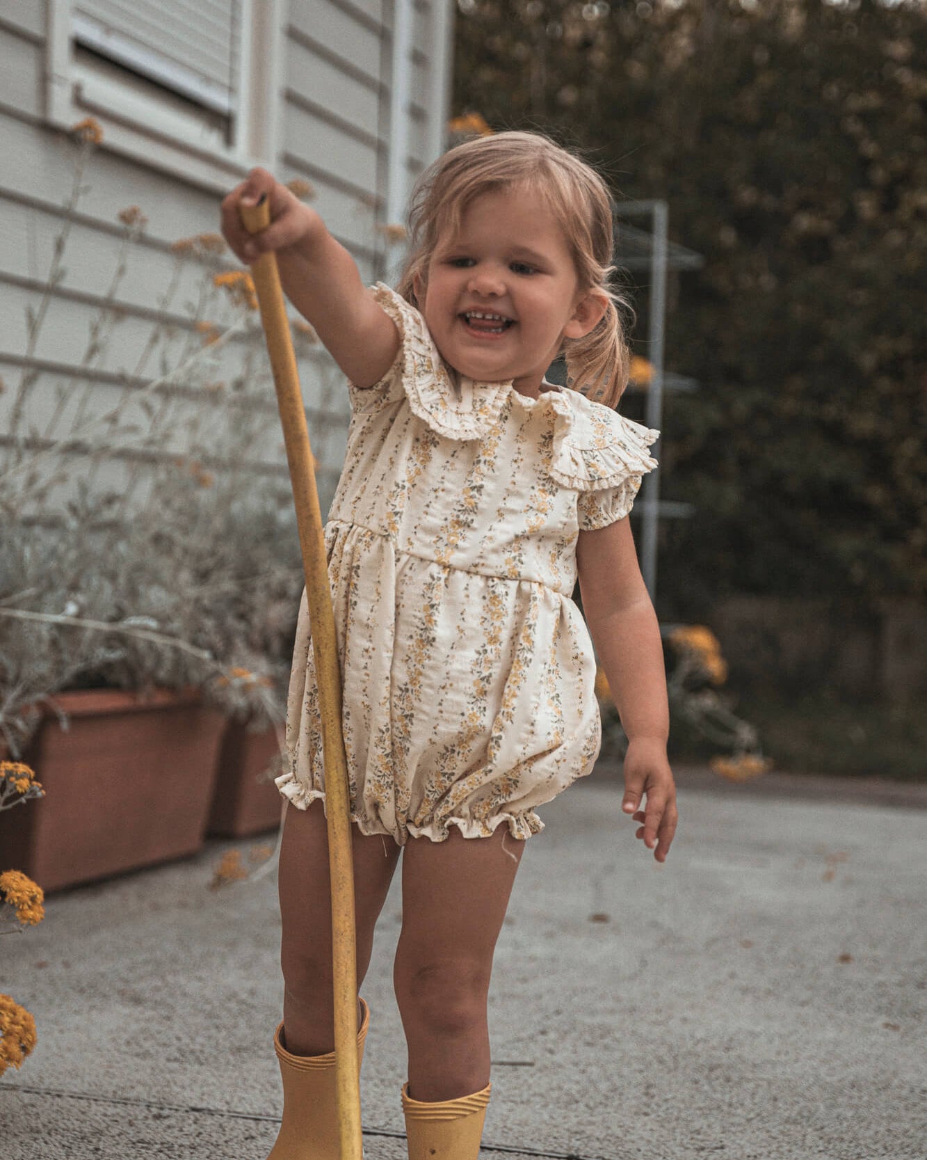 Baby romper made from crinkled cotton fabric. It features a large collar with beige lace details and fastens with buttons at the back and between the legs for extra comfort. Perfect for a special occasion, such as a christening, a First Communion, or a wedding.