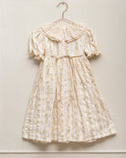 Made from a beautiful yellow fabric with tiny floral prints, you’ll fall in love with its lovely cotton lace ruffled collar.