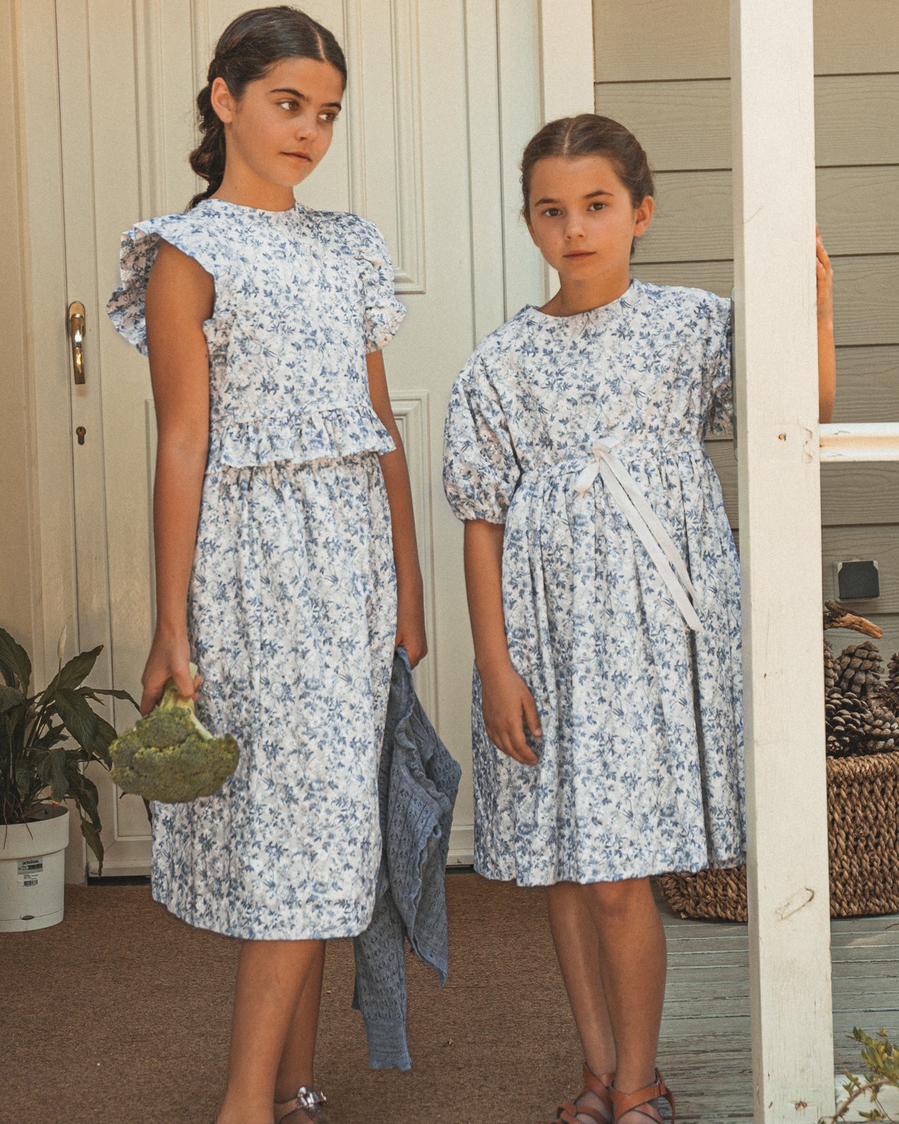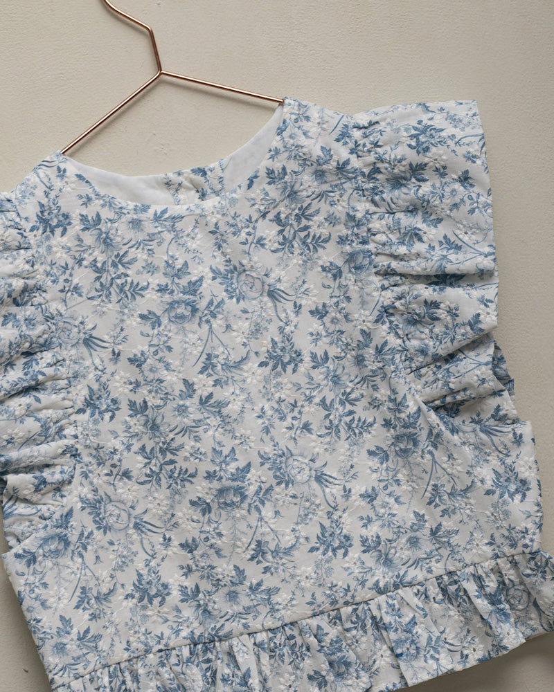 Perfect for a special occasion, our Koala set features a blouse with ruffles on the chest and a matching midi-length skirt. Made in embroidered batiste with a floral print in shades of blue.