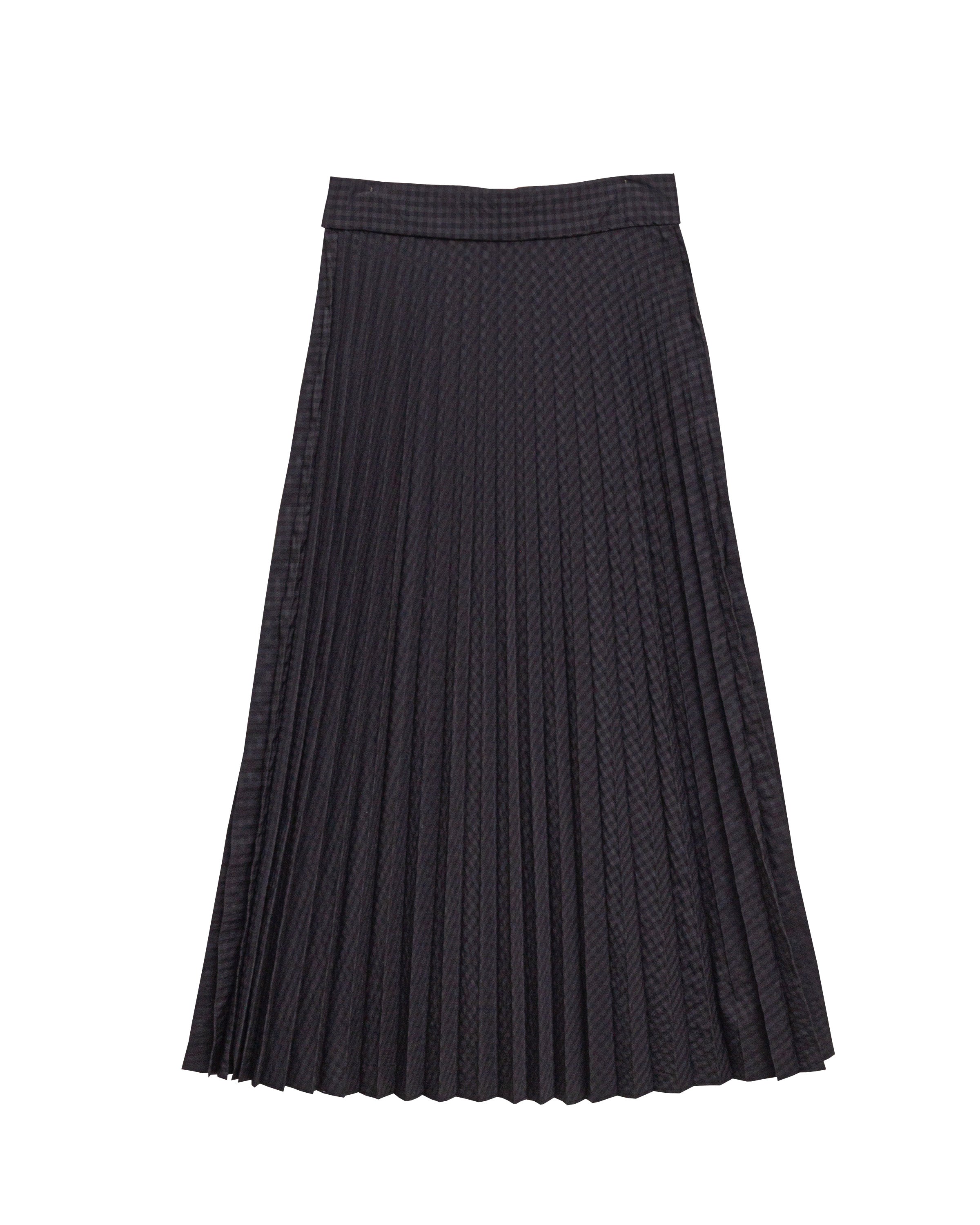 The Soleil skirt is crafted from a lightweight black fabric with a subtle geometric design that enhances the texture and flow of its pleats. Its midi pleated silhouette offers sophistication and versatility, perfect for both formal occasions and more casual looks. A timeless piece that combines style and comfort.