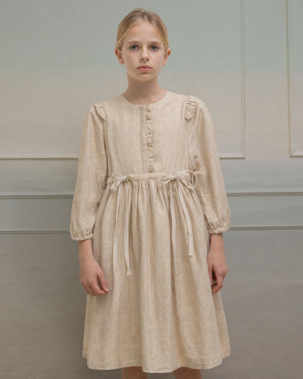 El vestido Royal está confeccionado en un tejido con hilos dorados que aportan luz y un aire elegante a la prenda. Su diseño incluye pequeños volantes en los hombros y lazadas en la cintura que realzan su silueta, además de un delicado fruncido en las mangas. Una pieza especial y festiva, perfecta para ocasiones señaladas.