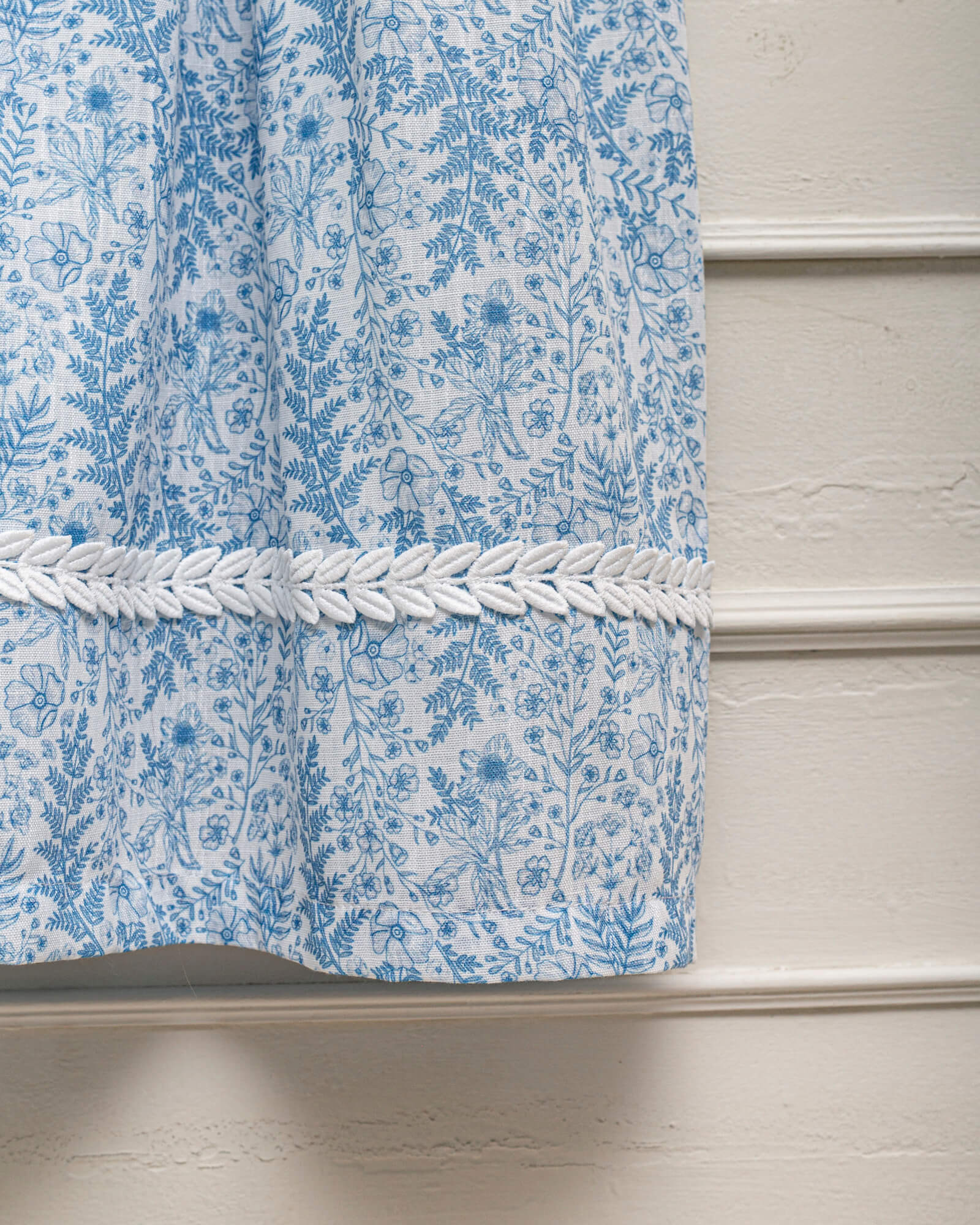 Vestido de tirantes en un precioso estampado de flores azul con detalles de encaje de guipur en el pecho y el bajo de la falda.