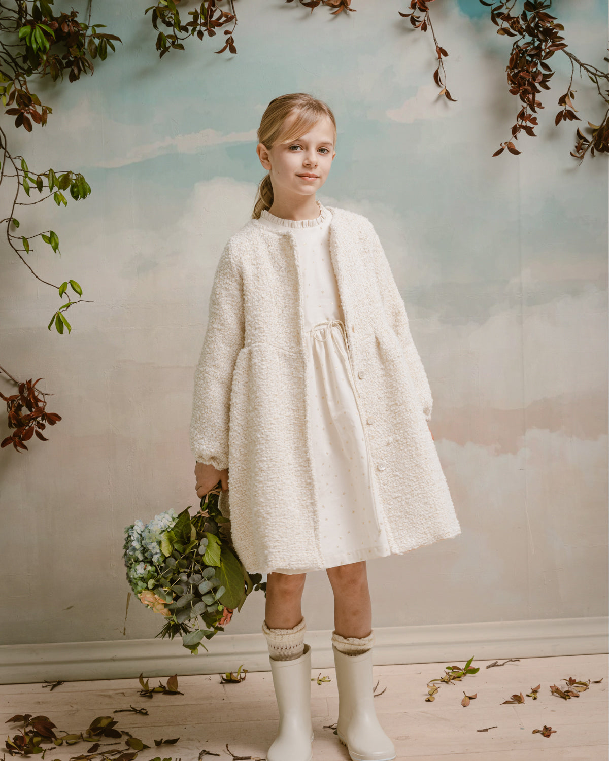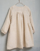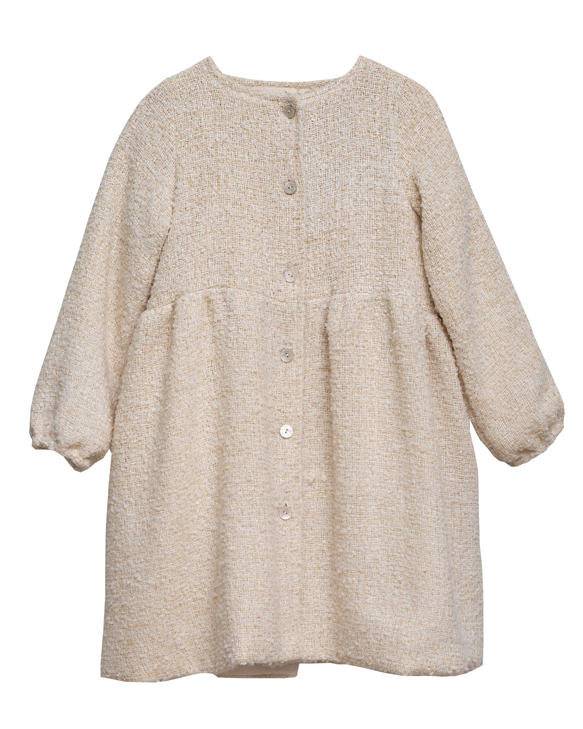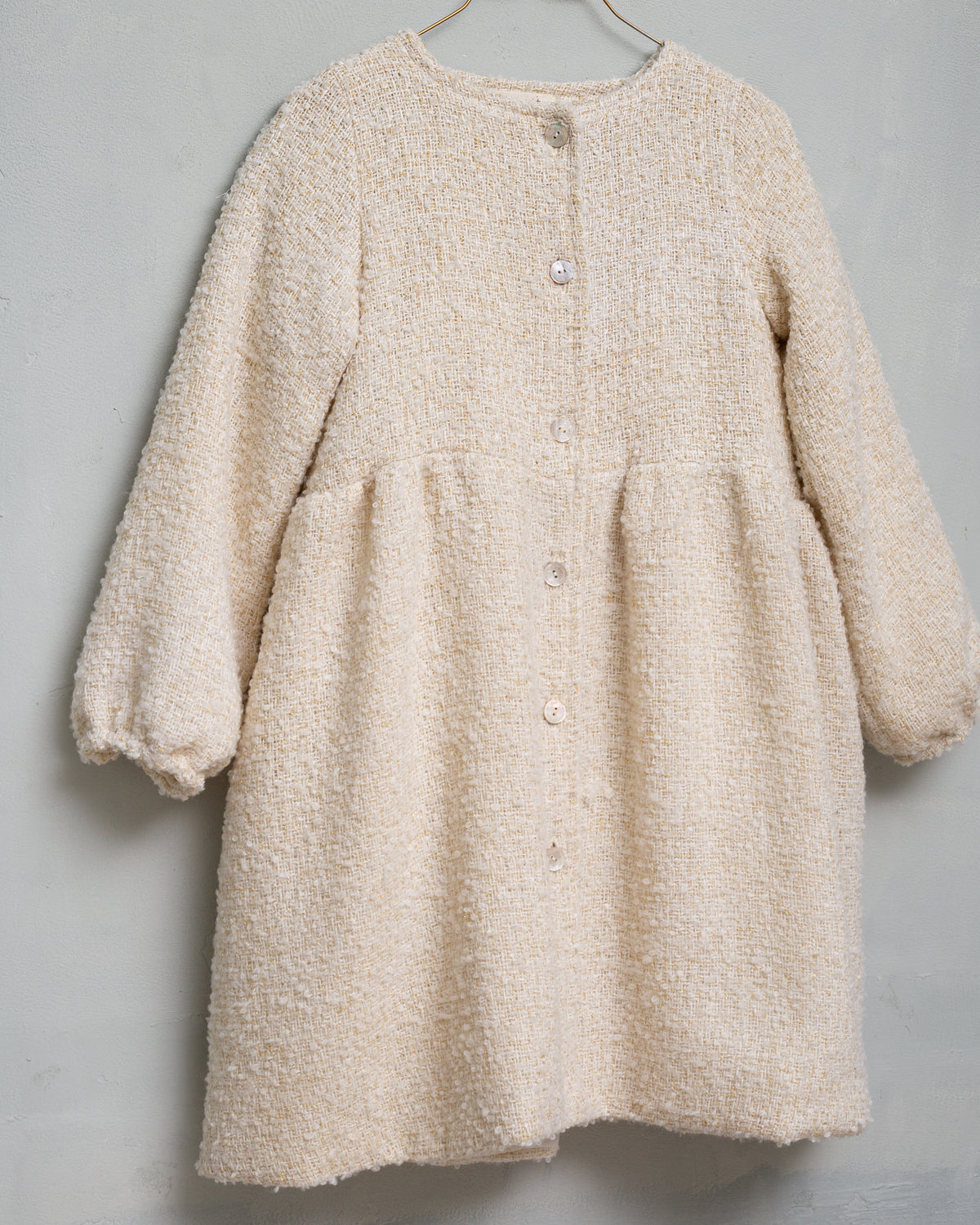 A beautiful coat made in a very warm Tweed in ecru with touch of gold. Lined in organic cotton. Volume sleeves with elastic cuff. You will love the gathered back with a 60,s touch. Perfect for a casual day or special occasion.