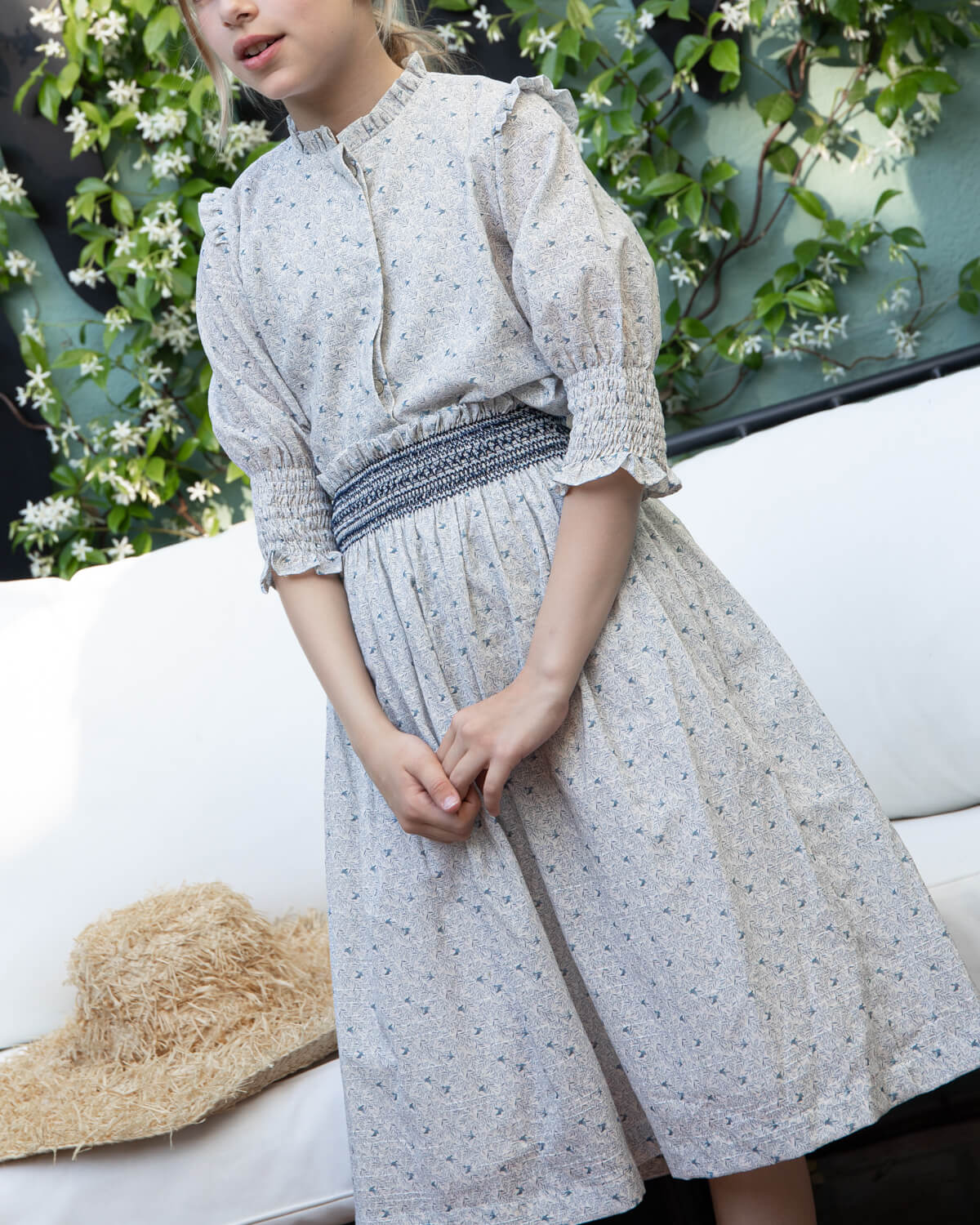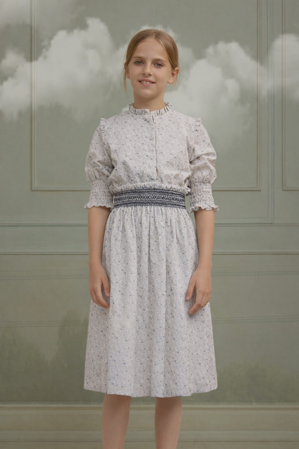 La blusa Cala tiene cierre delantero con botones ocultos, sencilla y elegante. La falda Nido lleva cintura elástica con textura tipo nido de abeja en azul marino, lo que hace que se ajuste bien y resulte muy cómoda para las niñas.