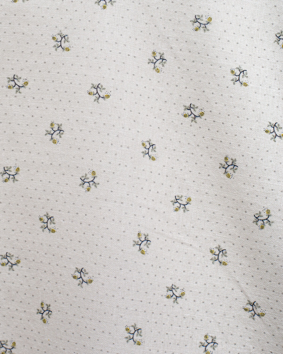 Te encantará este vestido lleno de detalles. Estampado en pequeñas florecitas de fresa en tono ocre y negro sobre fondo color crema, lleva detalles en negro en el cuello, las mangas y los bolsillos. Falda de doble volante para darle más movimiento al vestido. perfecto para nuestras teen, en un dia especial o para vestir más casual. Realizado en un delicado voile de algodón y forrado completamente en algodón.