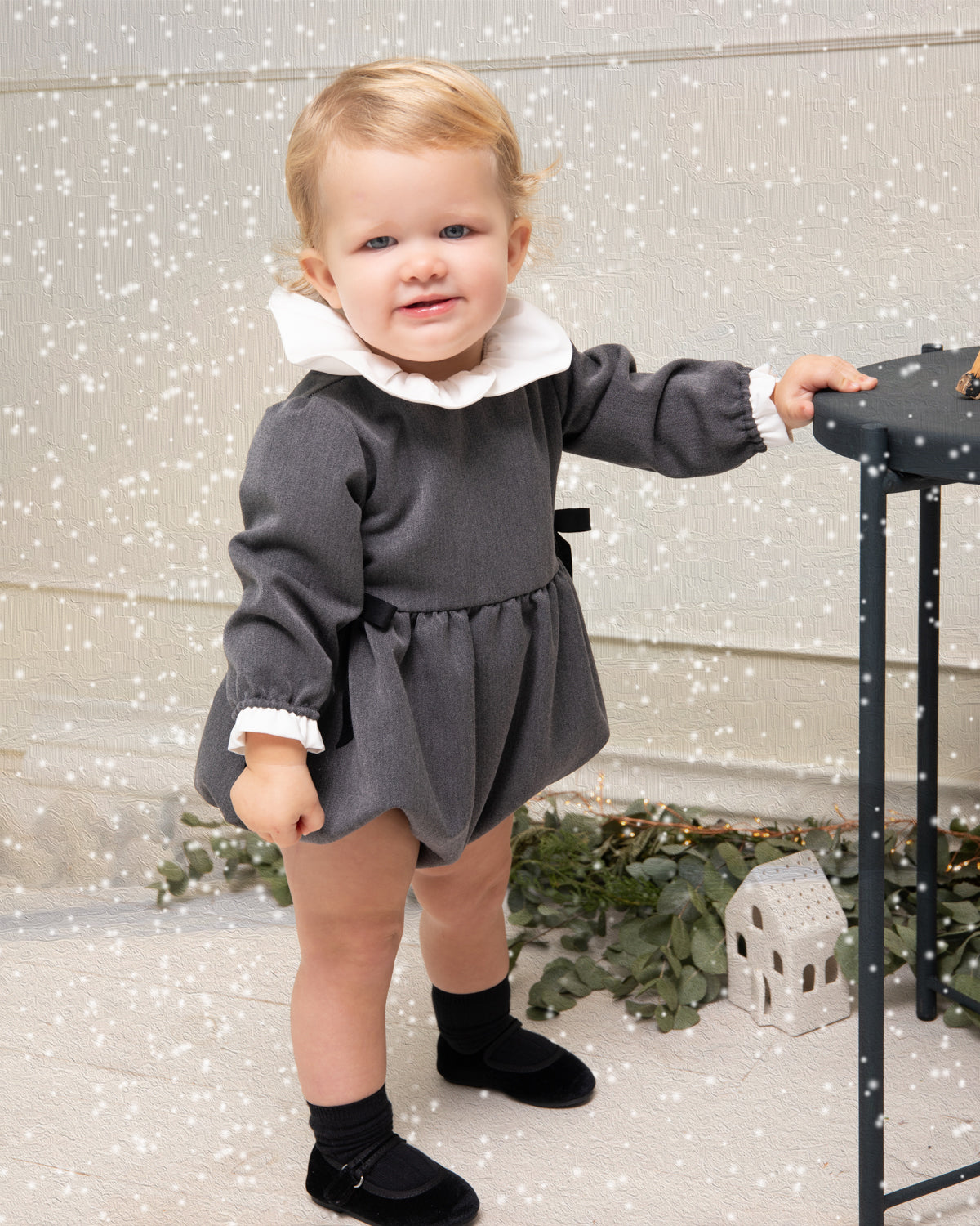 Nuestra ranita de bebe Petal es perfecta para una ocasion especial. Realizada en un tejido gris ocuro qte encantara el cuello de volante a contraste en blanco. La ranita lleva dos lazadas en negro en la cintura.