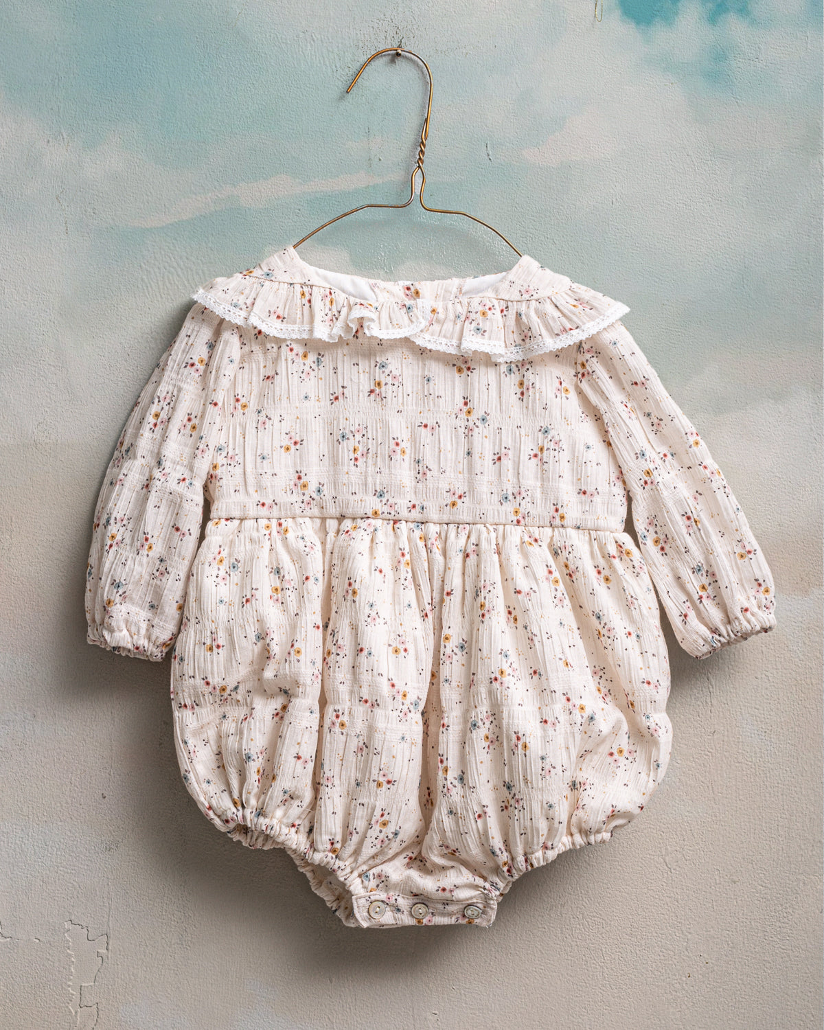 Una de nuestras ranas favoritas. Confeccionado en un suave tejido de algodón con efecto arrugado y estampado en florecitas rosas y azules. Te encantará el detalle de encaje en el volantito del cuello. Botones en la espalda y entre las piernas.